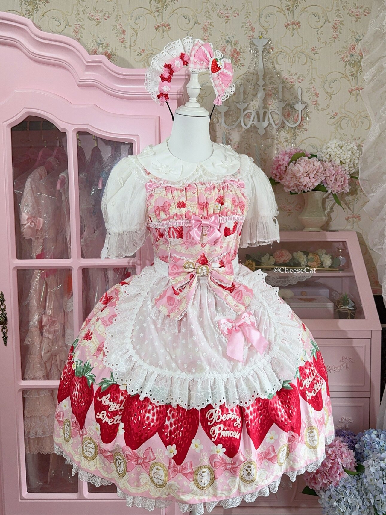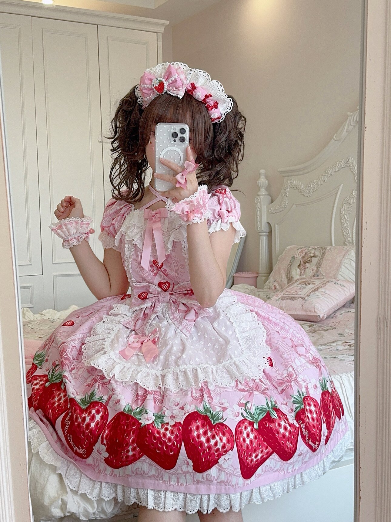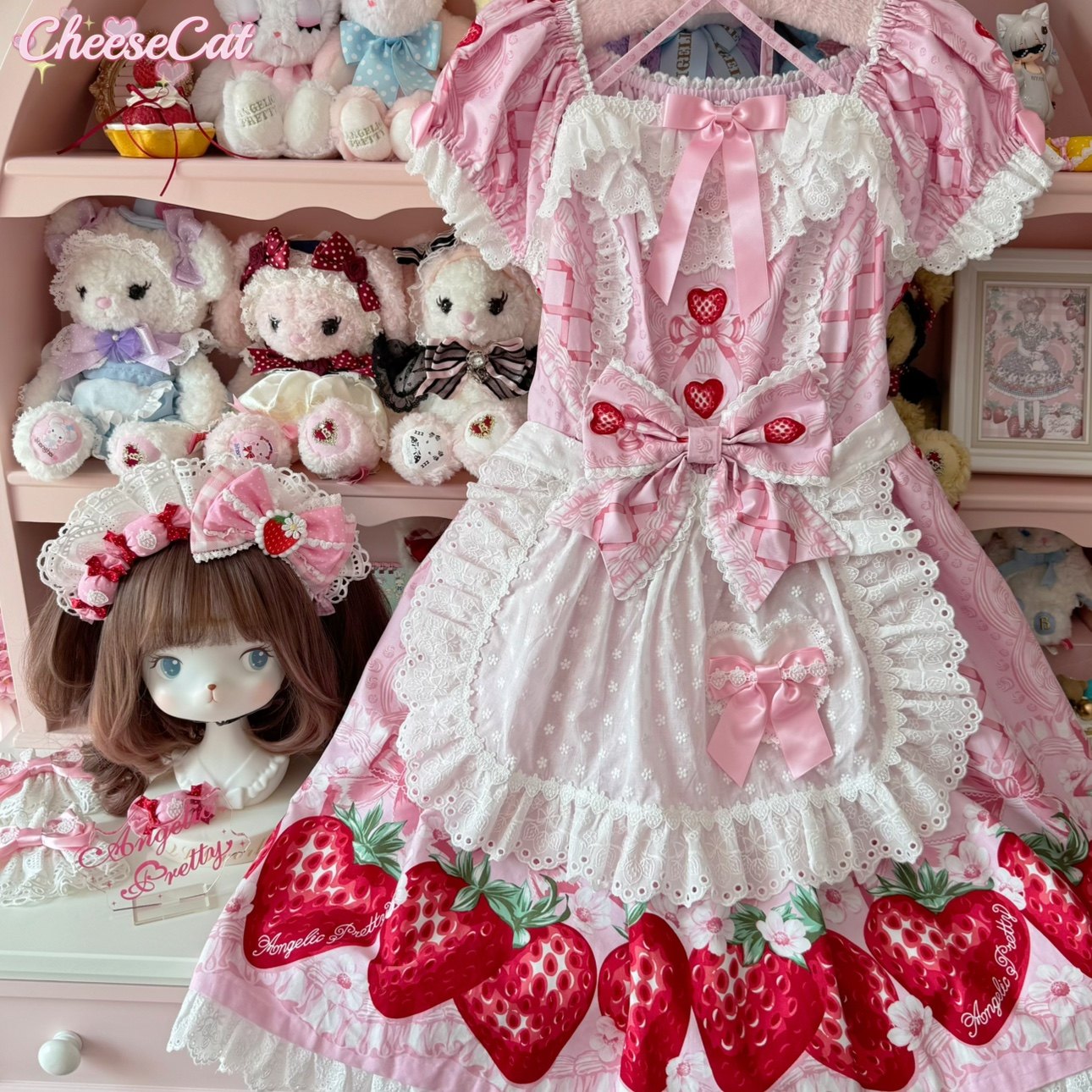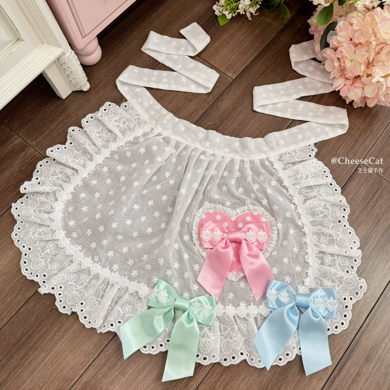 【芝士猫手作】超萌!新品草莓刺绣蕾丝蝴蝶结lolita小物棉布围裙 [Original Page Link]