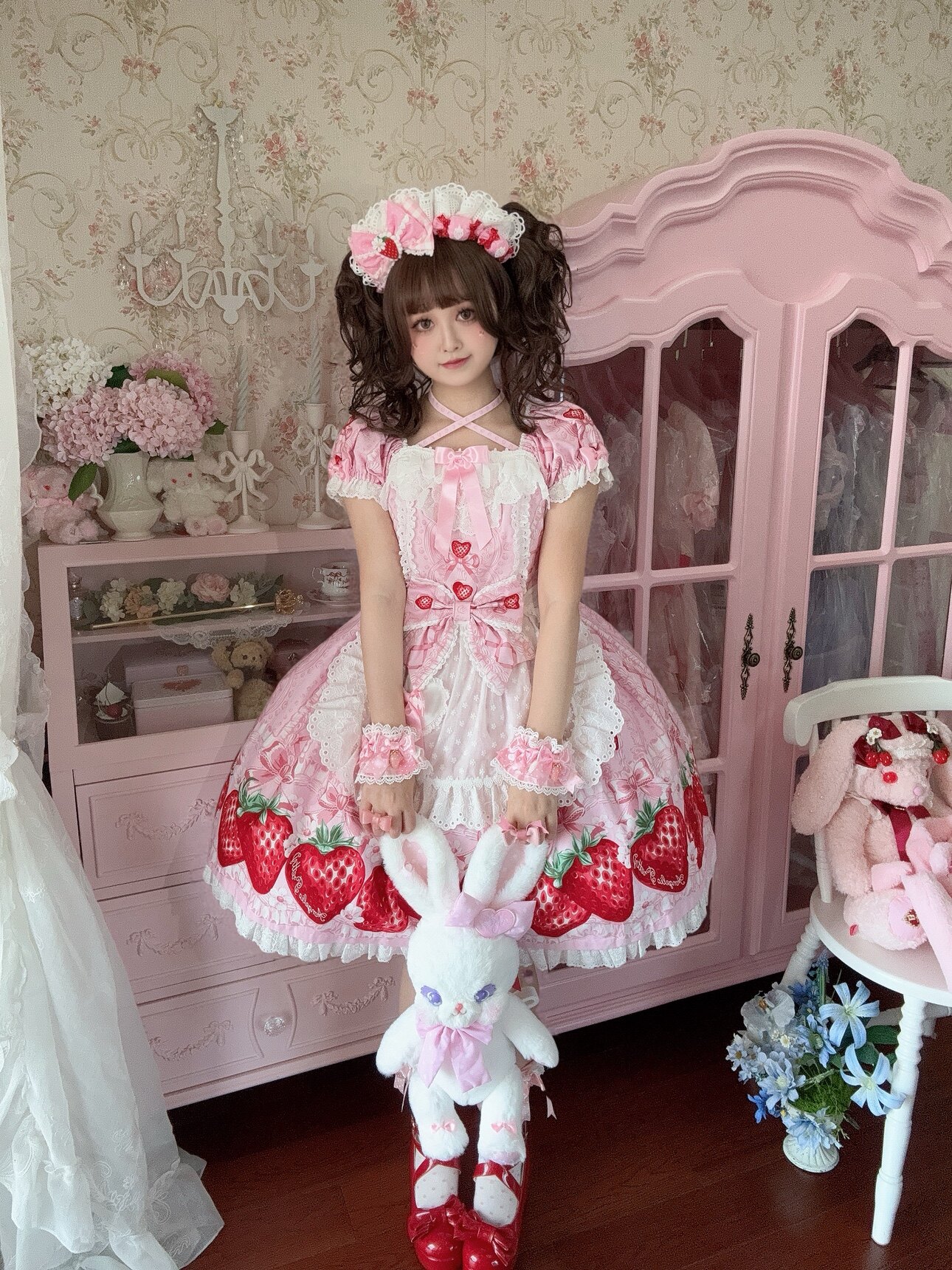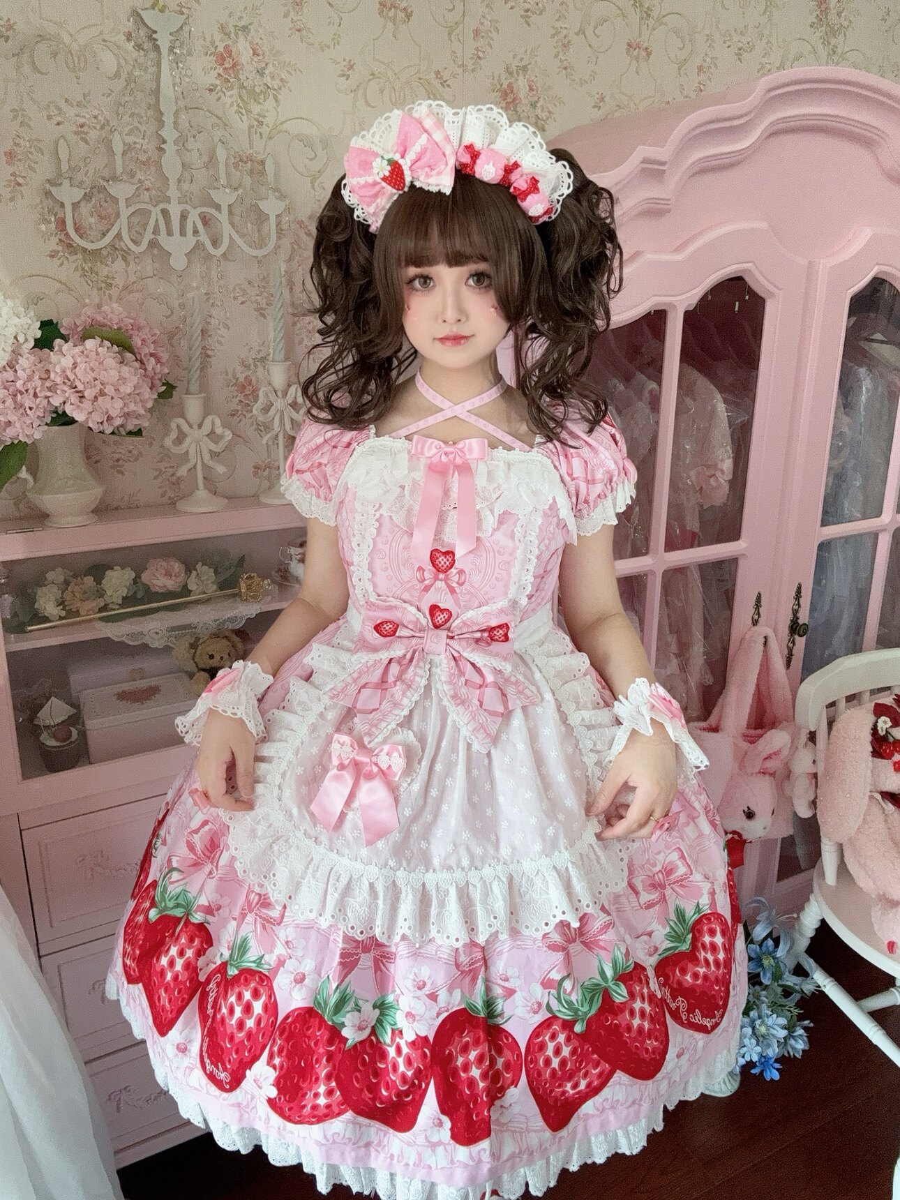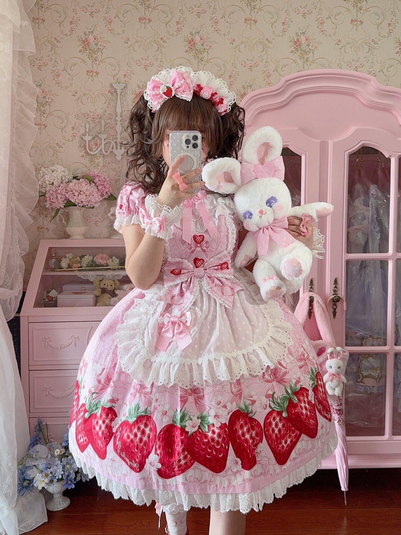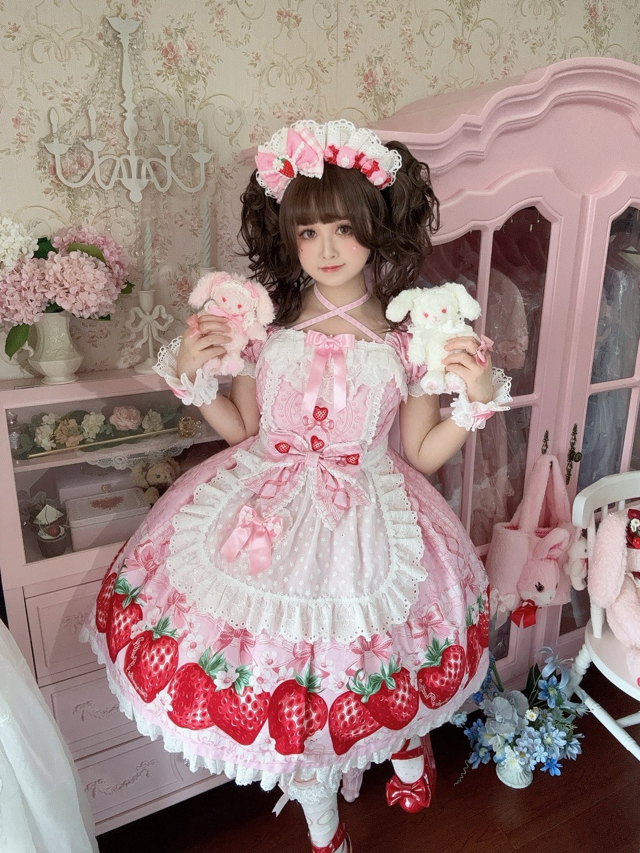 【芝士猫手作】超萌!新品草莓刺绣蕾丝蝴蝶结lolita小物棉布围裙 [Original Page Link]