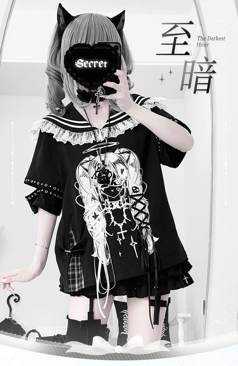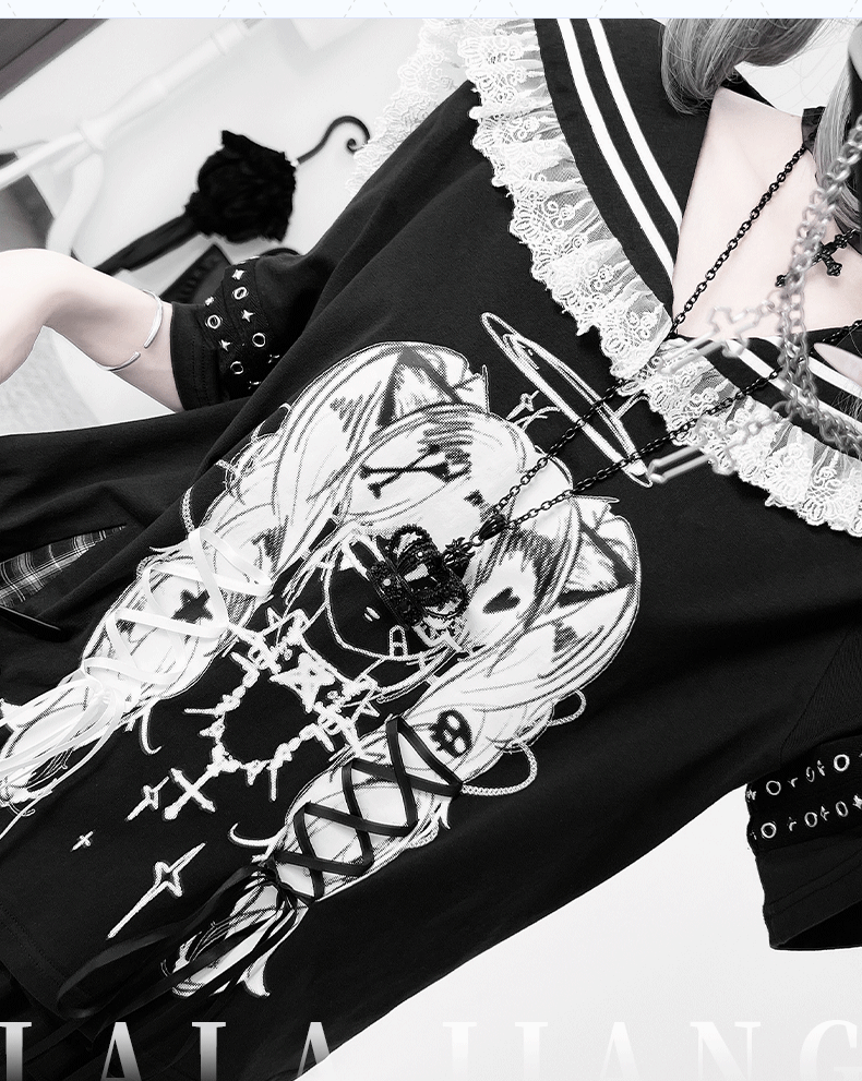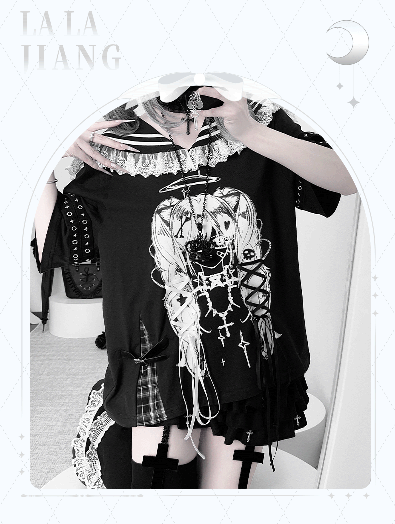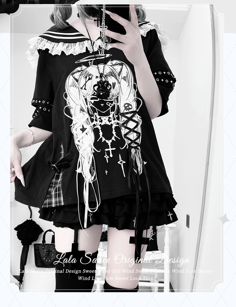 啦啦酱 至暗 原创设计亚文化印花海军领绑带上衣少女甜酷穿搭套装 [Original Page Link]