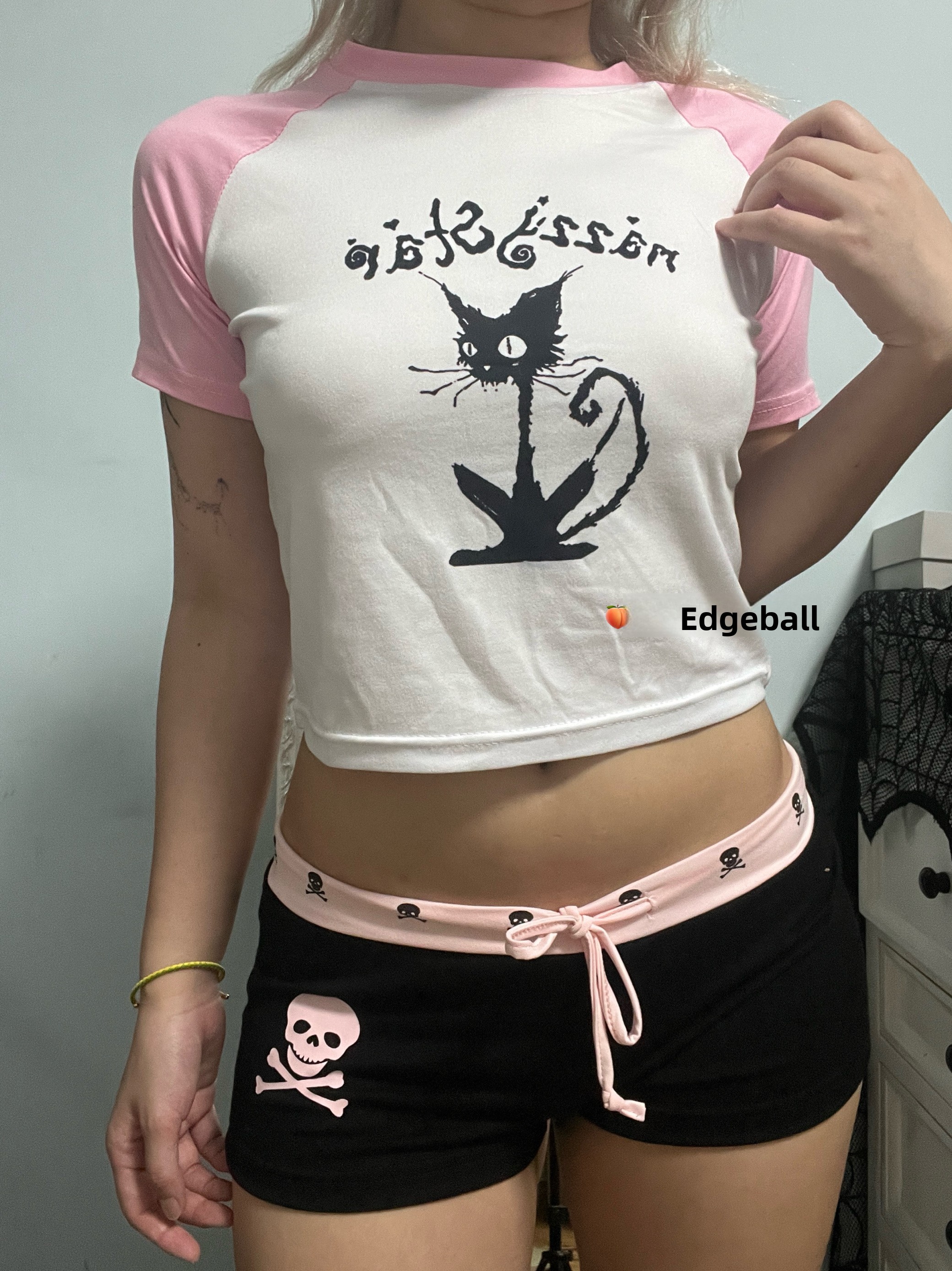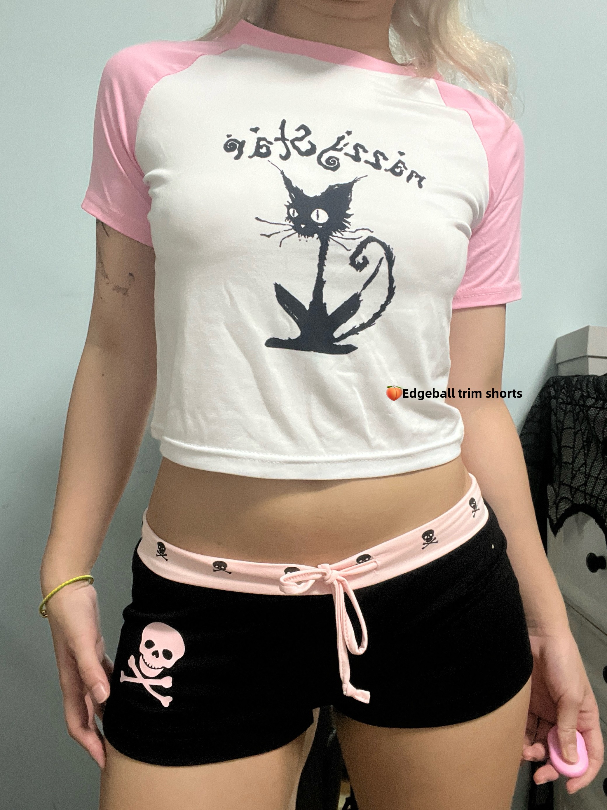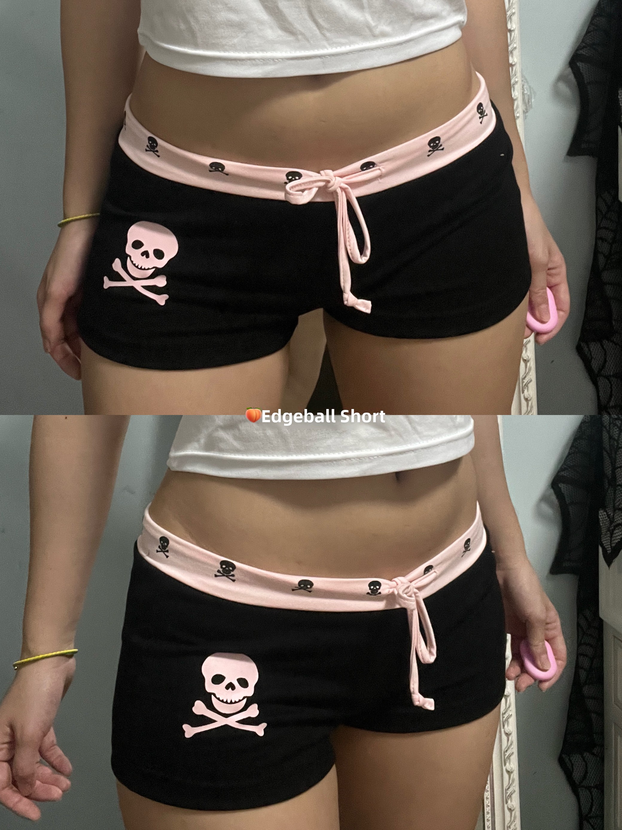 粉色骷髅^超短裤|亚文化y2k朋克印花绑带修身休闲运动裤edgeball [Original Page Link]
