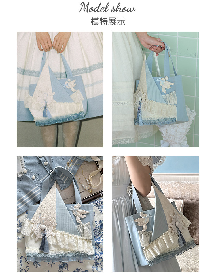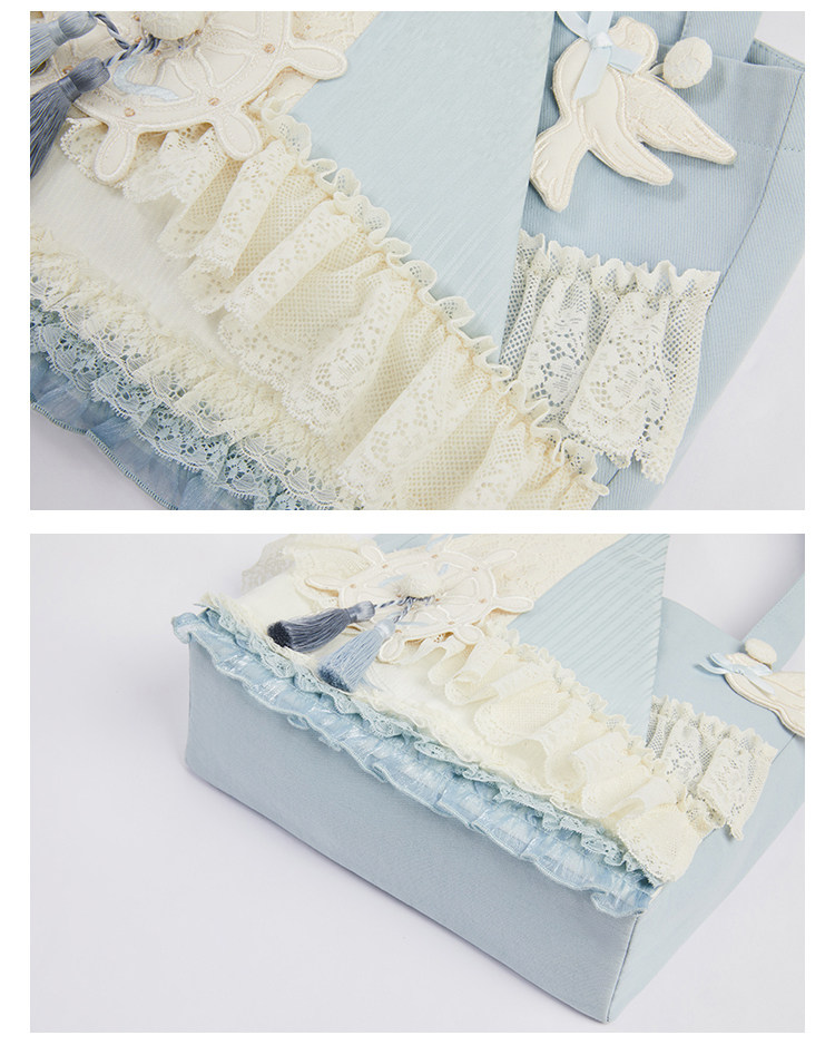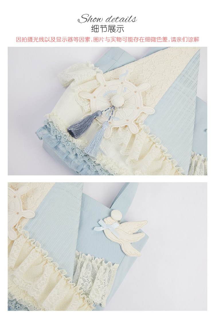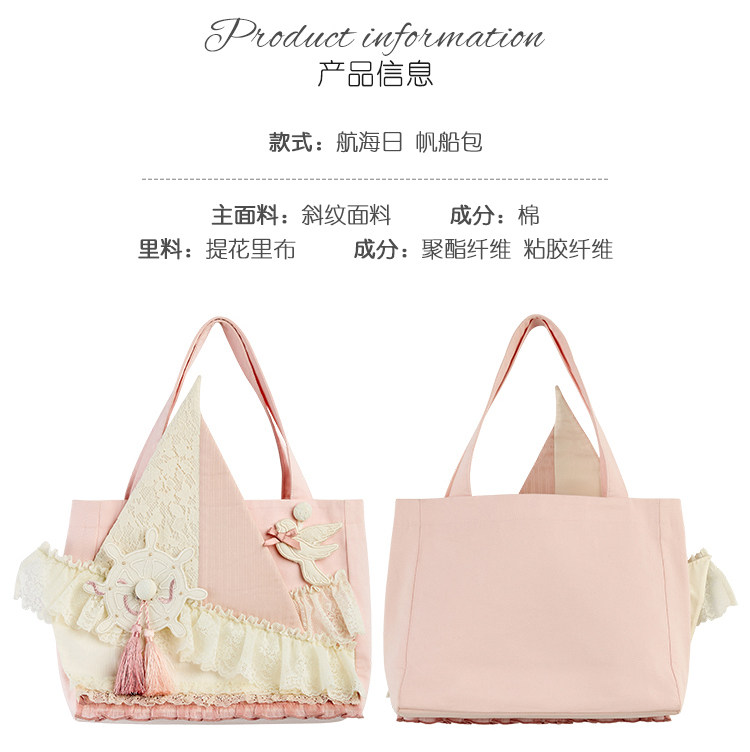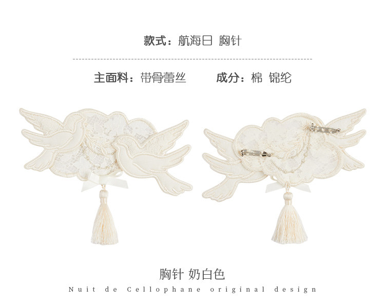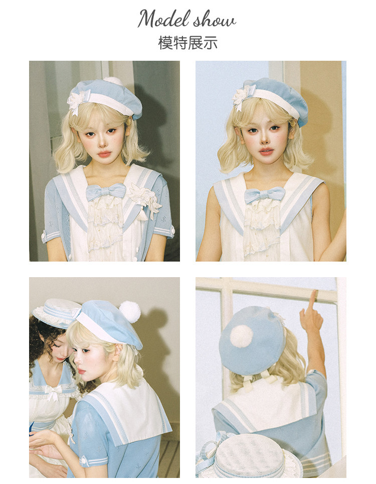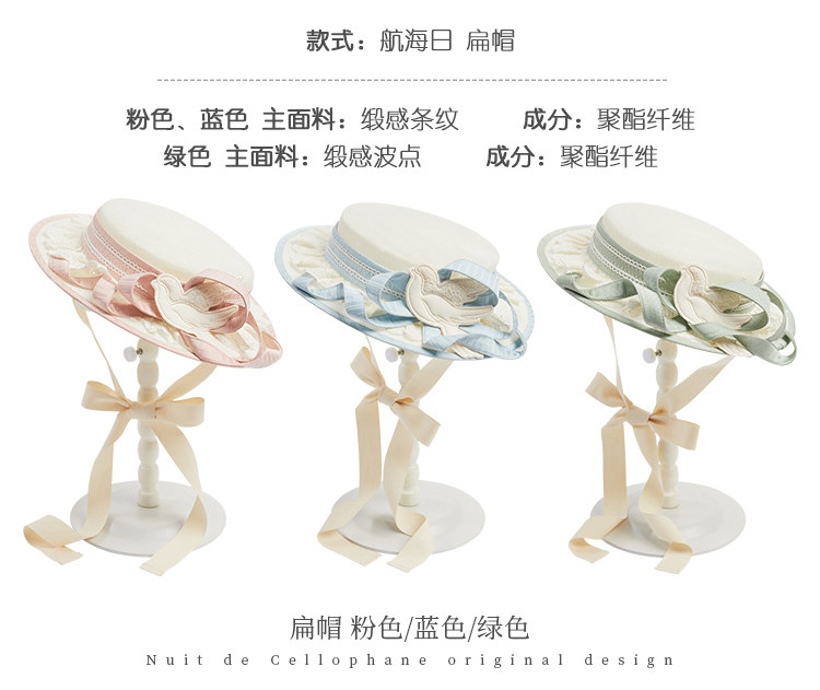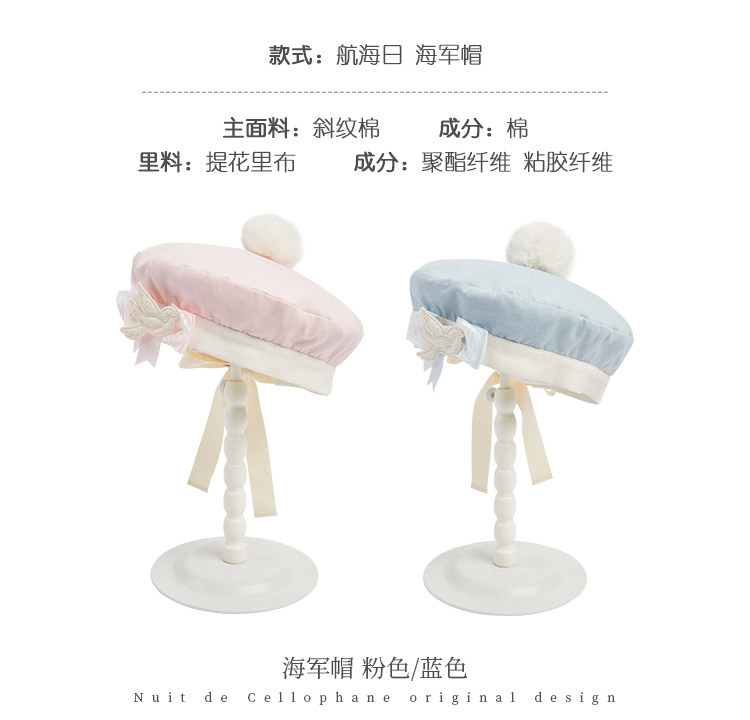 The current Cellophane Night Nautical Day series features a sailboat bag, a flat cap, a navy cap, a clip-on brooch, and Lolita accessories.
