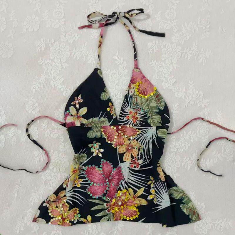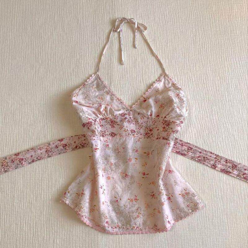 Tank tops2025年夏季新款花朵印花V领法式覆古绑带挂脖吊带上衣女 [Original Page Link]