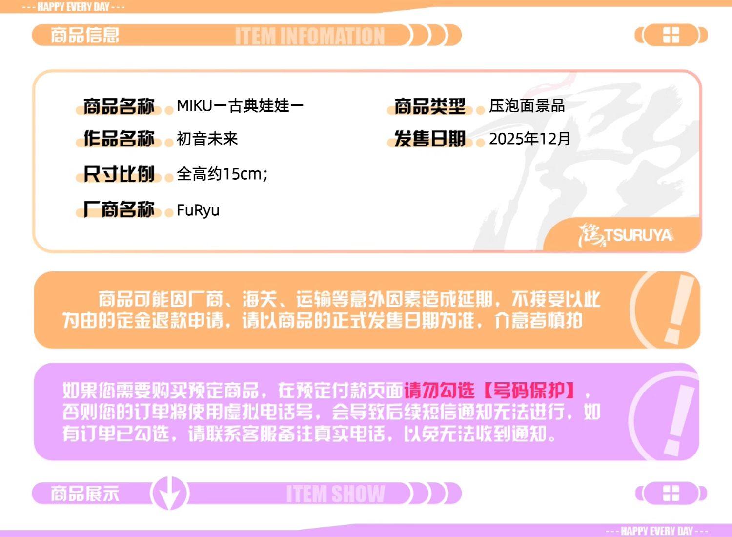 鹤屋通贩 FuRyu 初音未来 MIKU 古典娃娃 压泡面 面景品 预定 [Original Page Link]