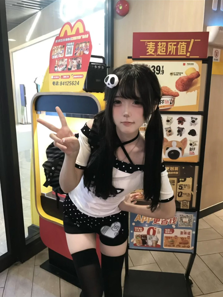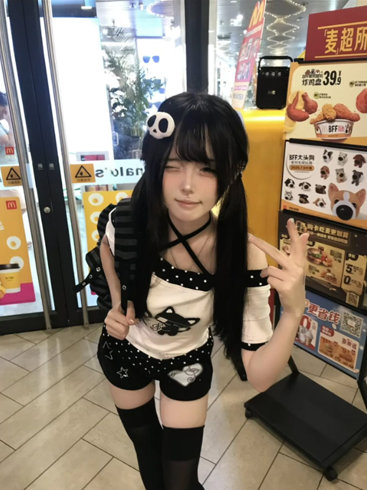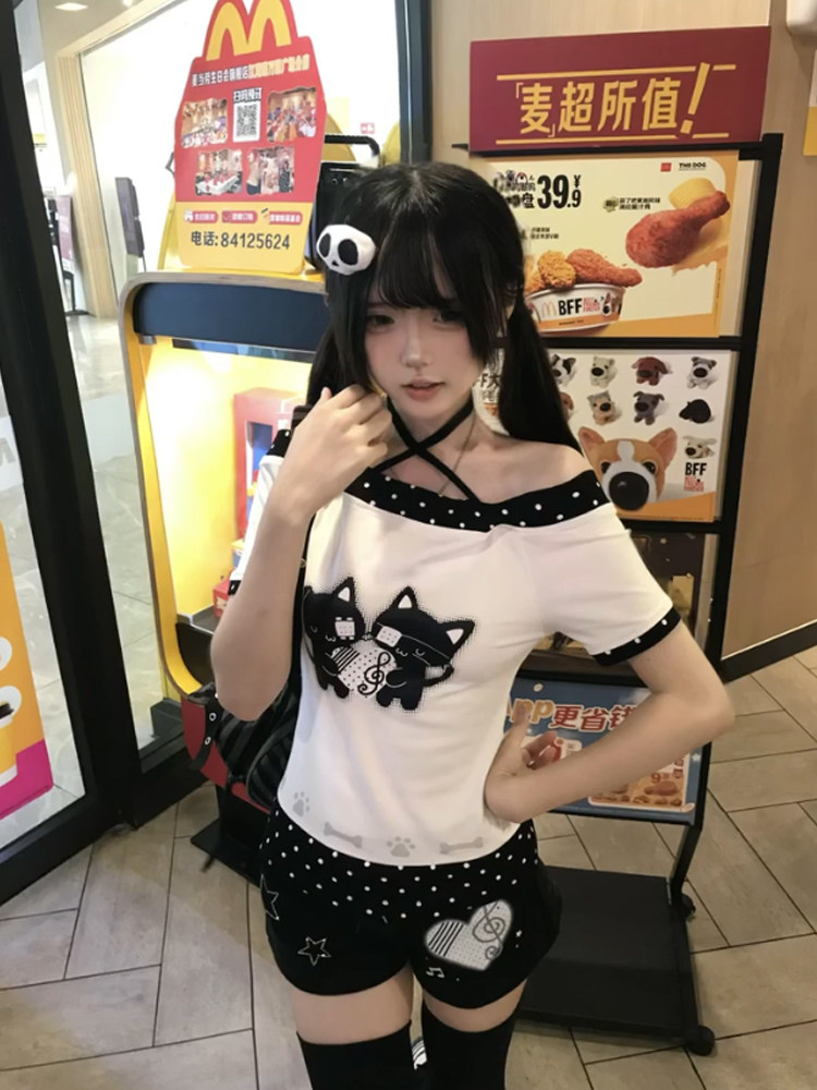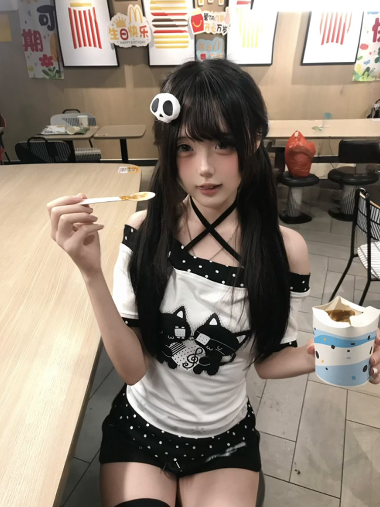 日系宅萌小猫波点一字肩短袖t恤女夏季拼接撞色覆古辣妹露肩上衣 [Original Page Link]