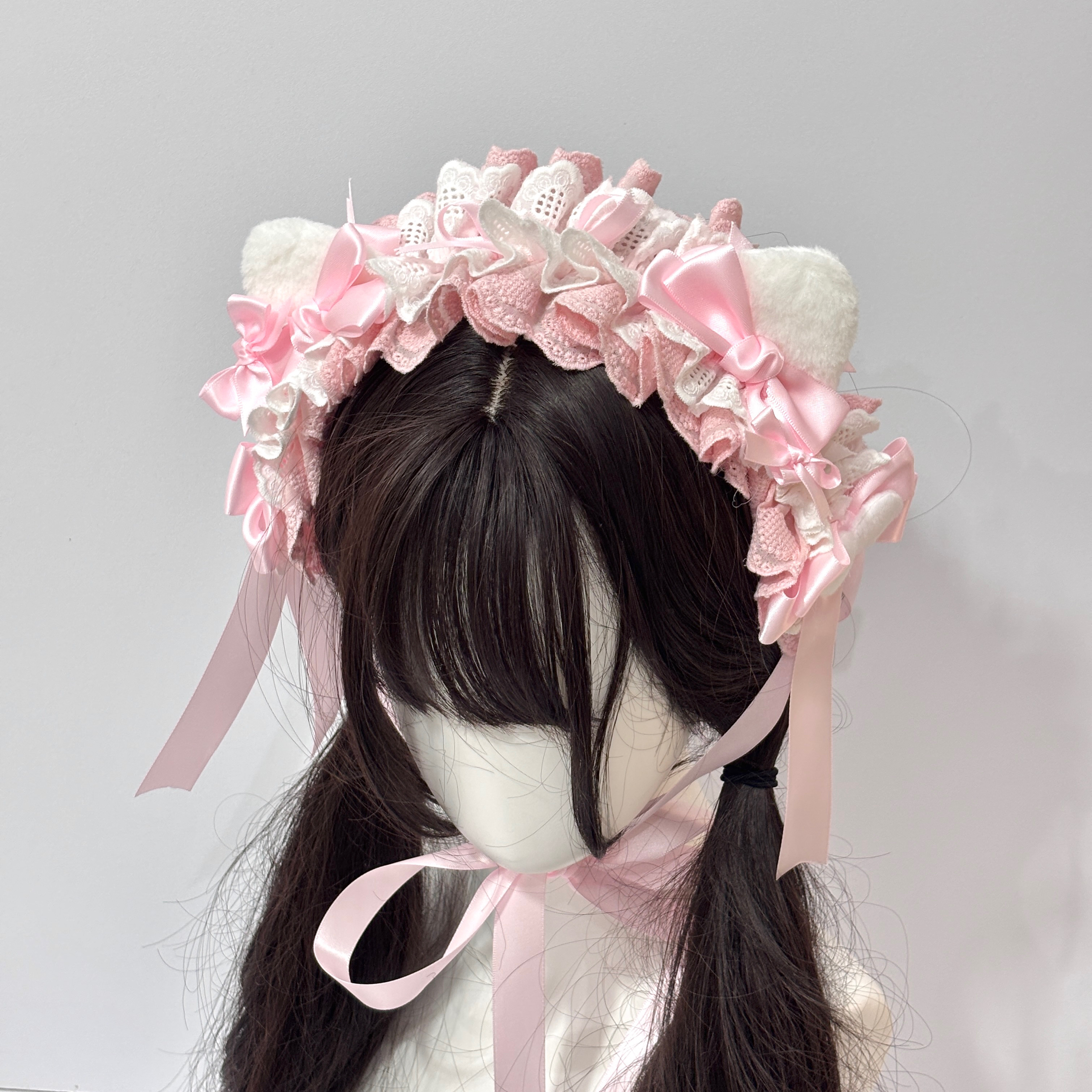 A cat tart's original handmade multi-colored cat ear Lolita headband with bow, a versatile hair accessory for girls.