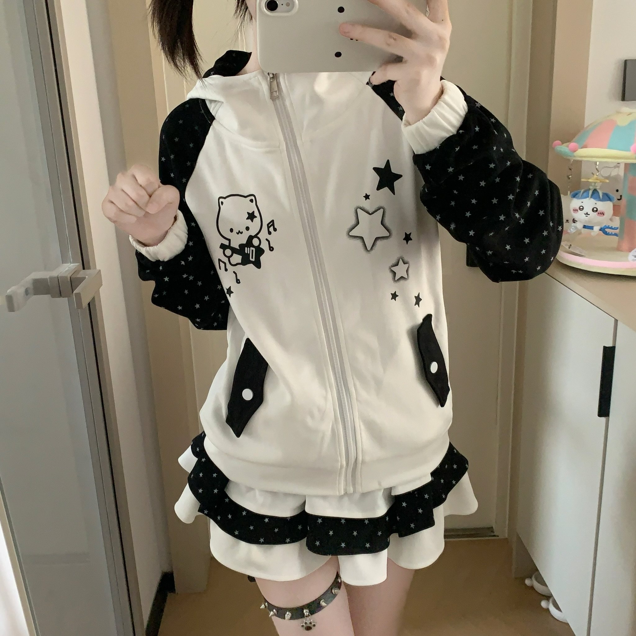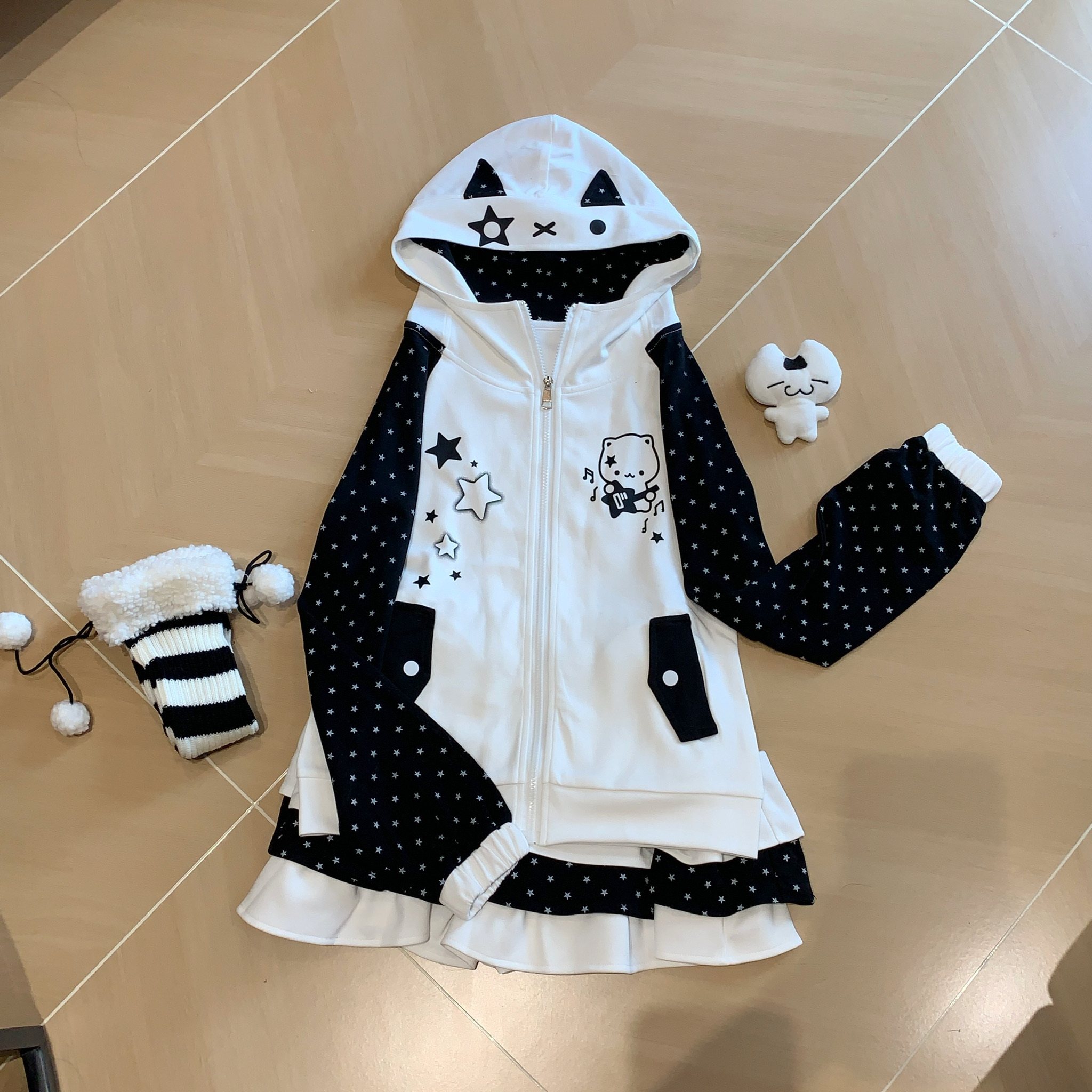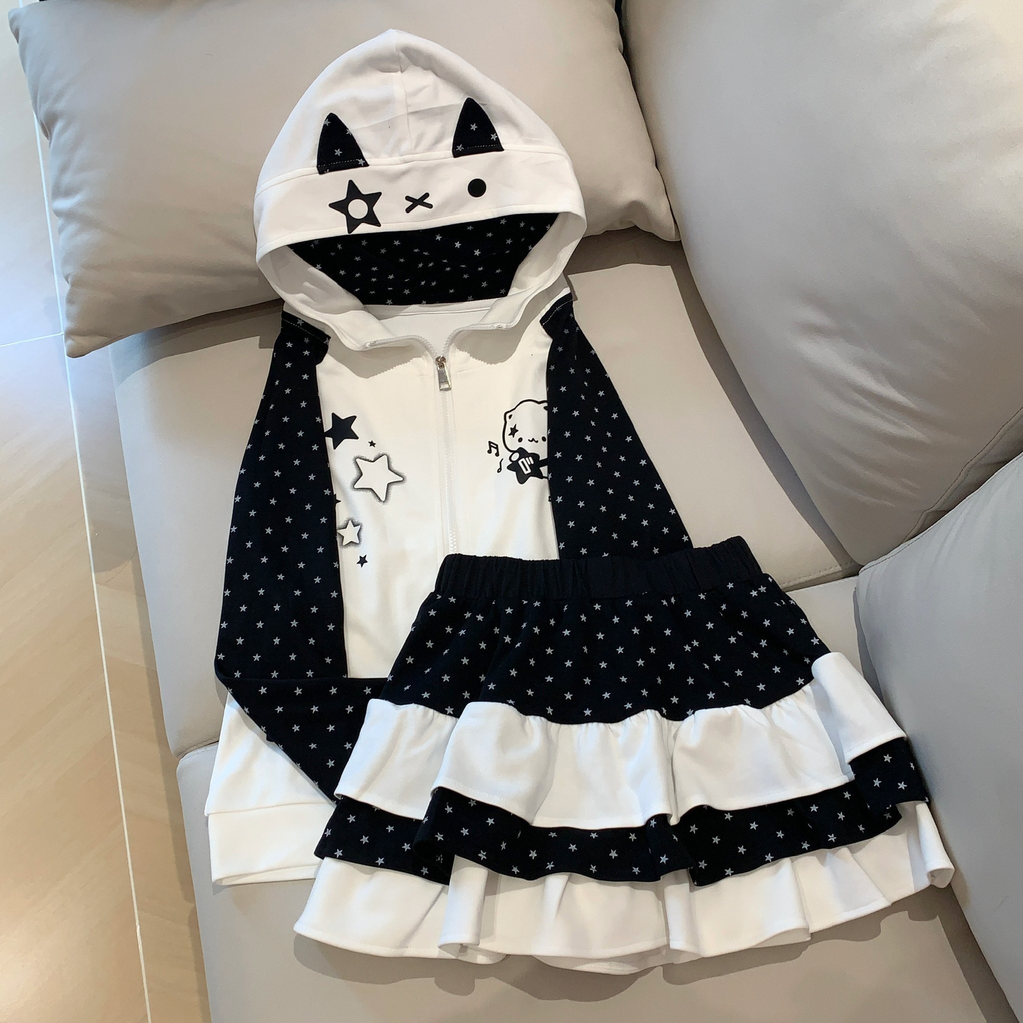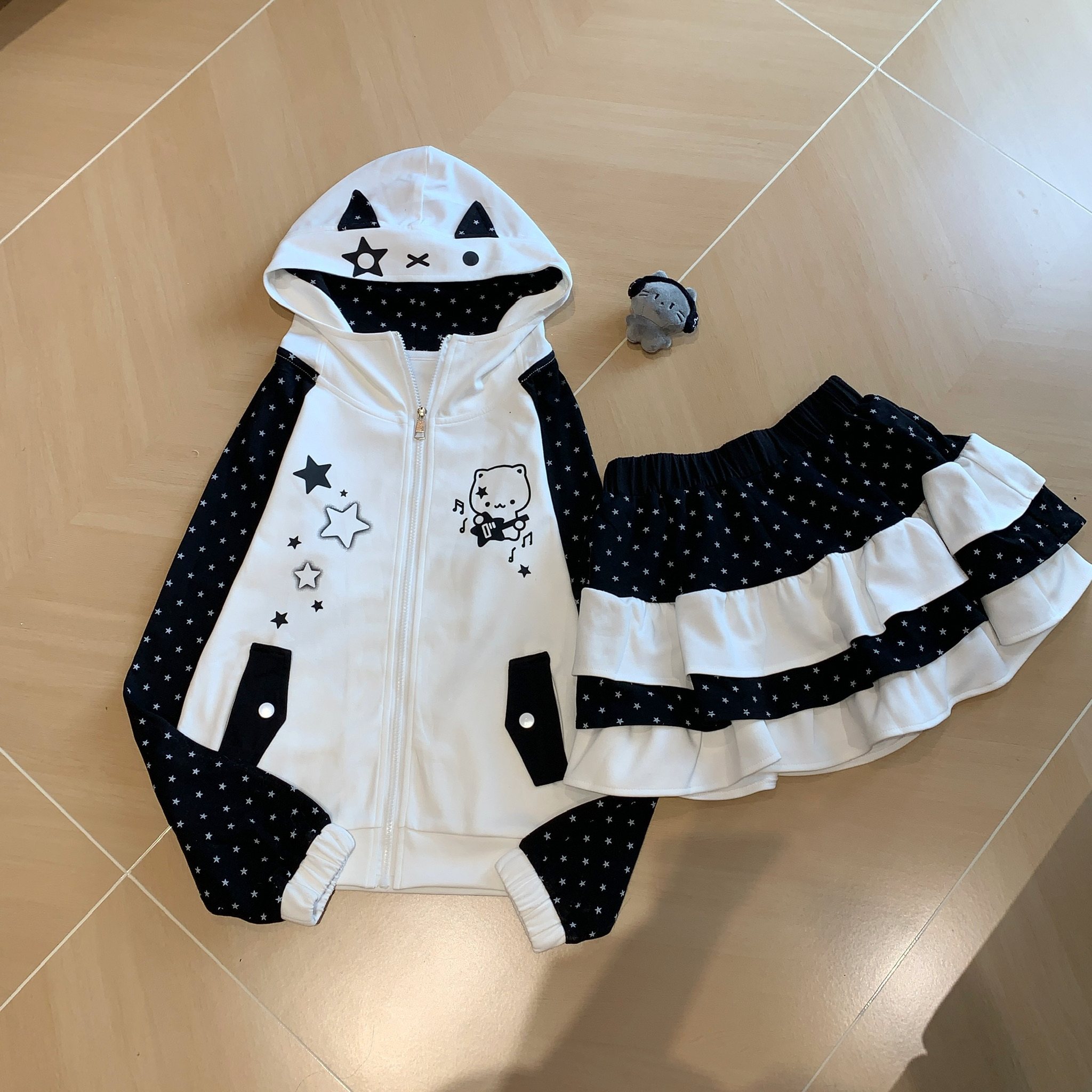 Qiuqiu's homemade autumn new color-blocked star and cat ear print slim-fit hooded long-sleeved jacket/cake skirt