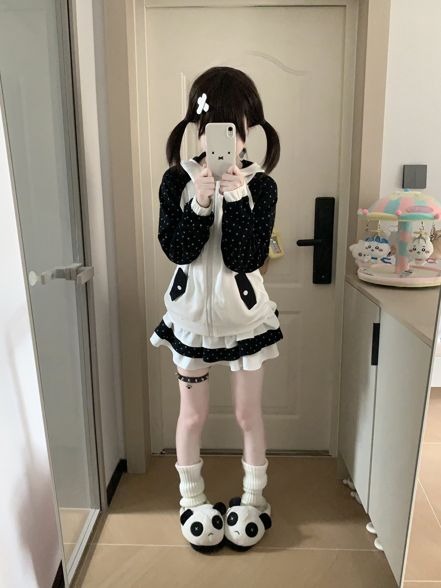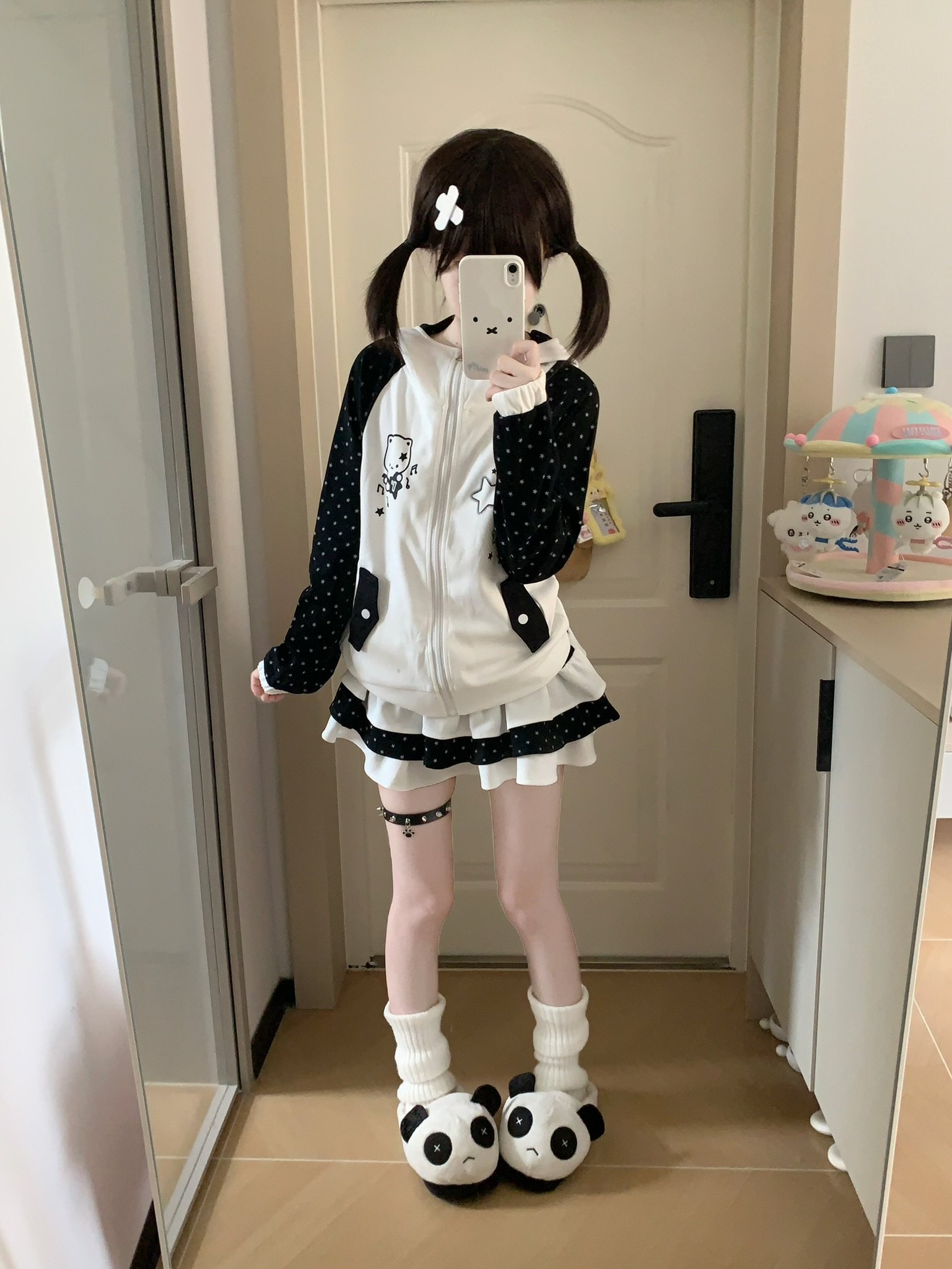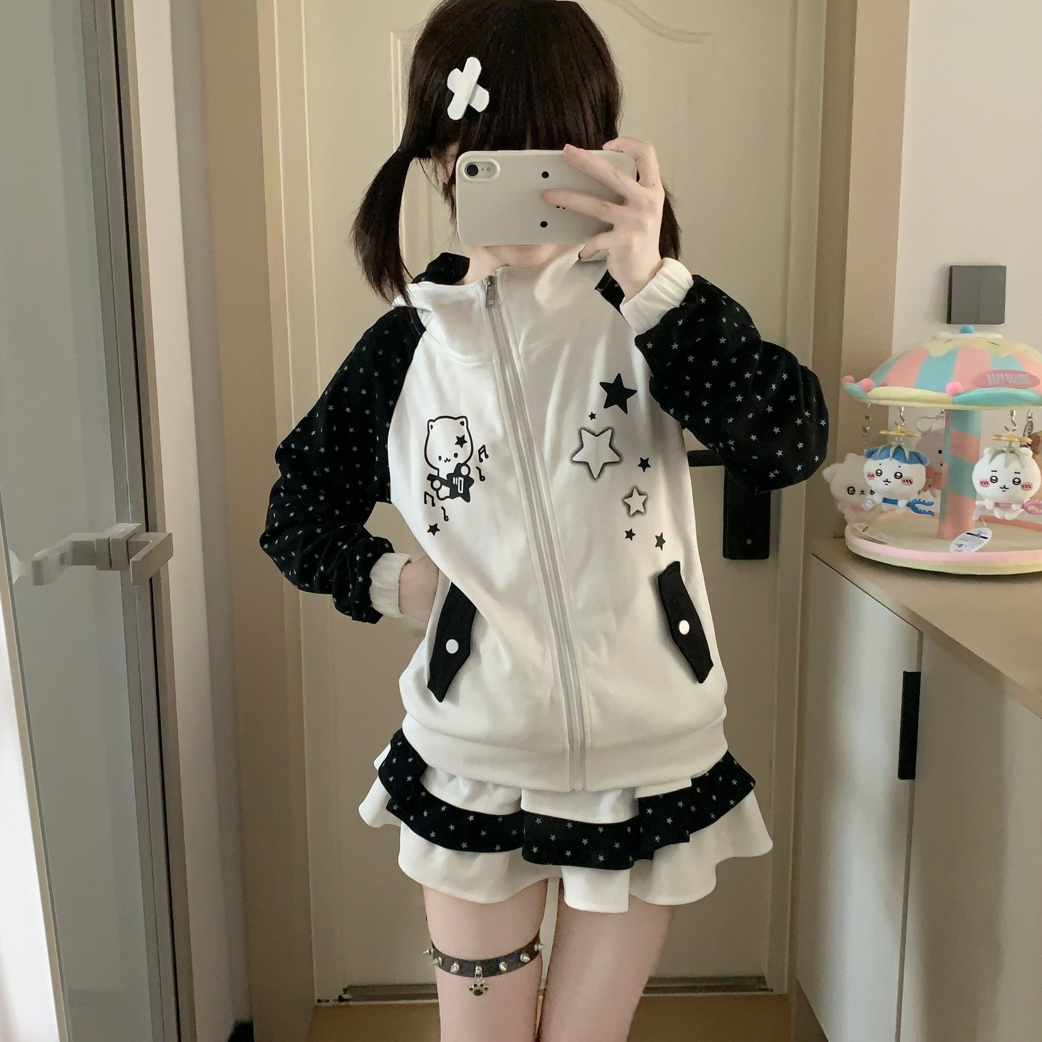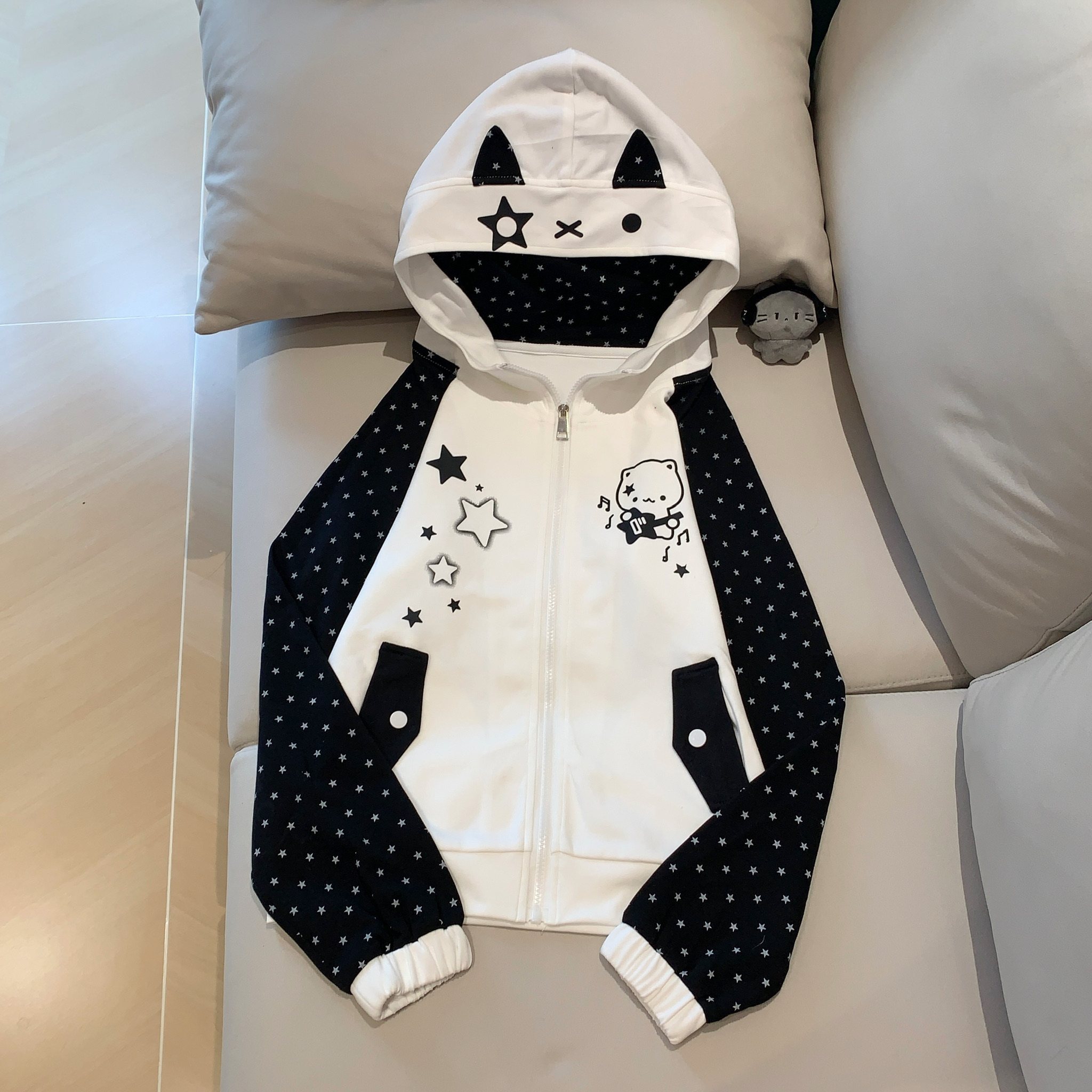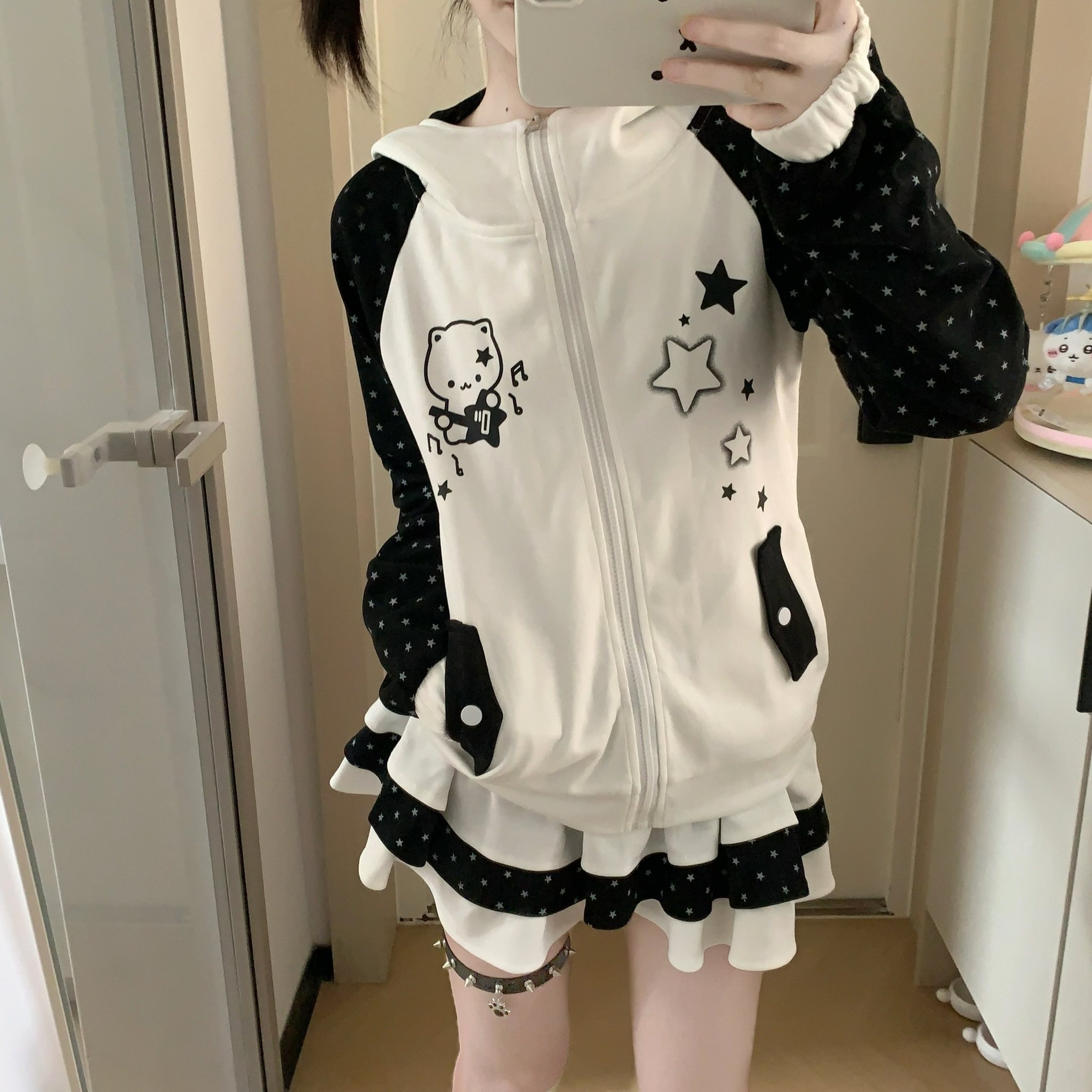 Qiuqiu's homemade autumn new color-blocked star and cat ear print slim-fit hooded long-sleeved jacket/cake skirt