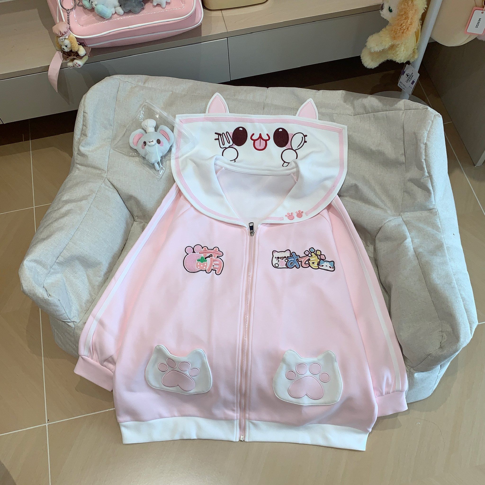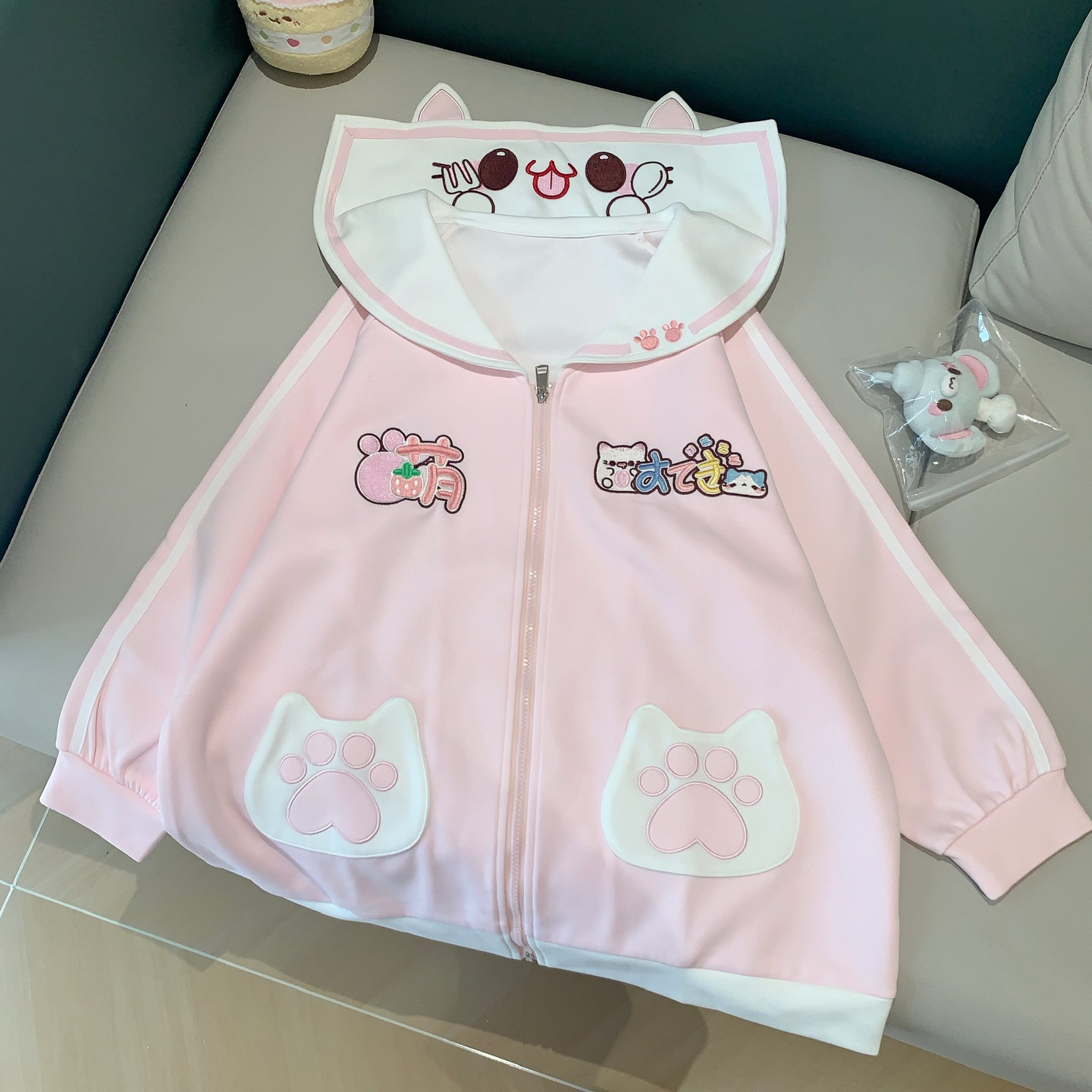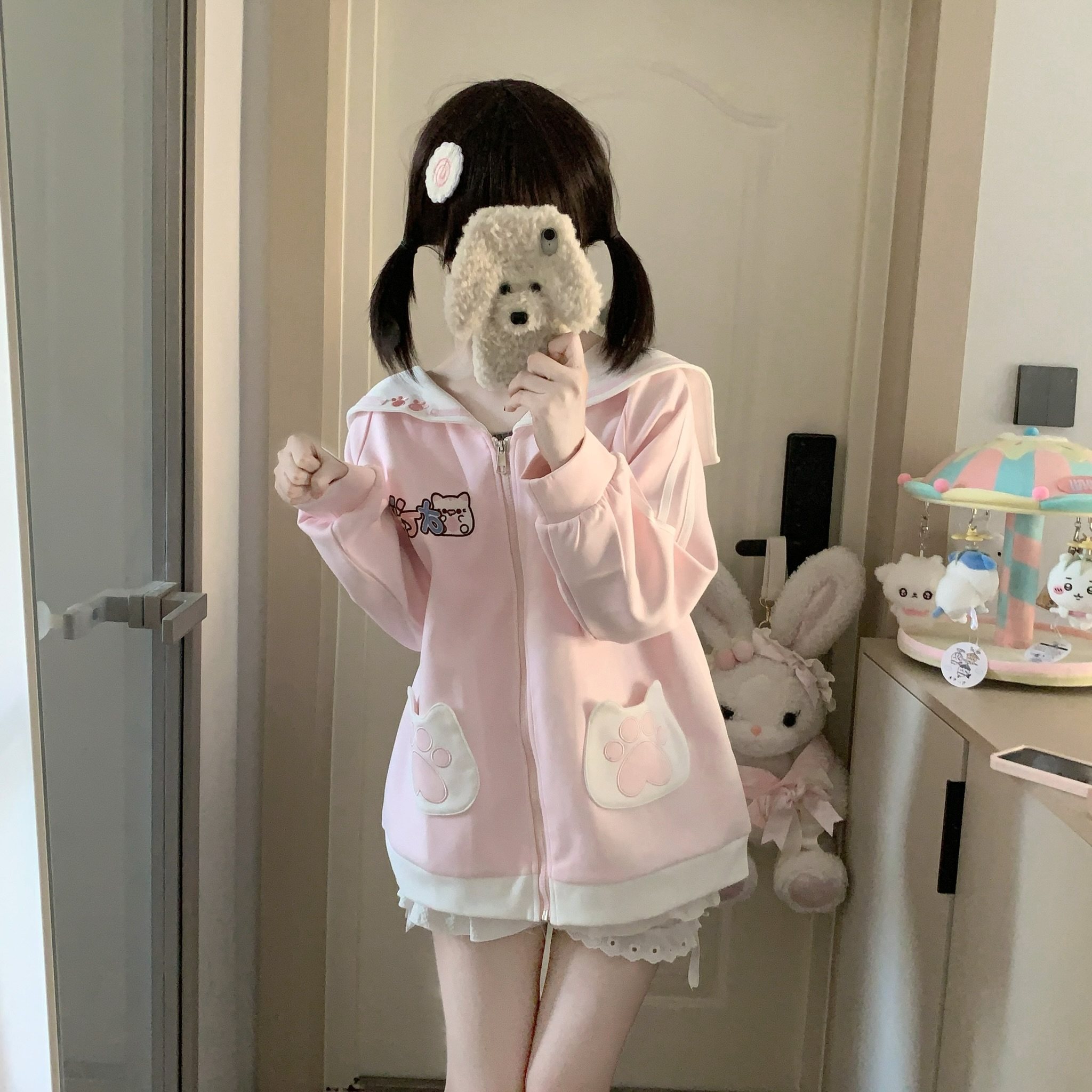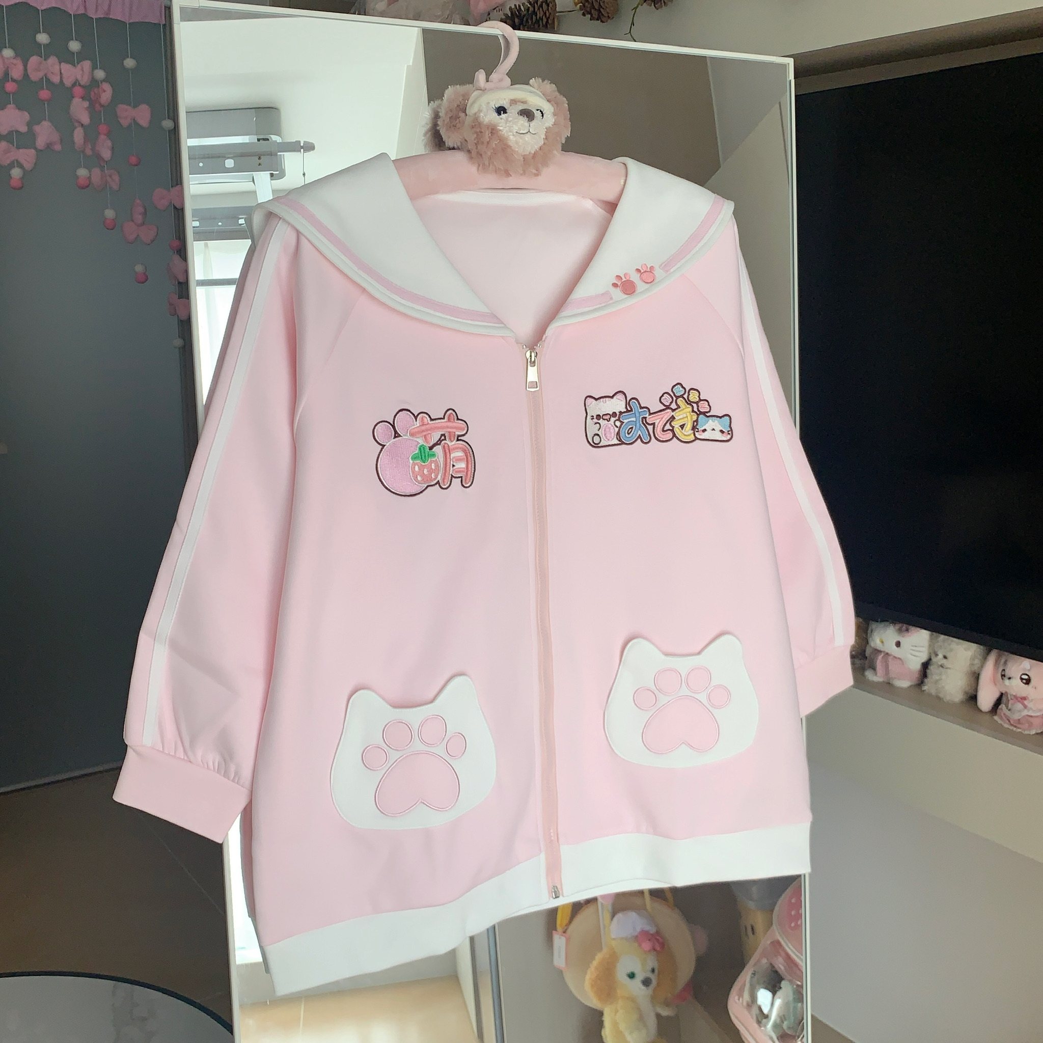 邱邱自制软妹可爱拼色小猫刺绣海军领拉炼长袖外套 [Original Page Link]