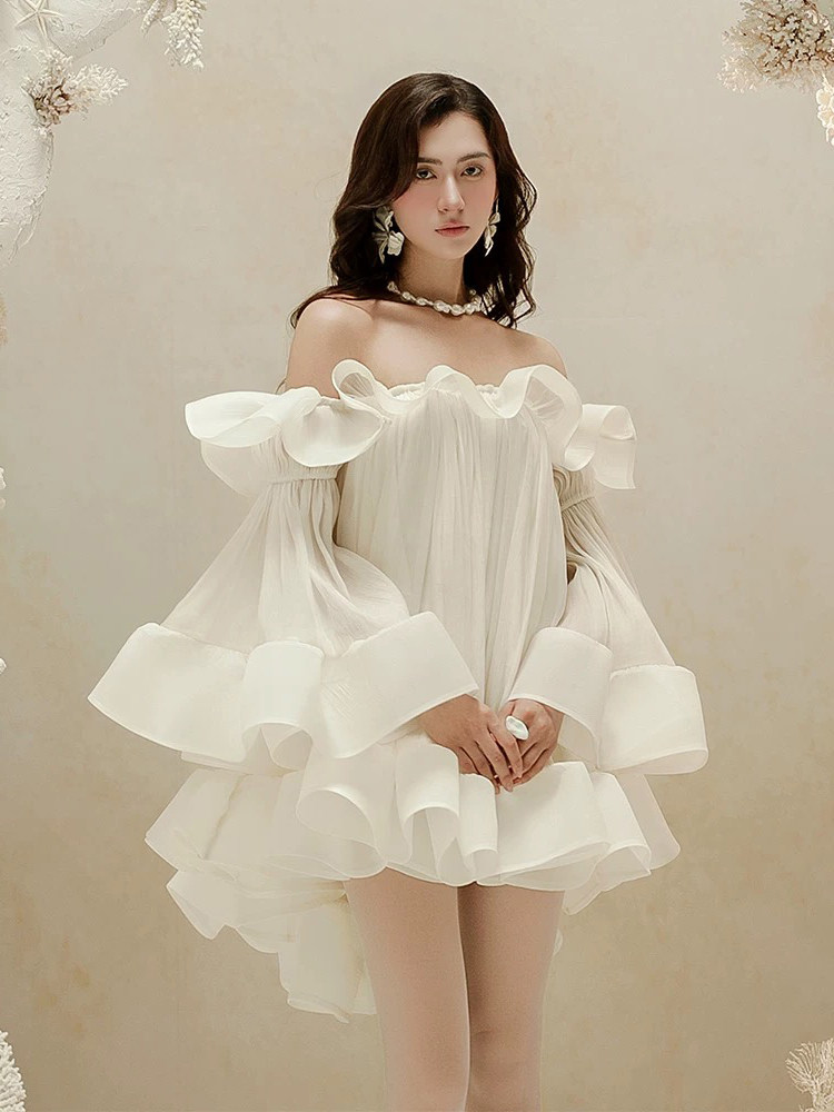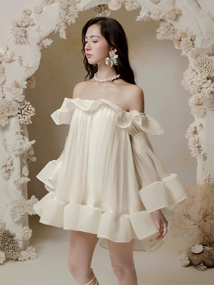 French-style off-shoulder ruffle dress, new summer style for petite women, loose and flared skirt.