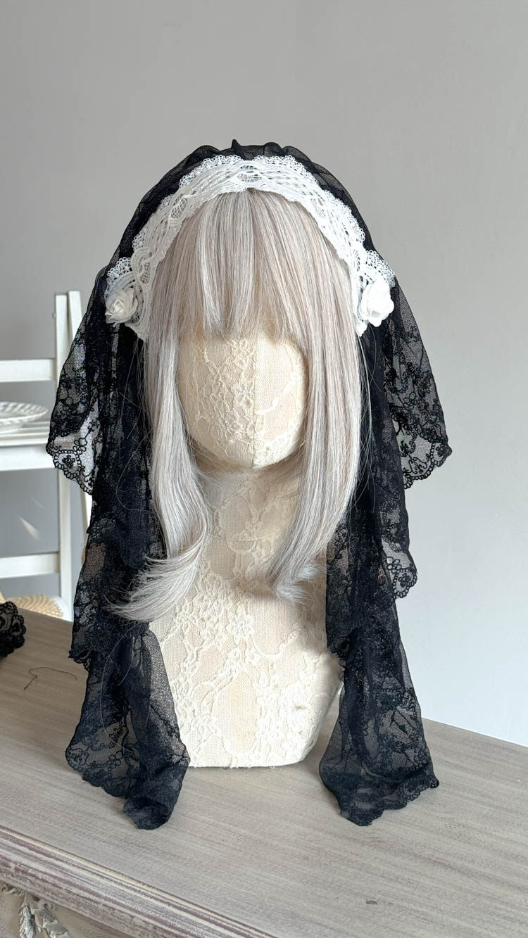 Original design black and white nun Lolita headband, gothic lace mesh headdress, subculture headscarf