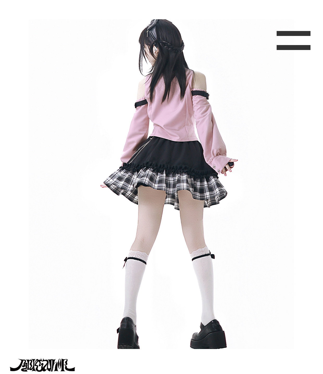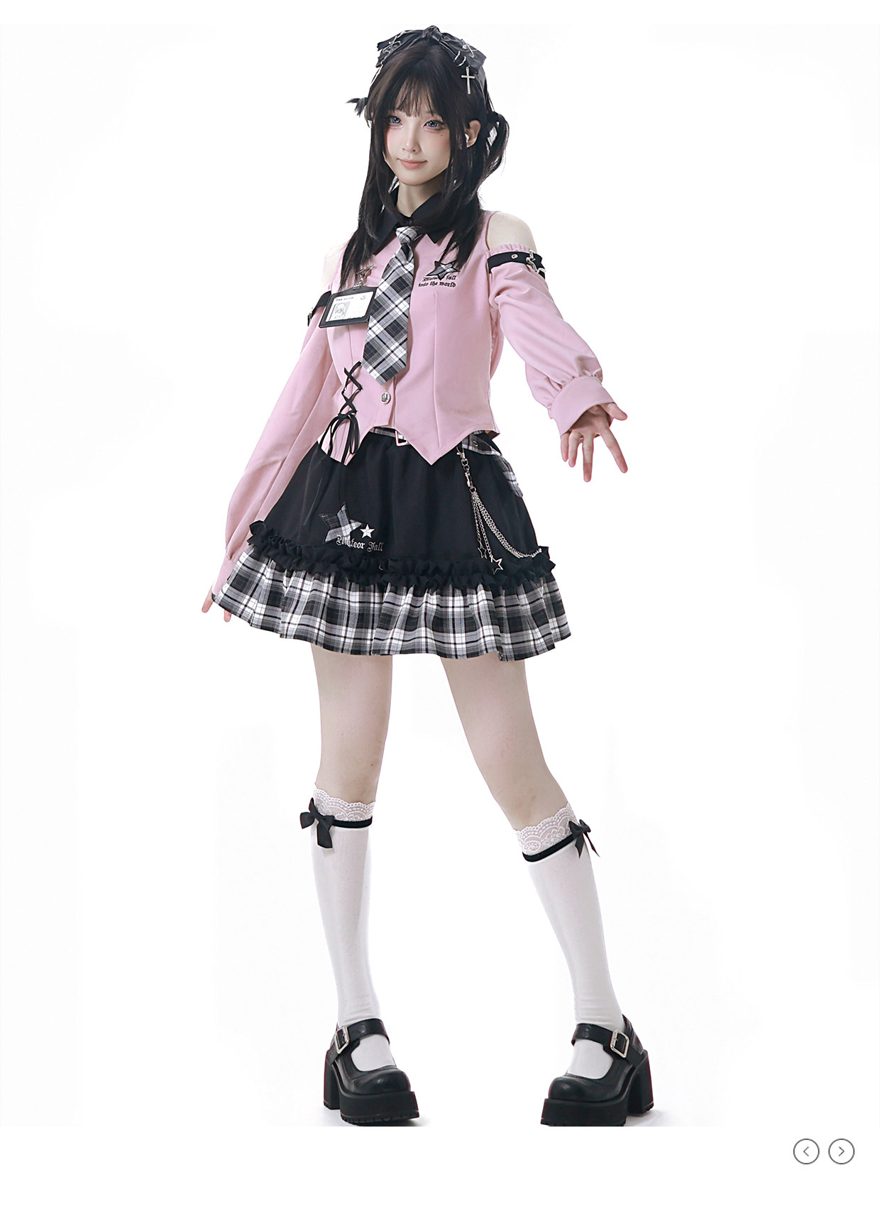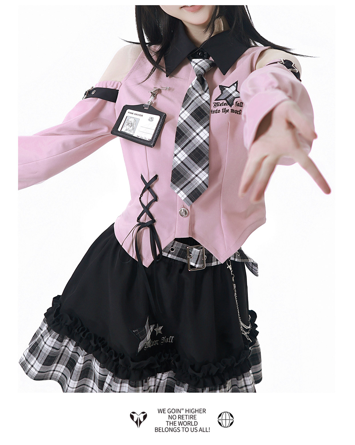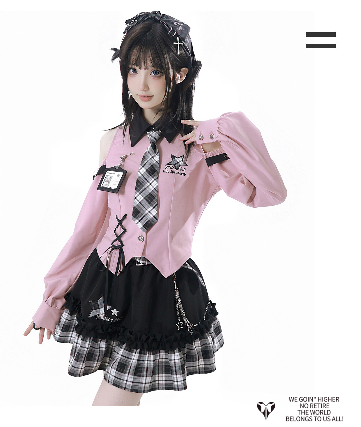 pinksavior【星辰闪耀】露肩粉黑早秋衬衫半裙设计感显瘦套装 [Original Page Link]