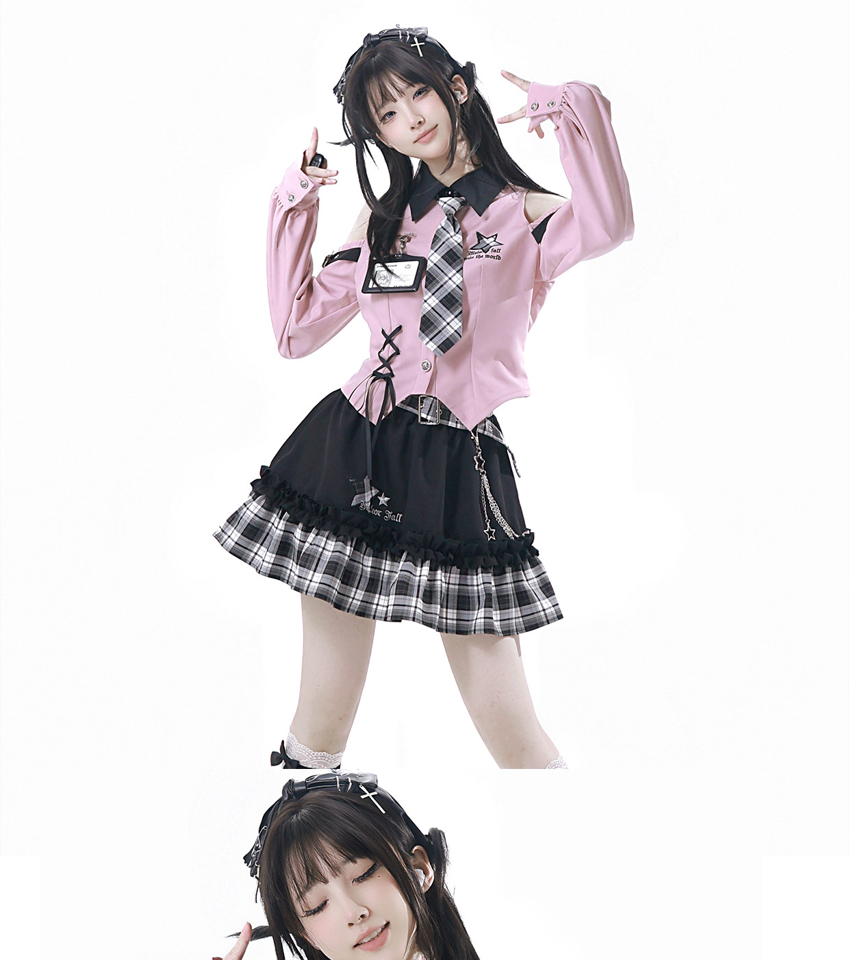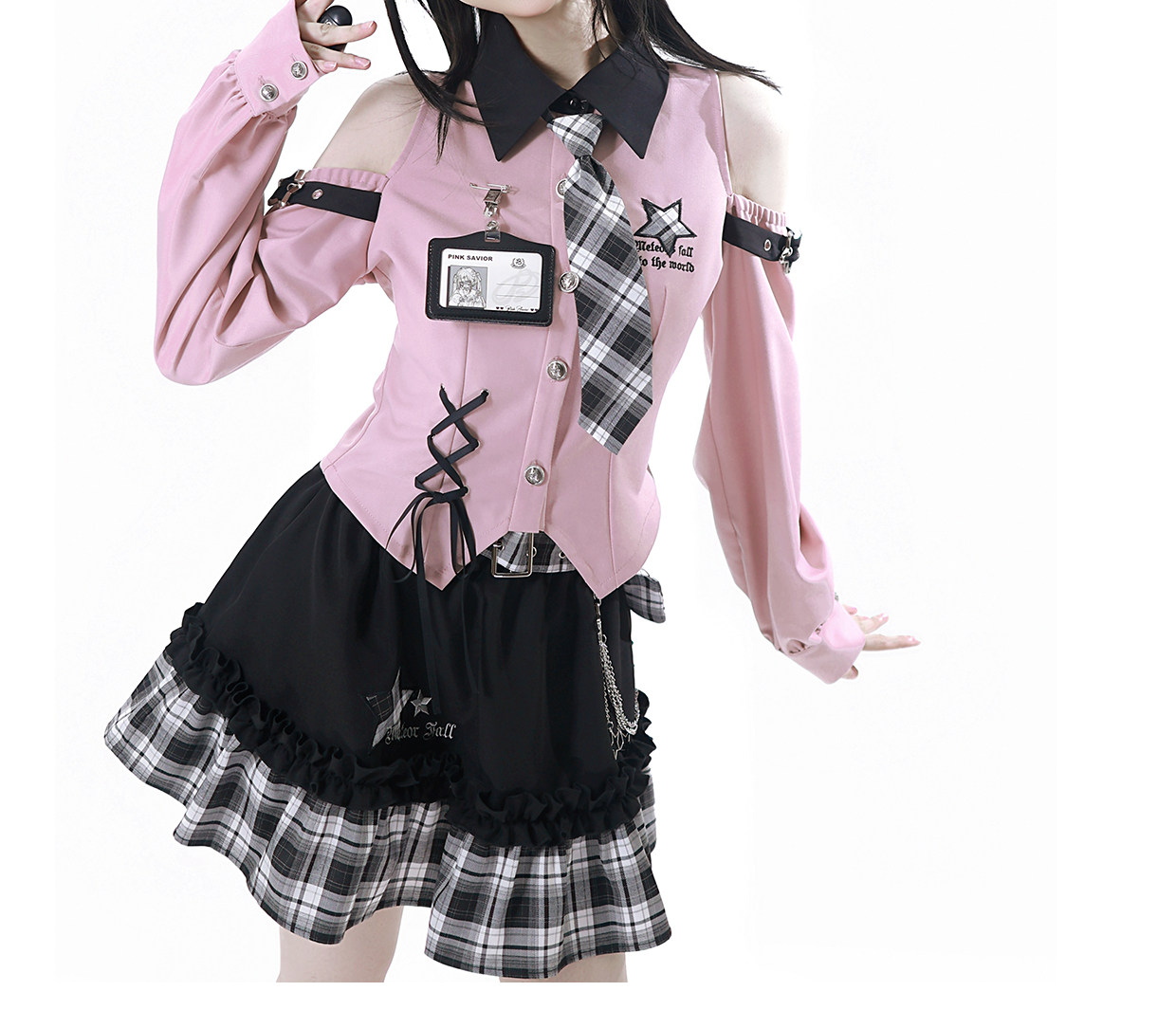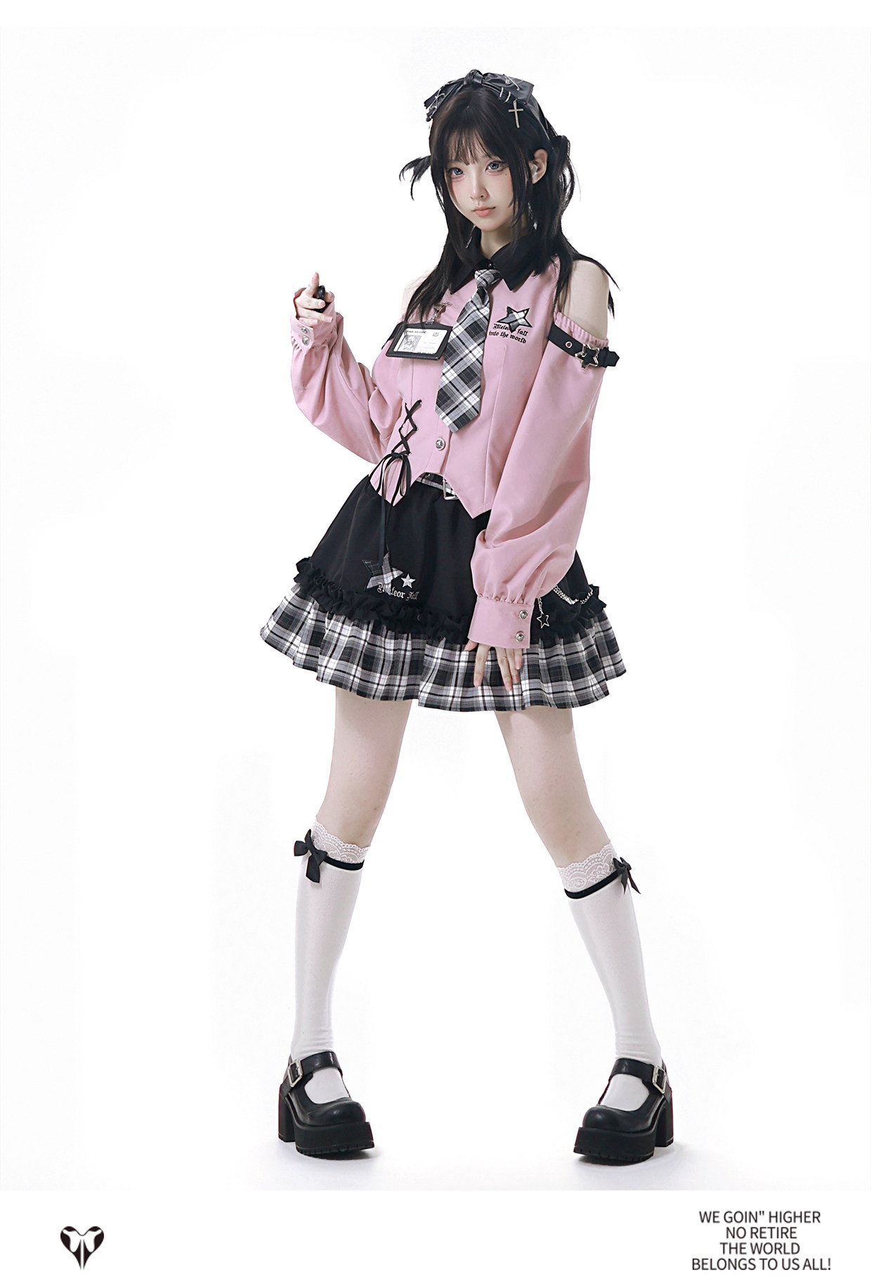 pinksavior【星辰闪耀】露肩粉黑早秋衬衫半裙设计感显瘦套装 [Original Page Link]