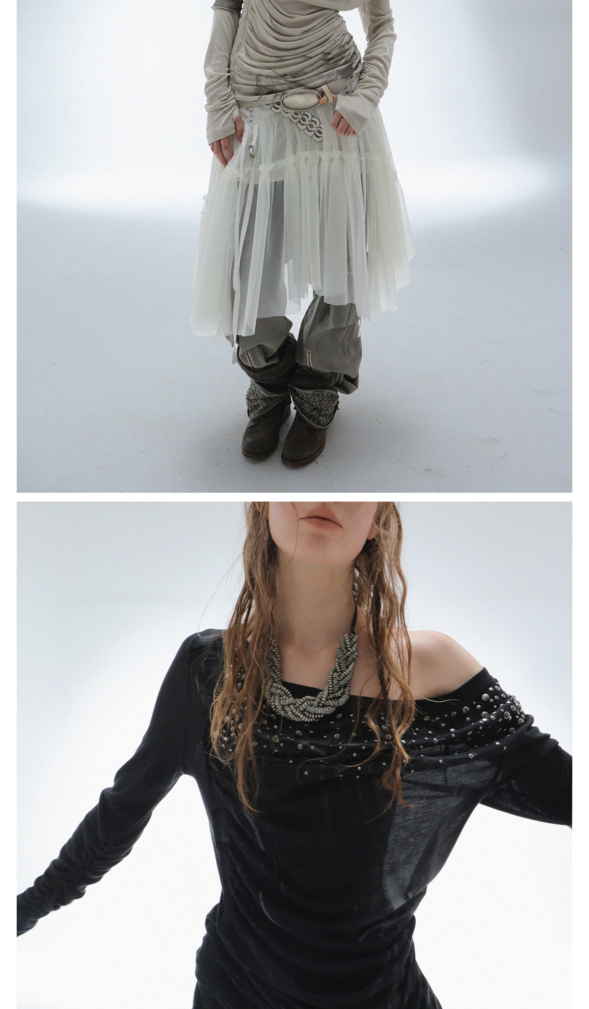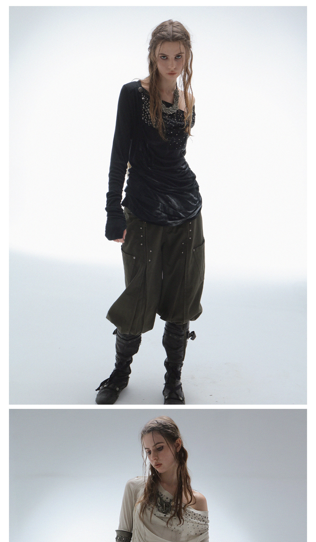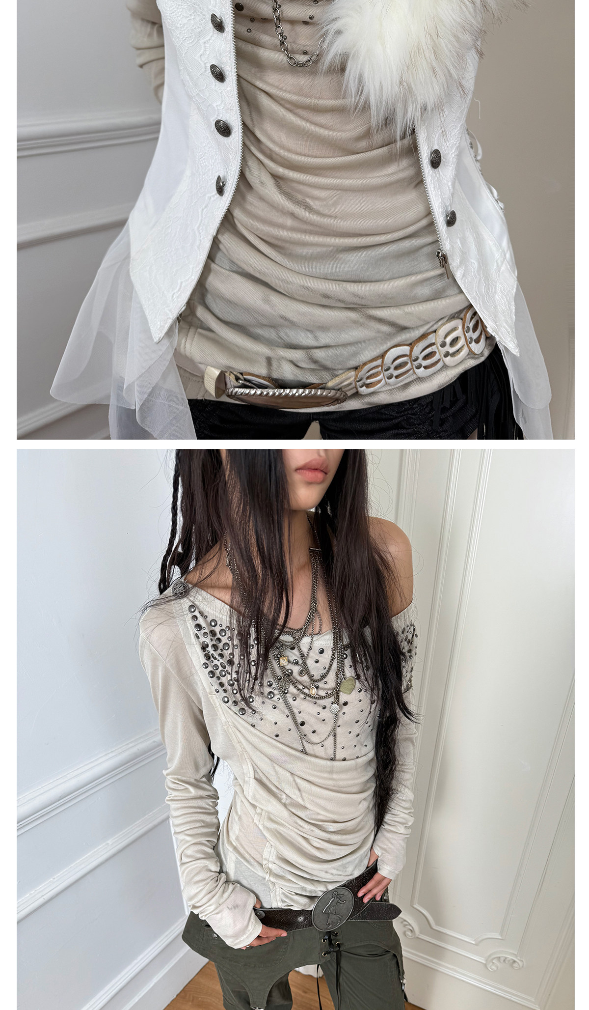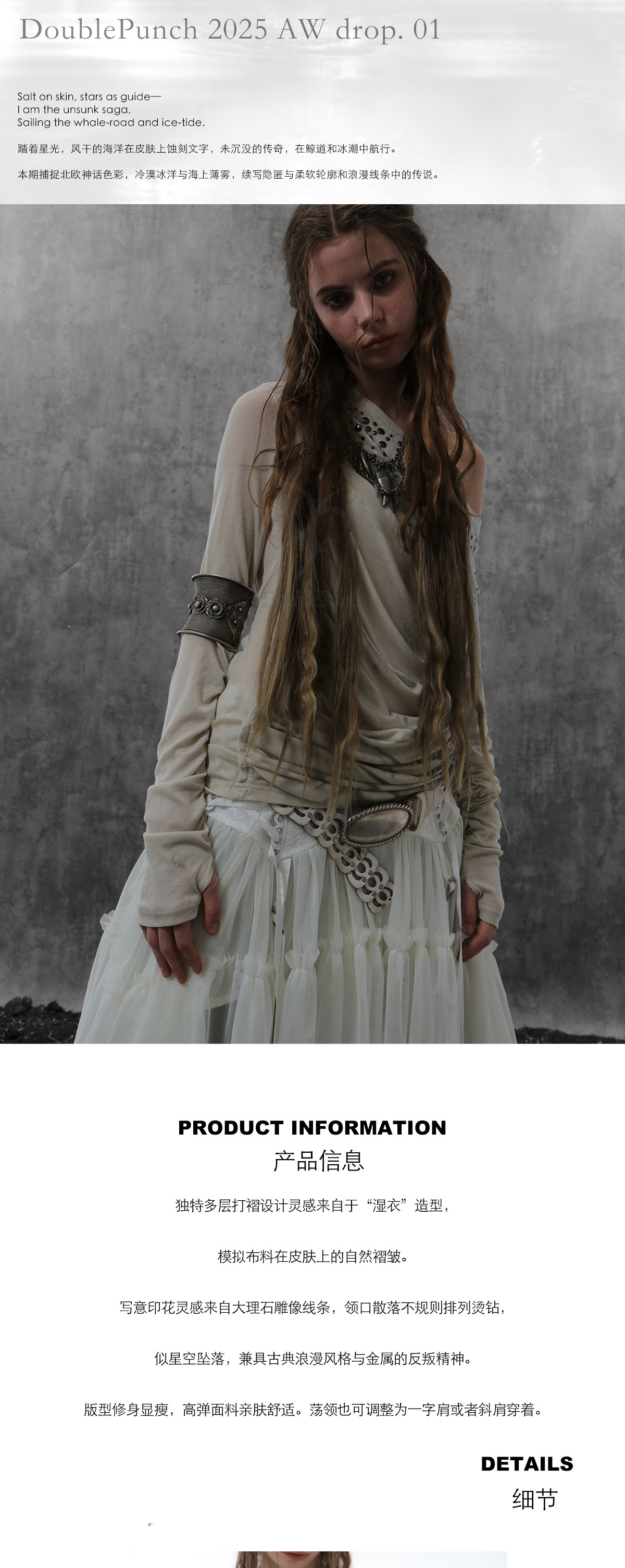 DoublePunch春秋原创荡领斜肩多穿法烫钻复古印花造型打底衫上衣 [Original Page Link]