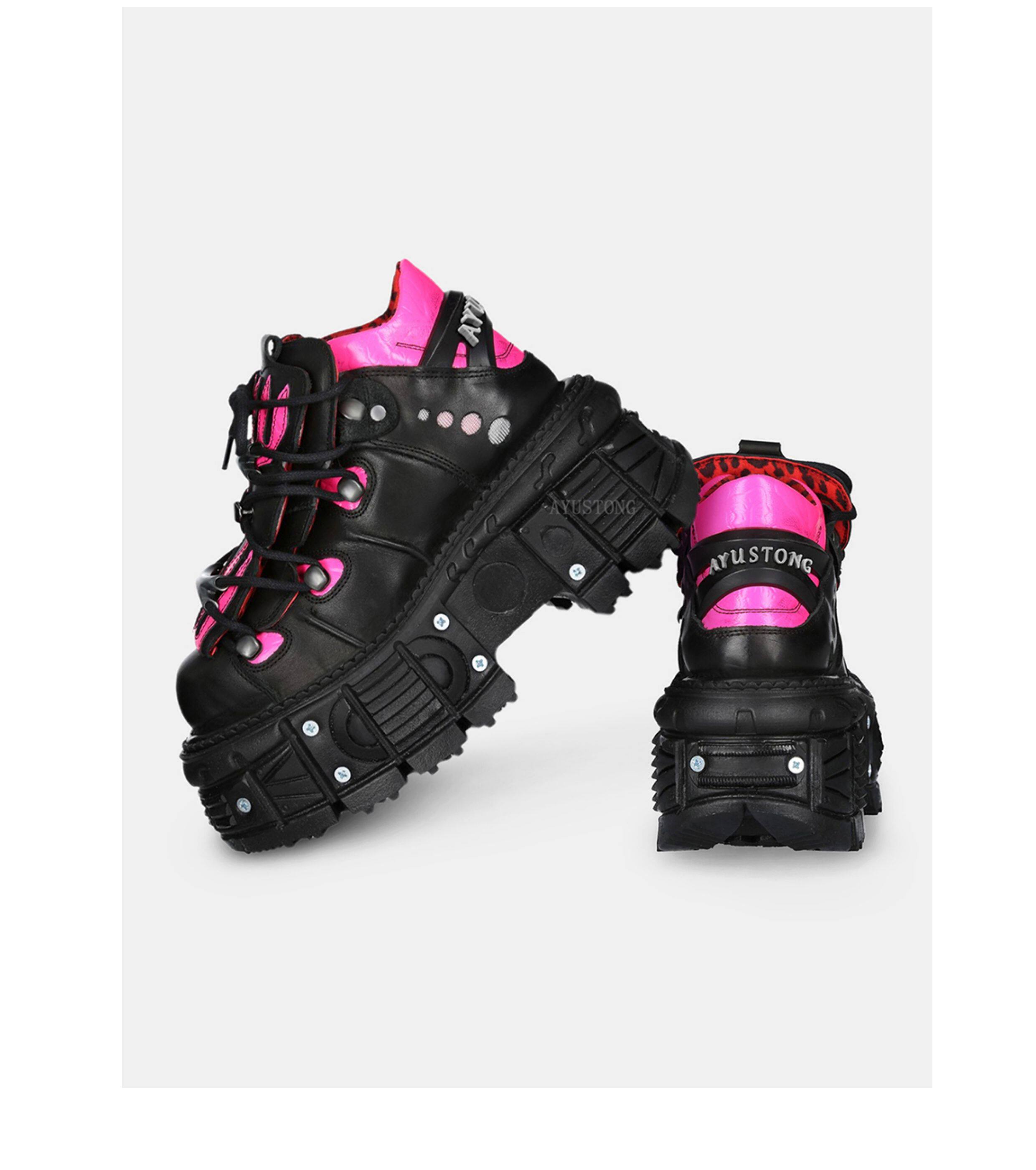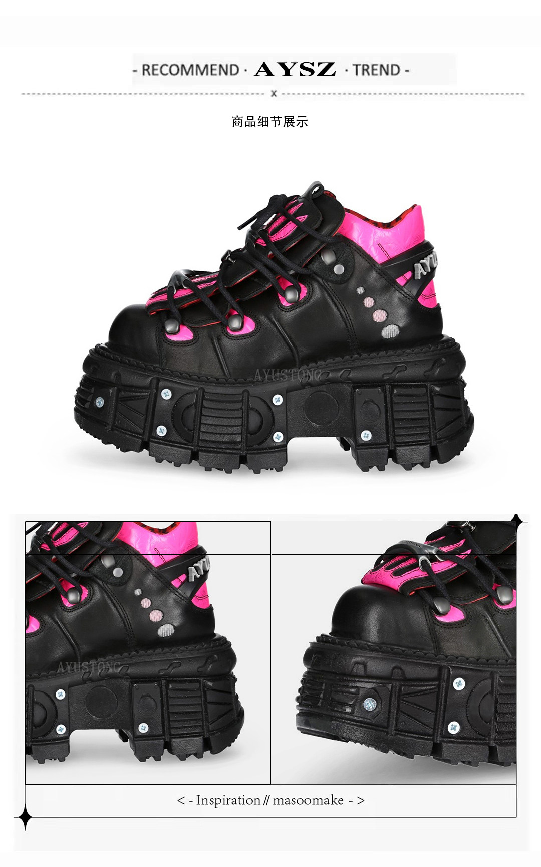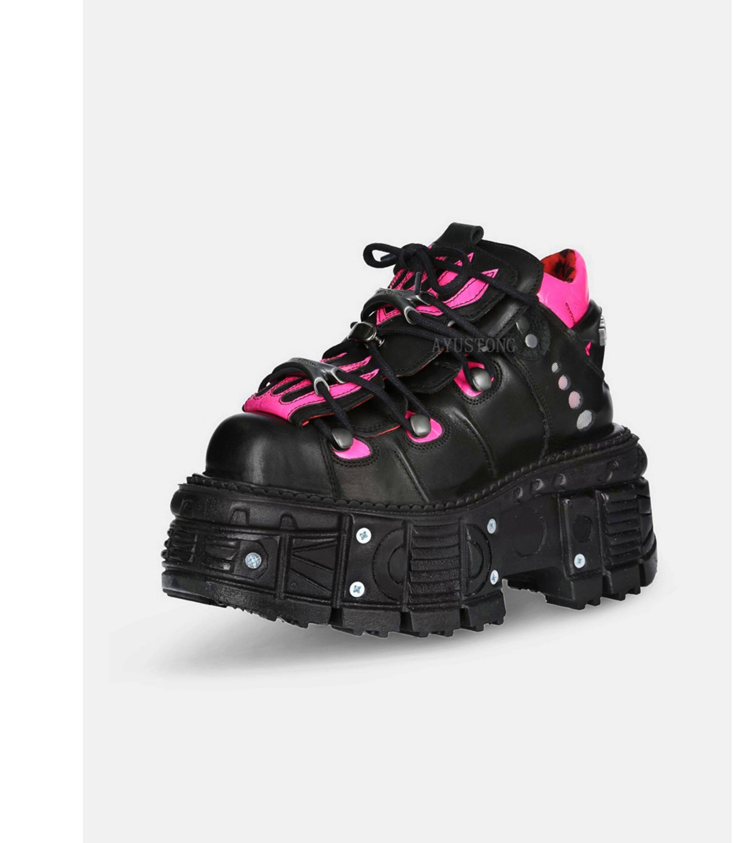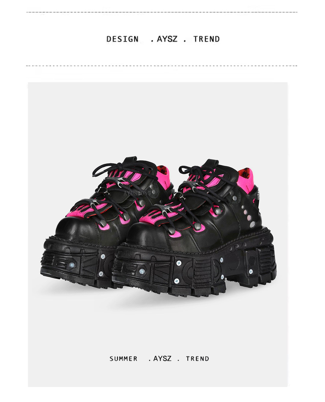 Spanish streetwear brand, metal punk style, high-top platform shoes, niche dark flame Y2K unisex height-increasing leather shoes
