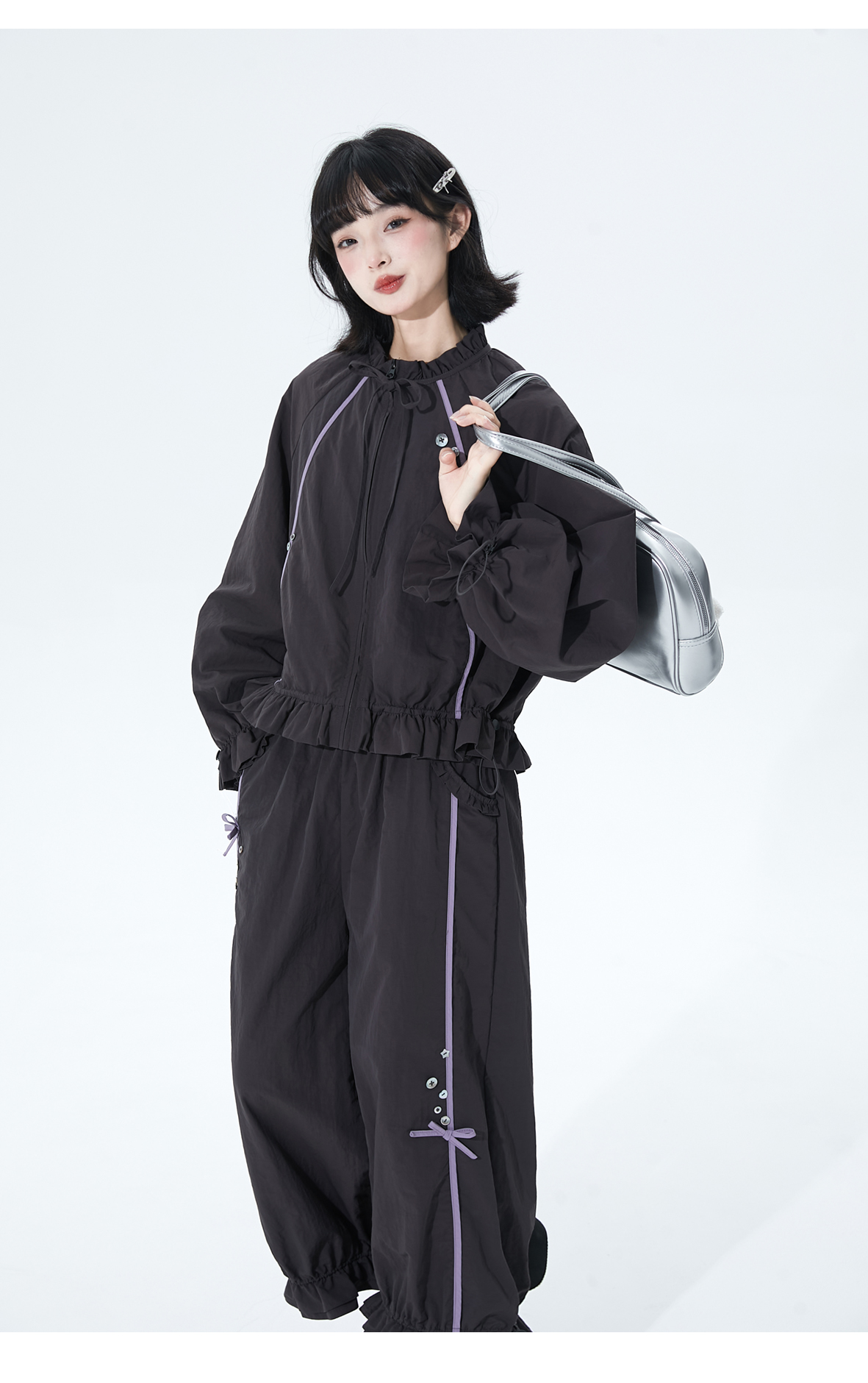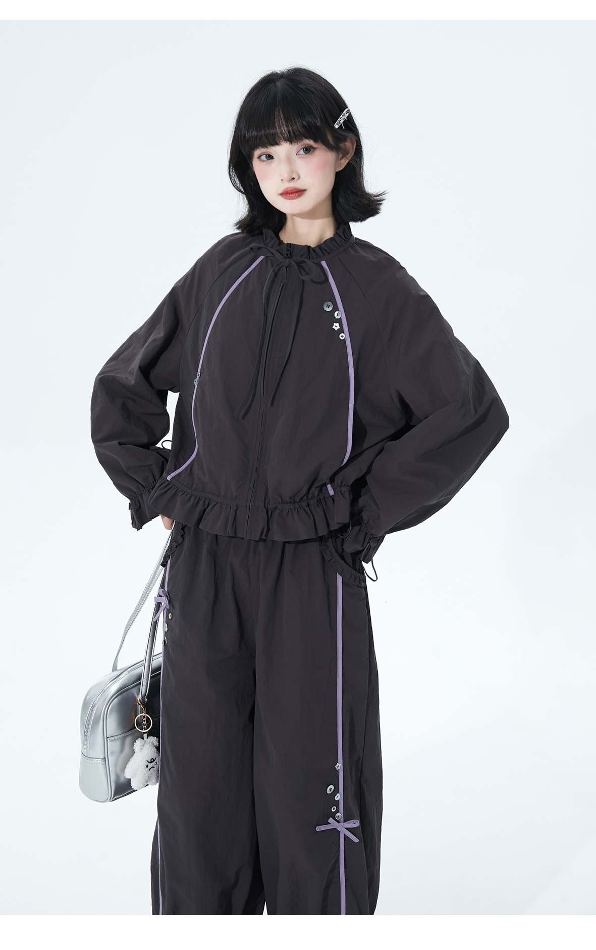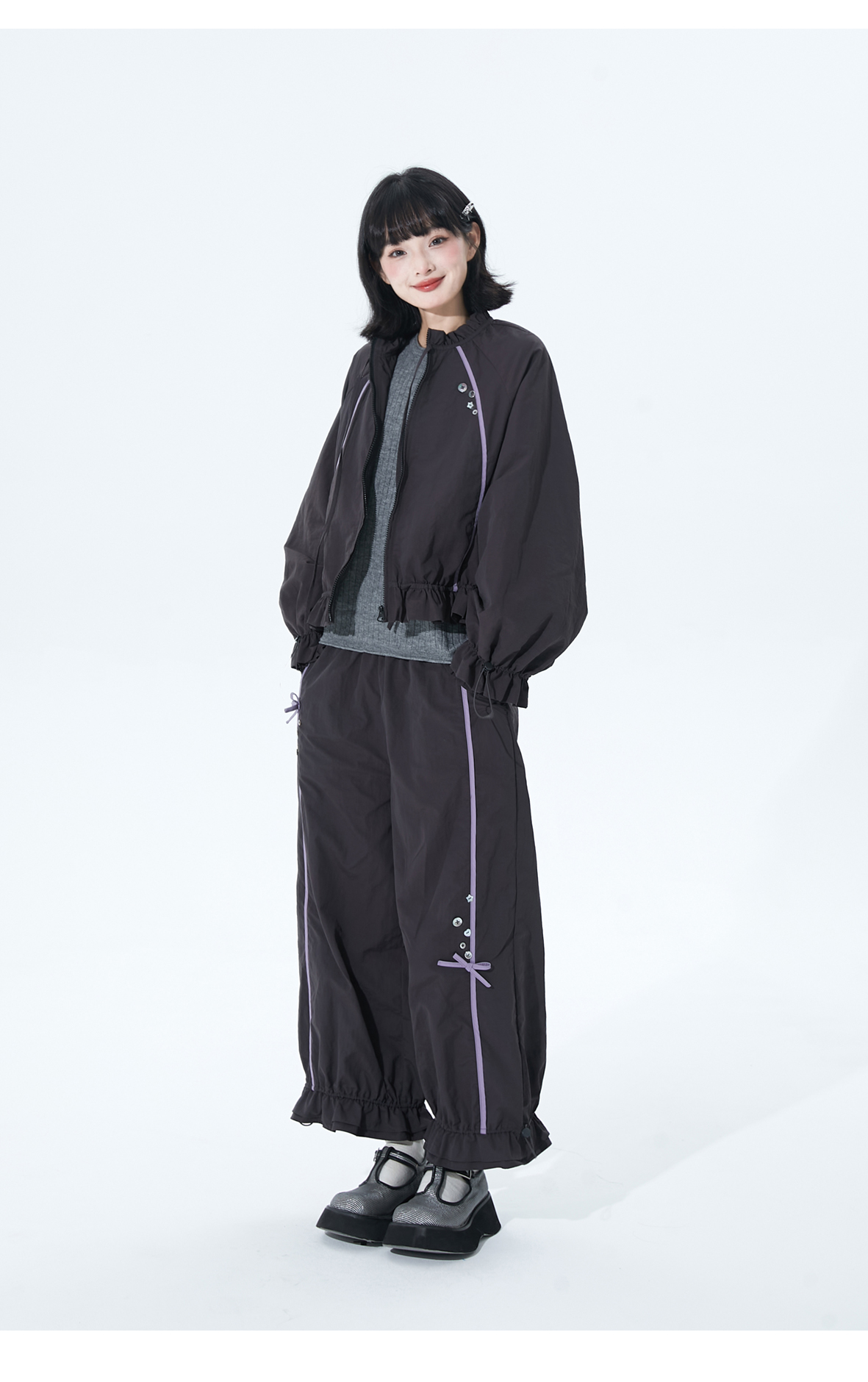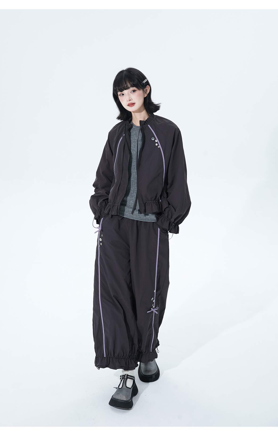 小葱良裁 紫线星轨 甜酷风早秋工装短外套女荷叶边阔腿裤两件套 [Original Page Link]