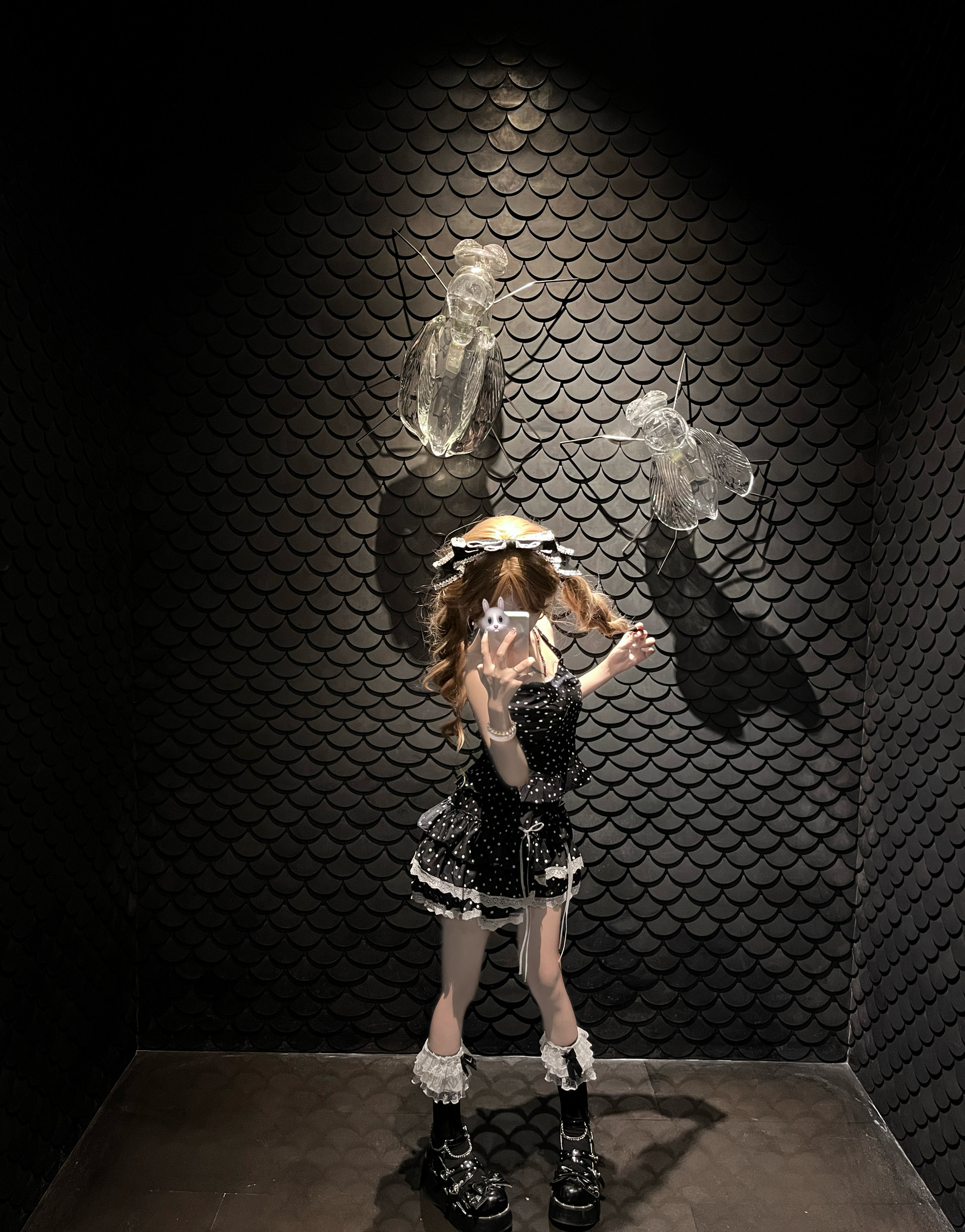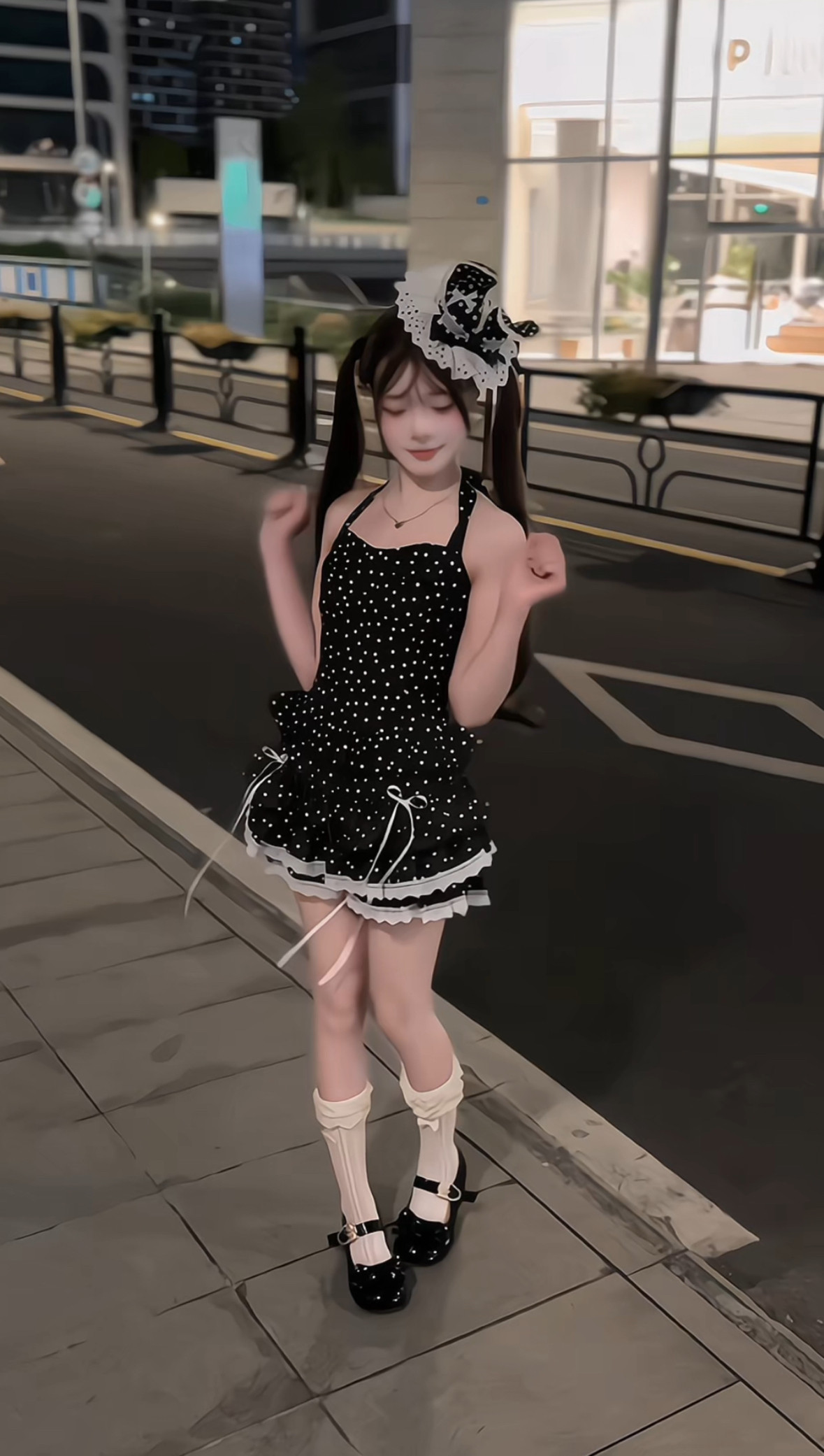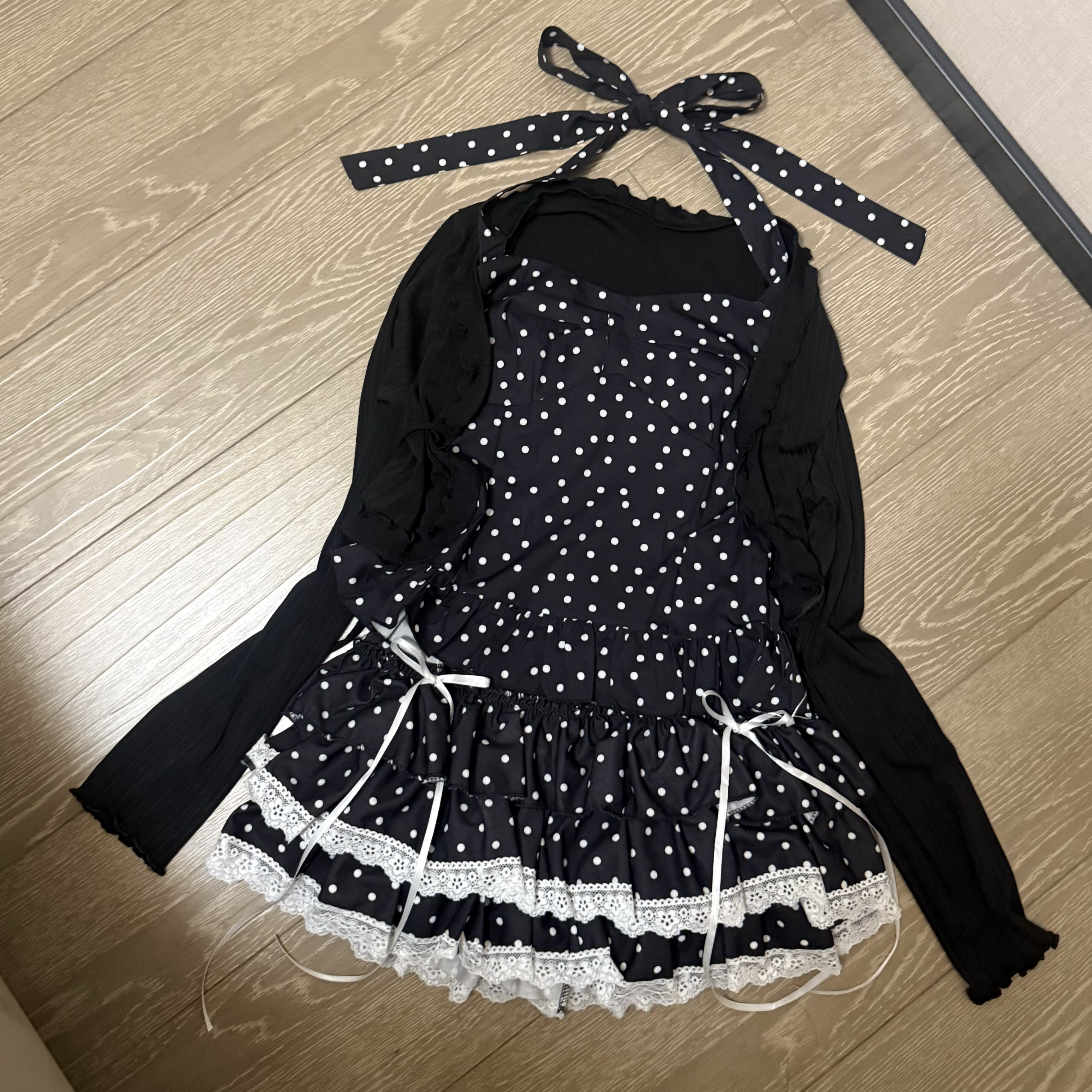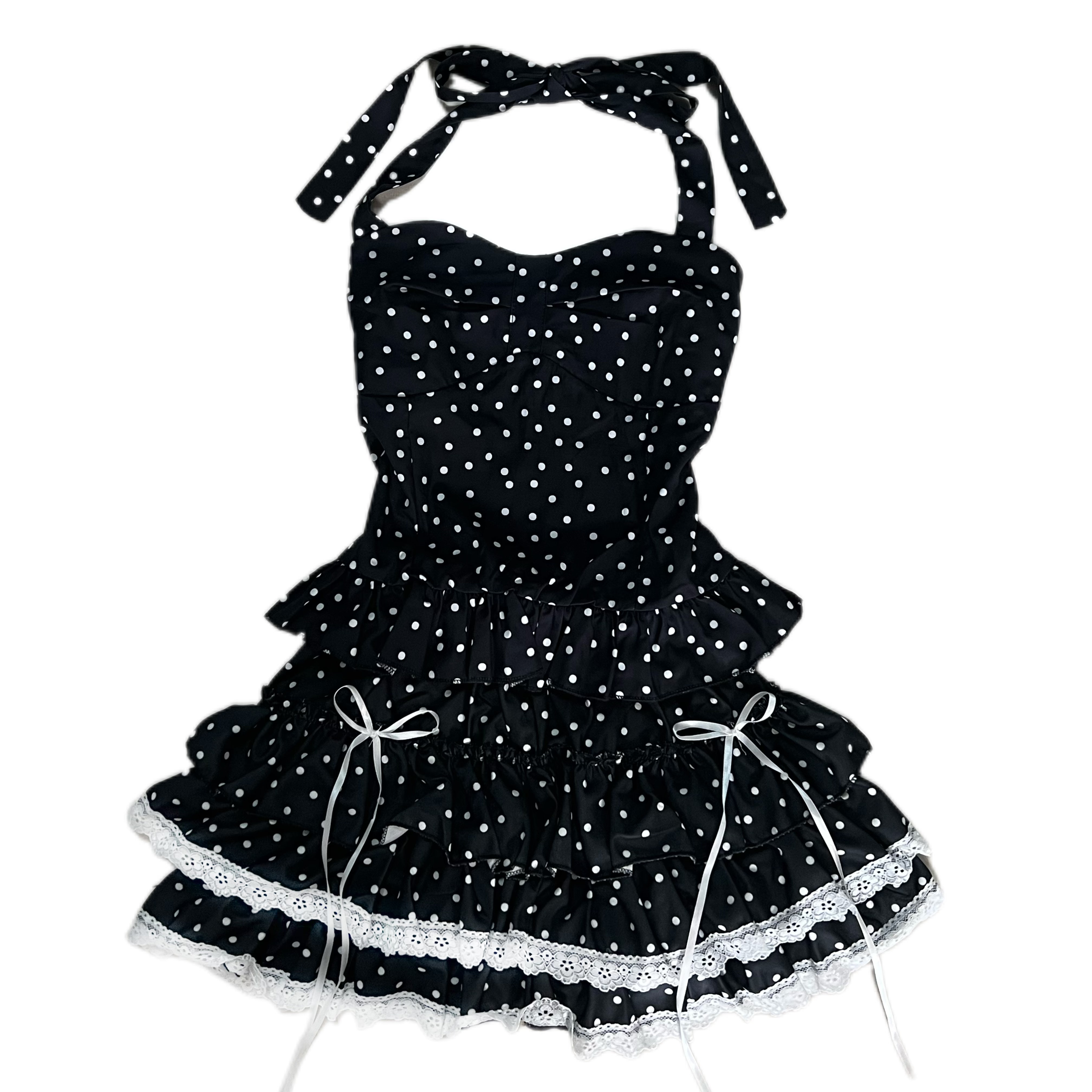 黑色波点挂脖上衣蕾丝蝴蝶结蛋糕裙套装 [Original Page Link]