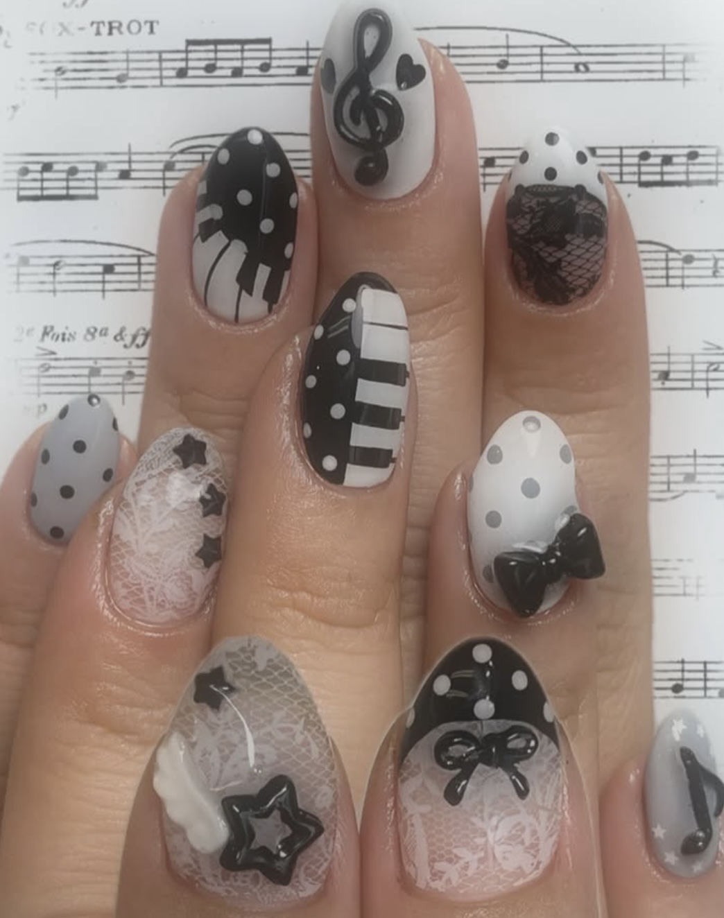 Real photos show nail art in an Instagram style, featuring sweet, cool, and sexy looks, with musical notes, polka dots, and vintage bows.