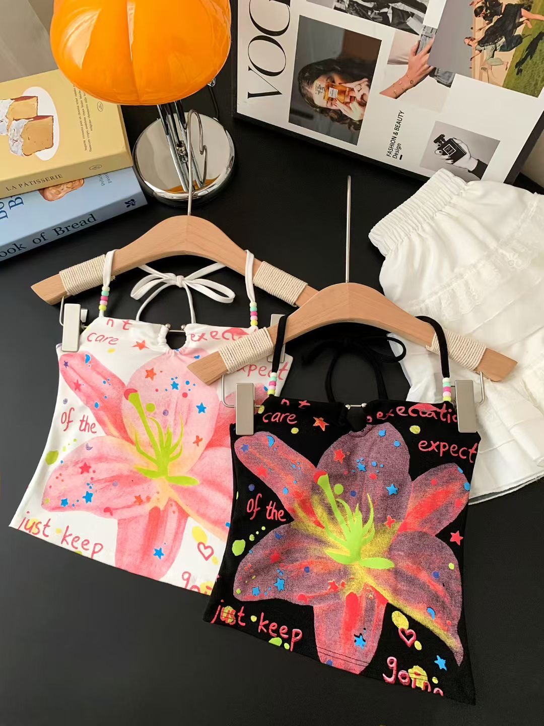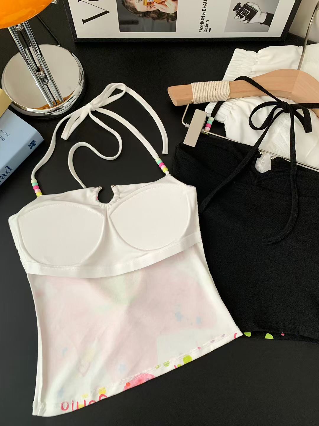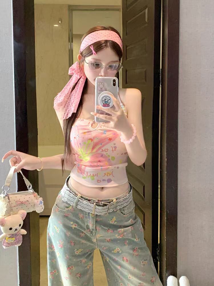 甜辣妹粉色印花串珠挂脖吊带背心女夏季2025修身性感露背短款上衣 [Original Page Link]