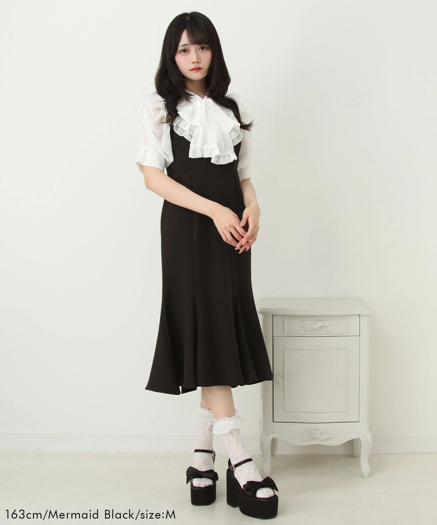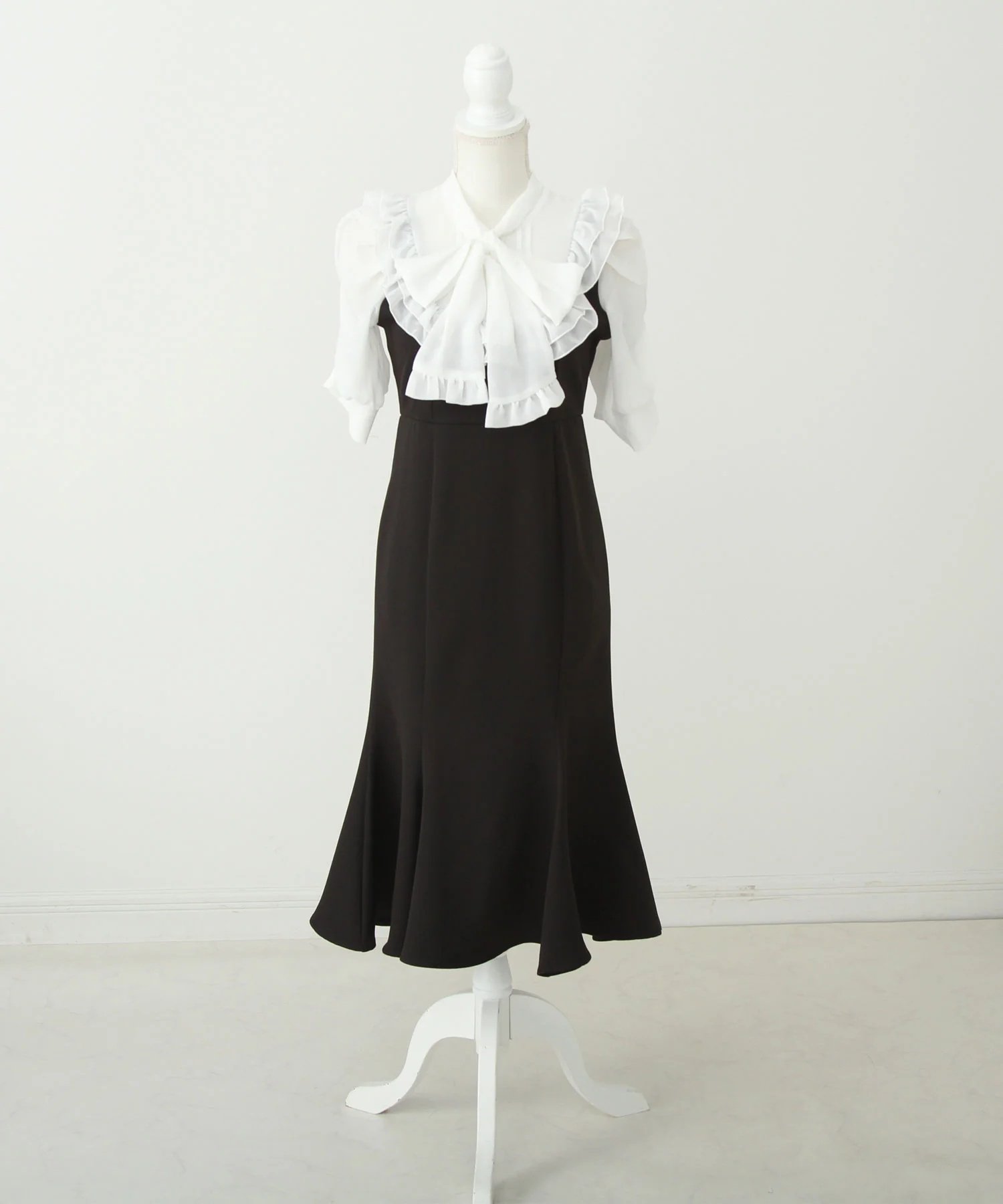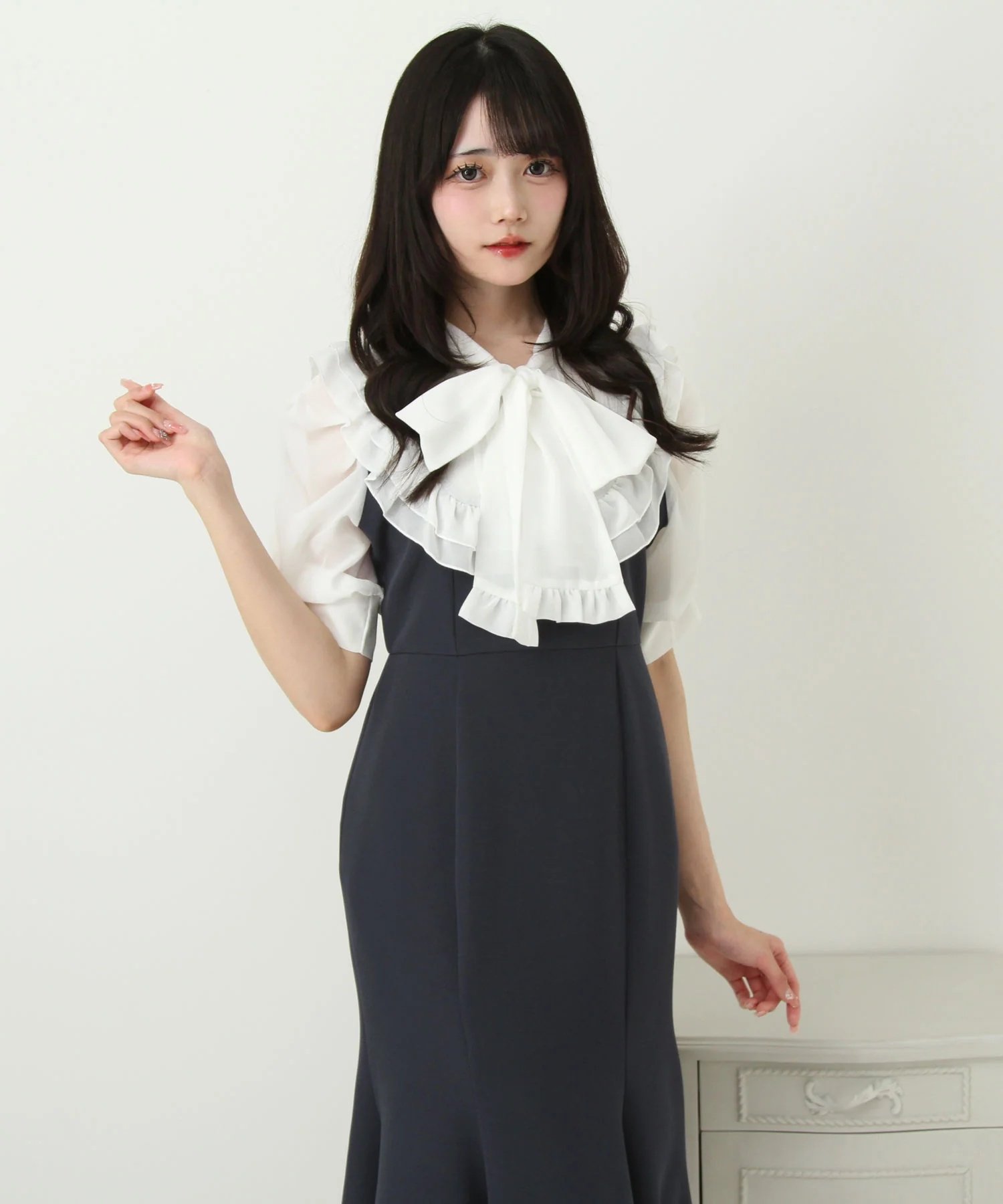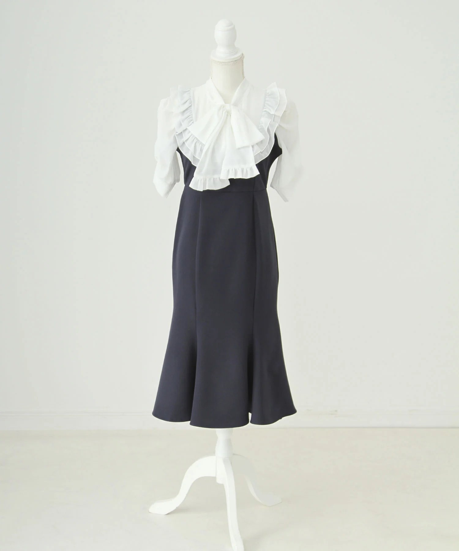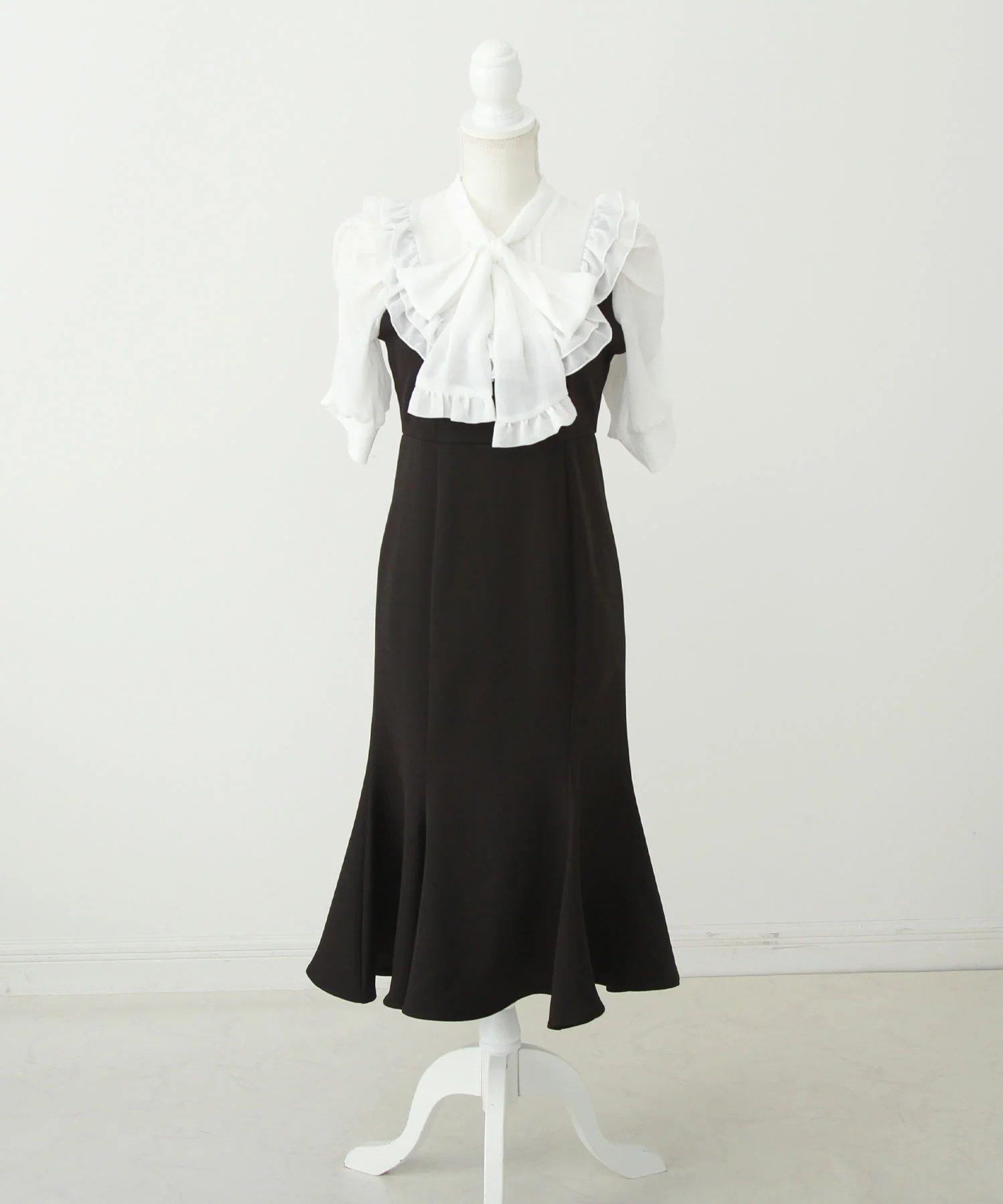 Japanese style new versatile and elegant dress with ruffled trim and large bow, mid-length fishtail dress.