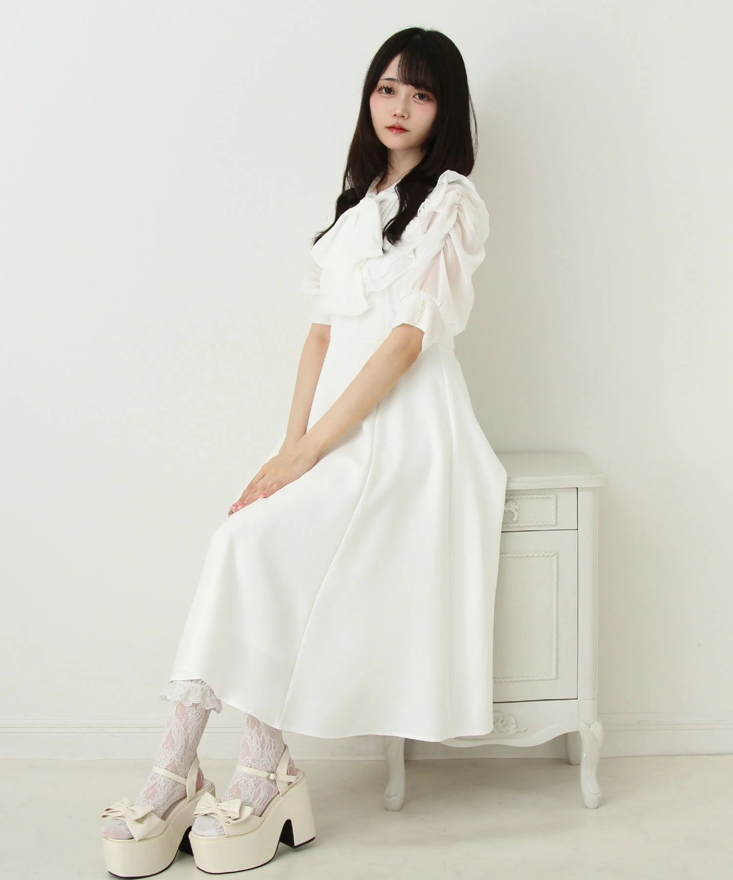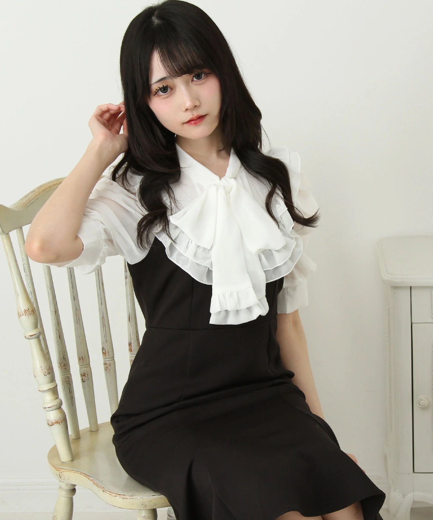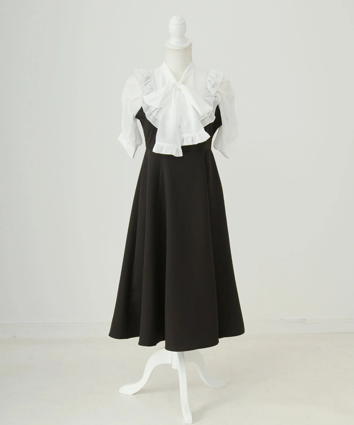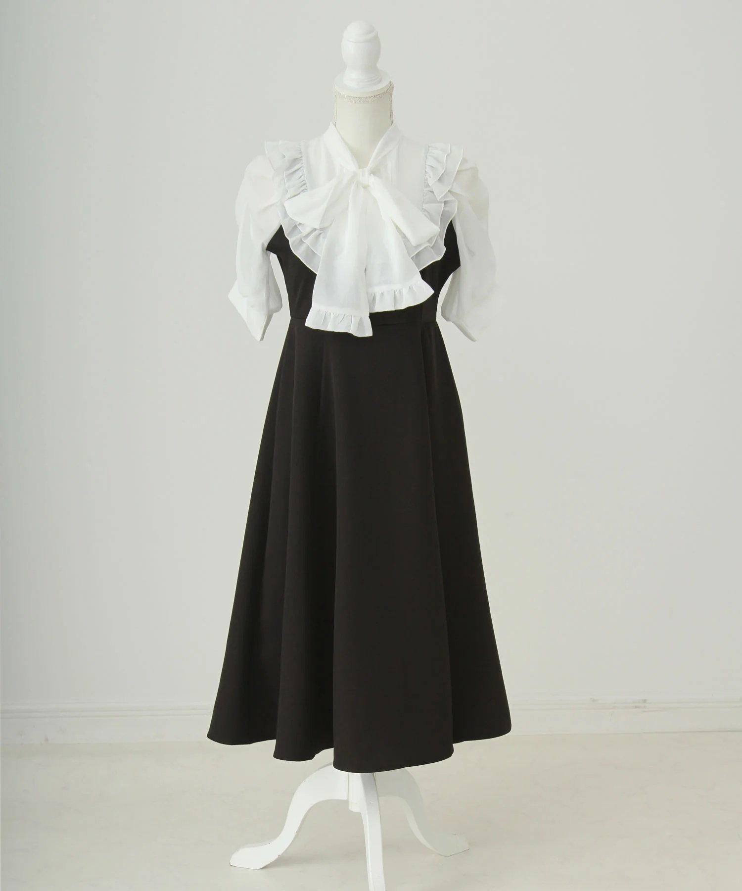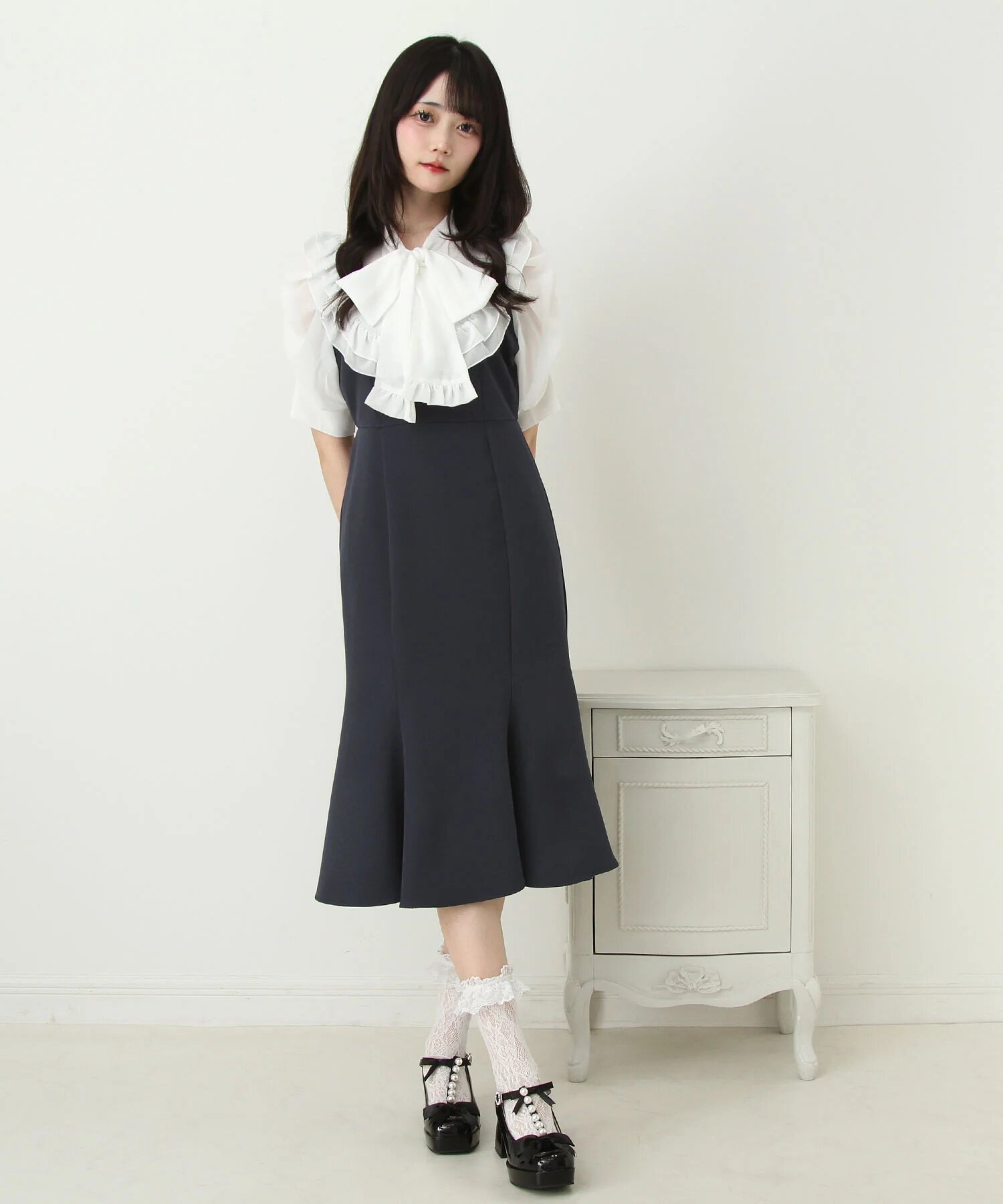 Japanese style new versatile and elegant dress with ruffled trim and large bow, mid-length fishtail dress.
