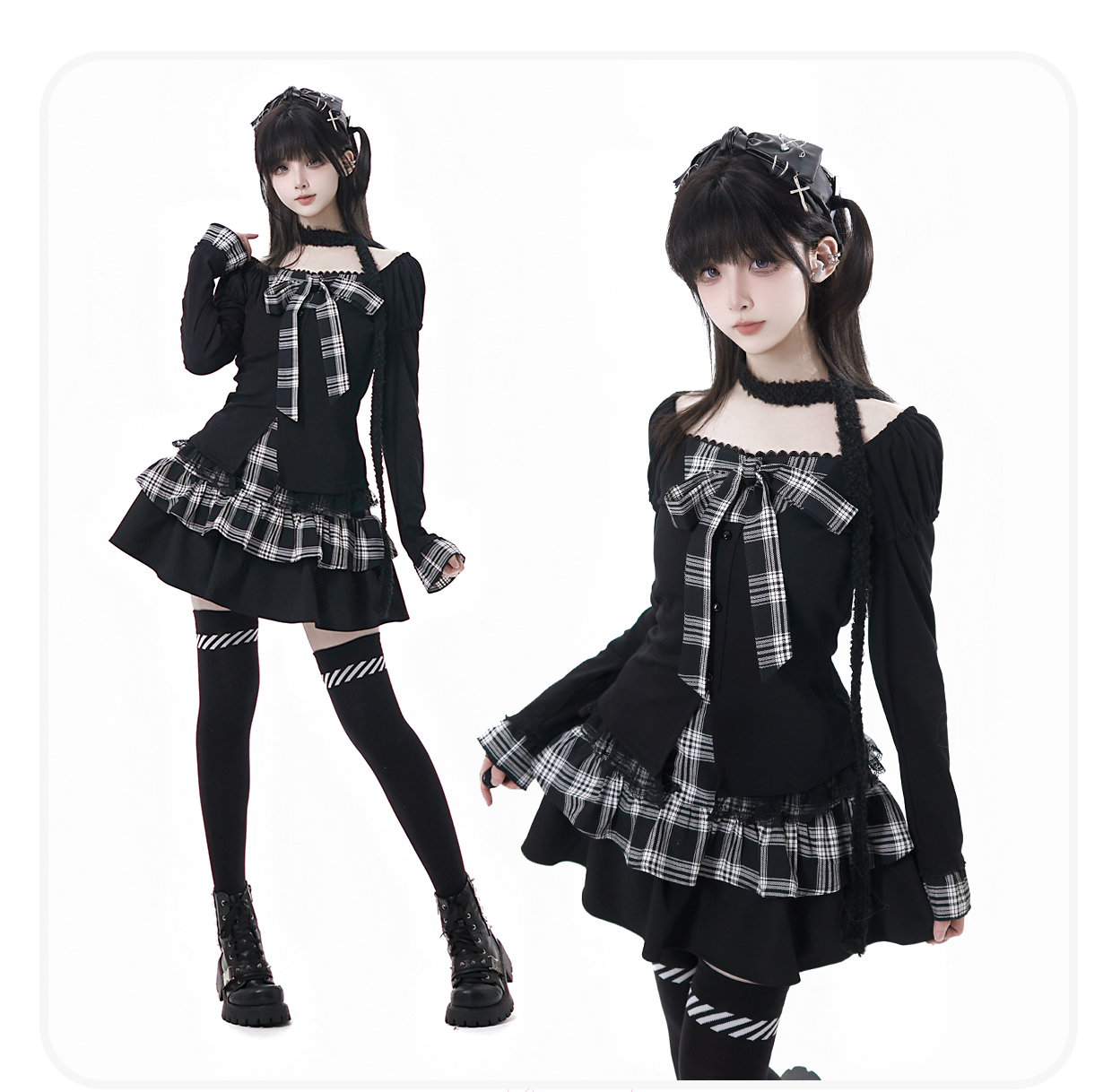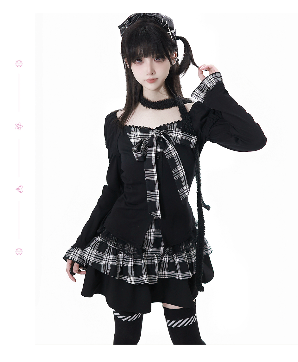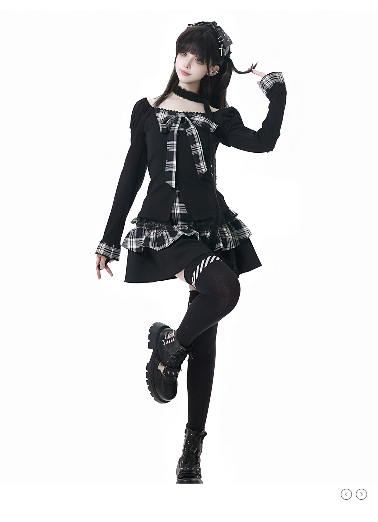 pinksavior【爱丽丝】格纹拼接经典显瘦假两件上衣半裙设计感套装 [Original Page Link]