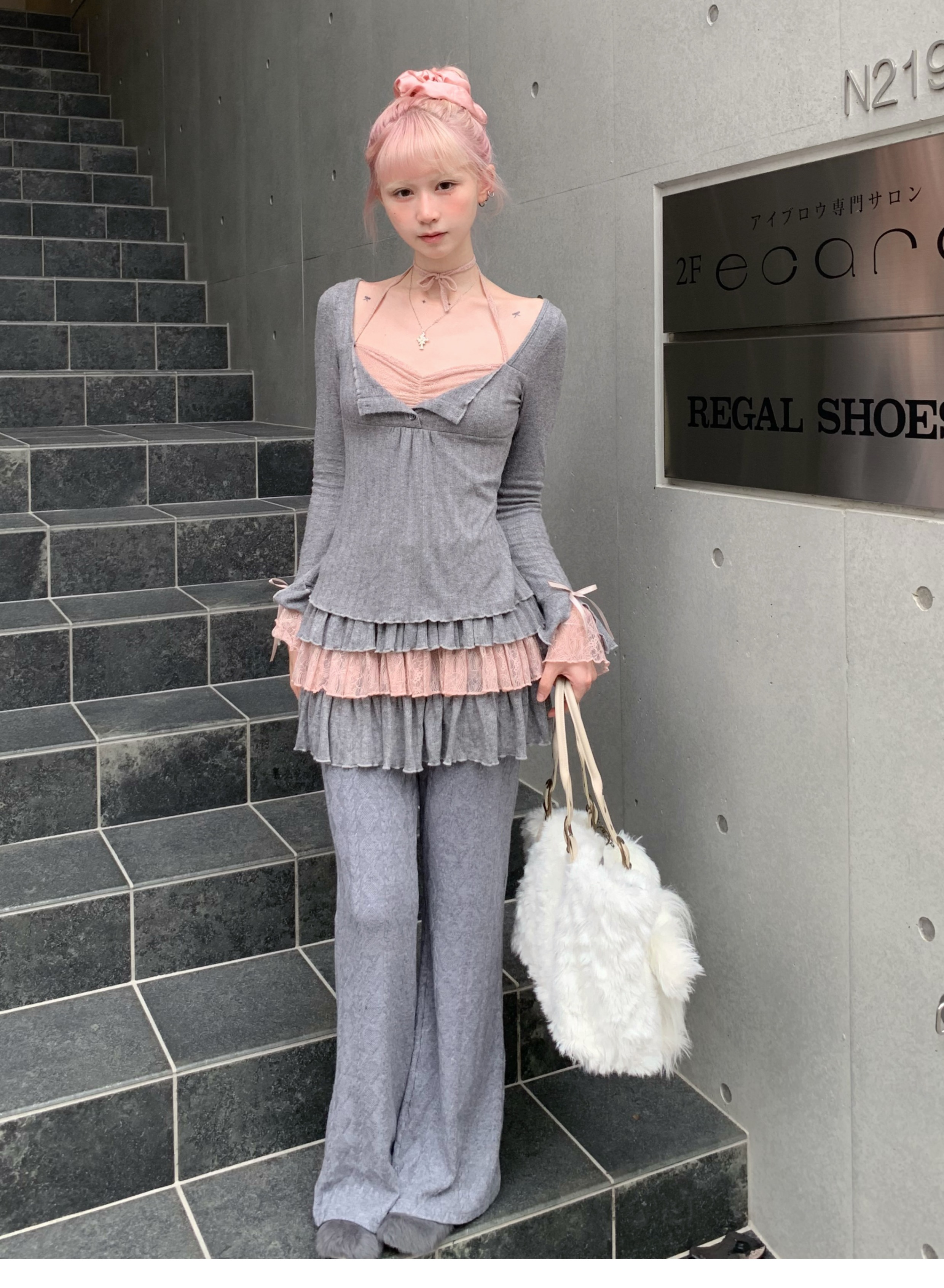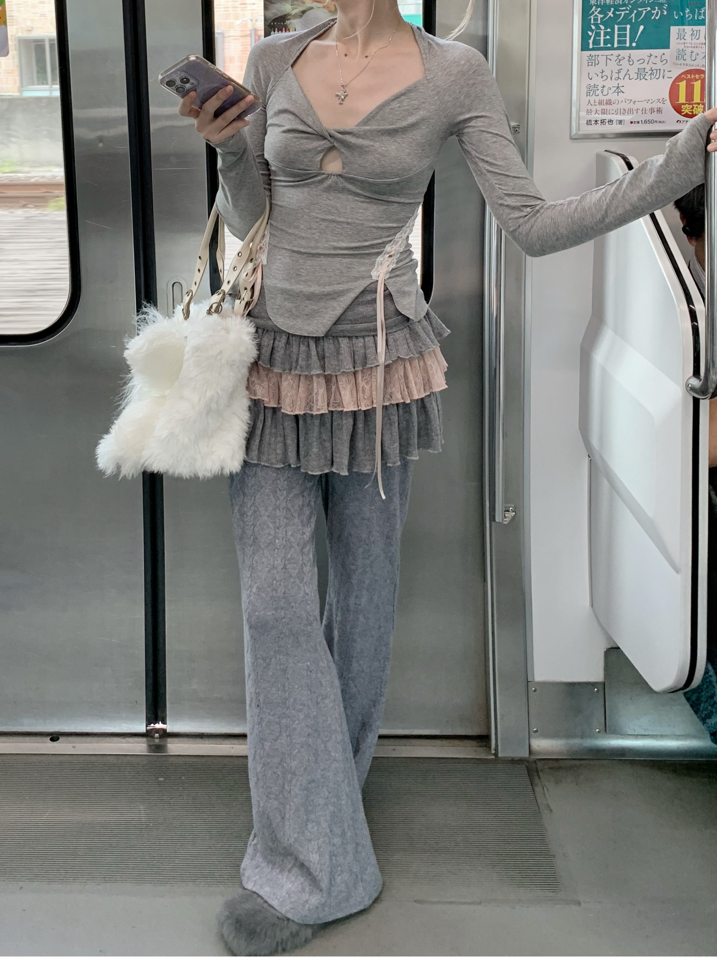 MonddoM Original Gray Knit Slimming Versatile Casual Pants with Cute Lace Puffy Cake Skirt