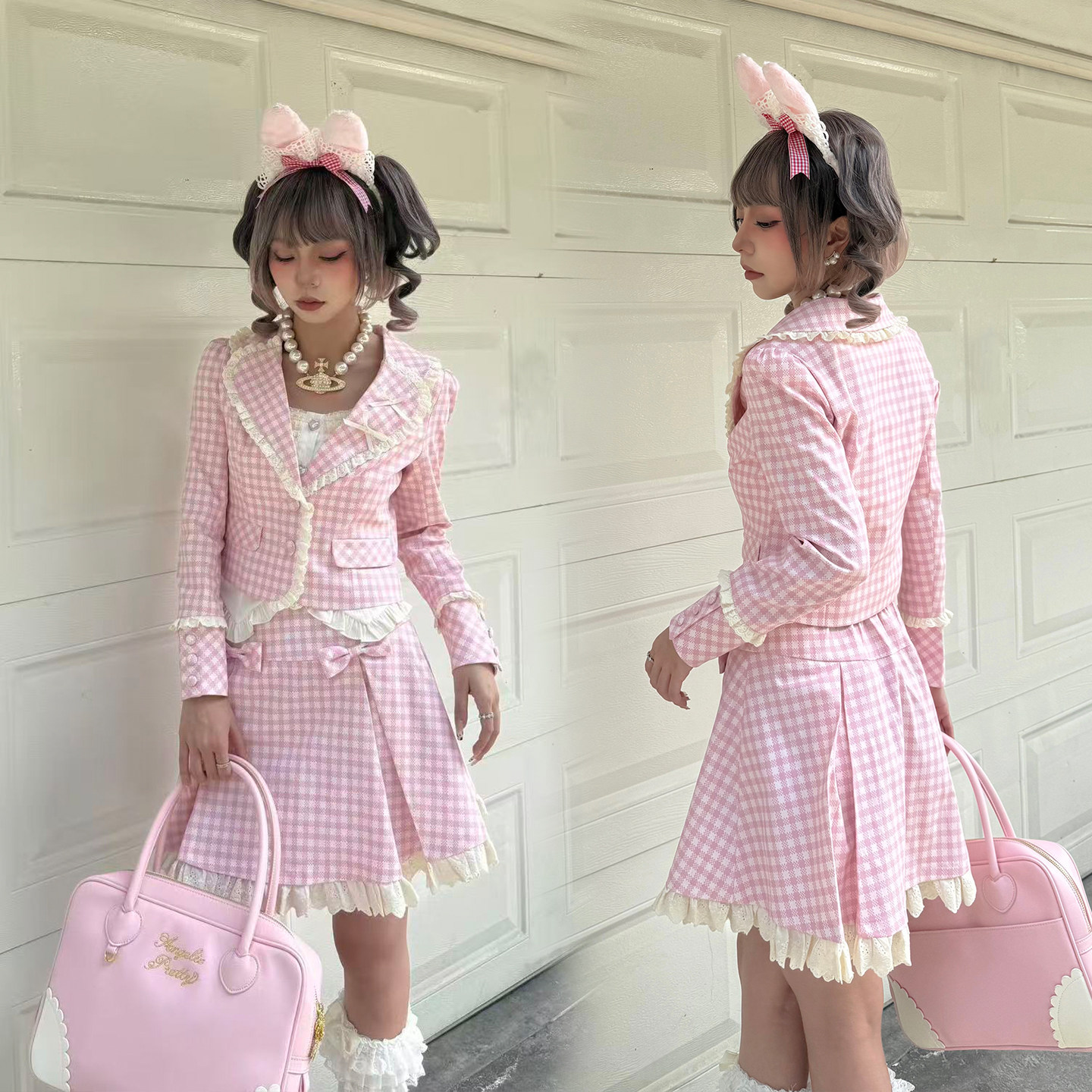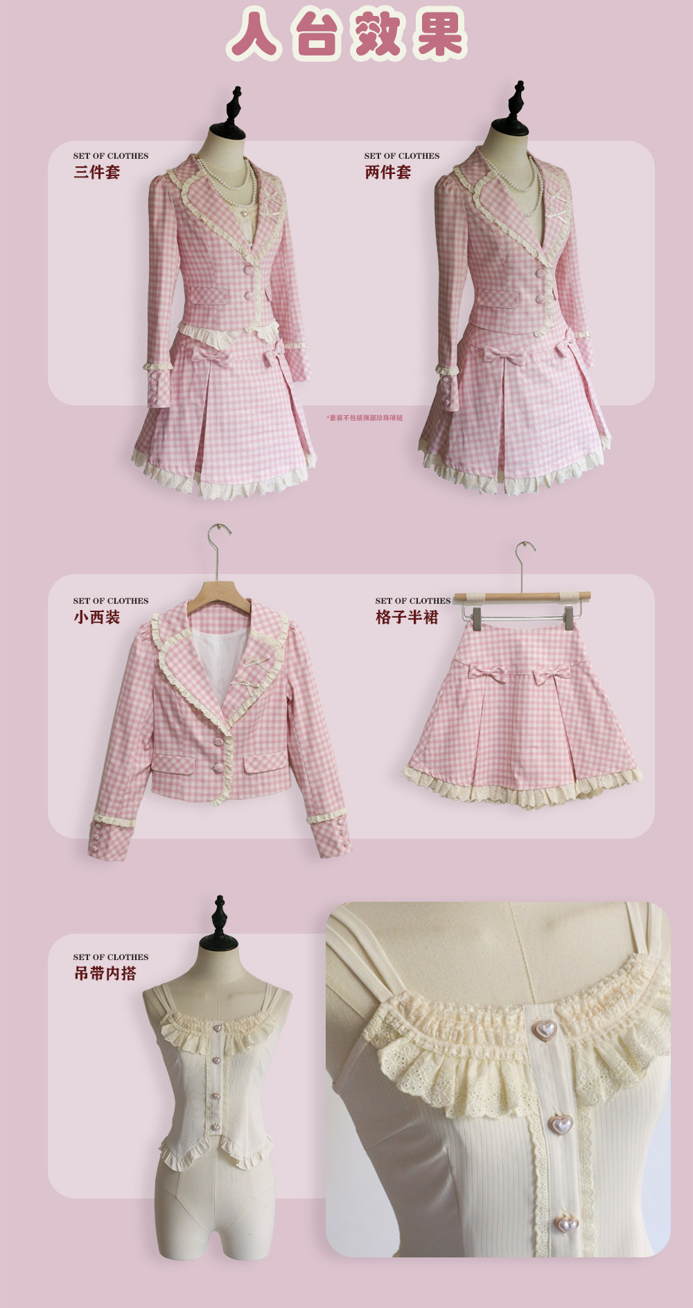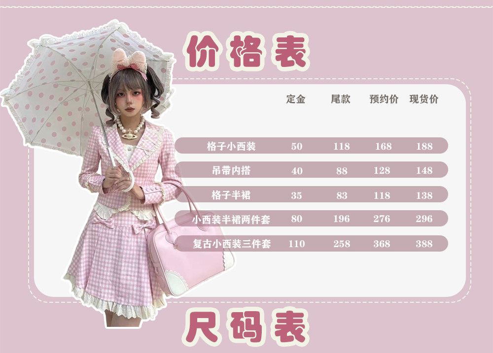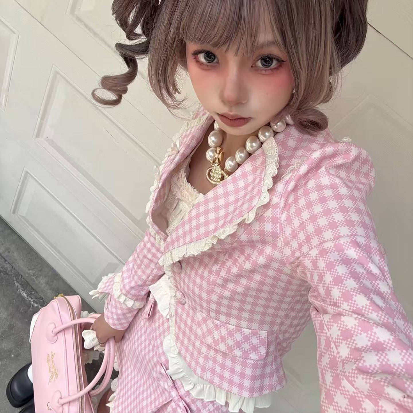 奈奈千金套装粉色格纹复古小西装秋季学院风套装三件套设计感外套 [Original Page Link]