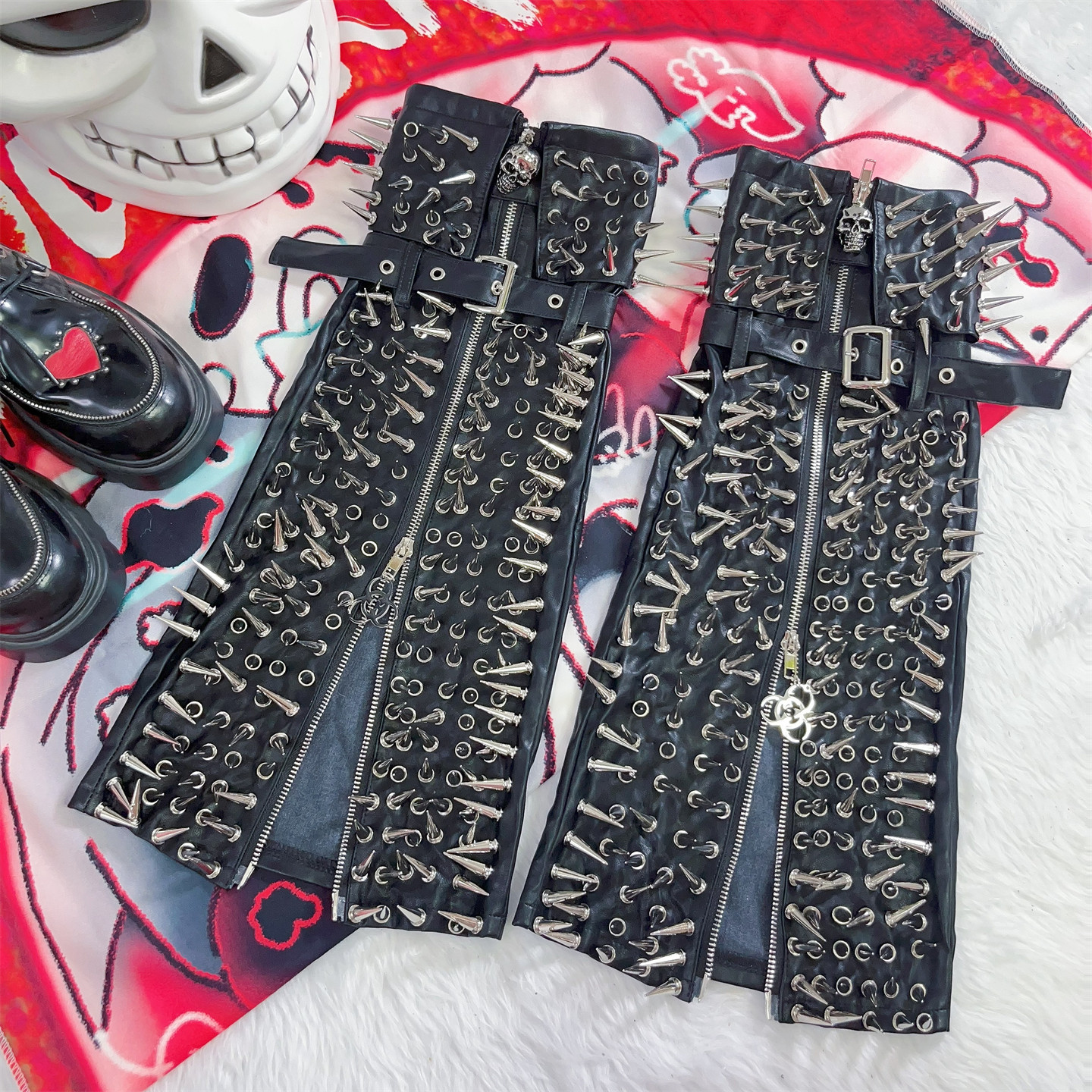 Heavy Metal Punk! Y2K Hot Girls' Studded Rock Heavy-Duty Dark PU Leather Leg Sleeves and Mid-Calf Stockings