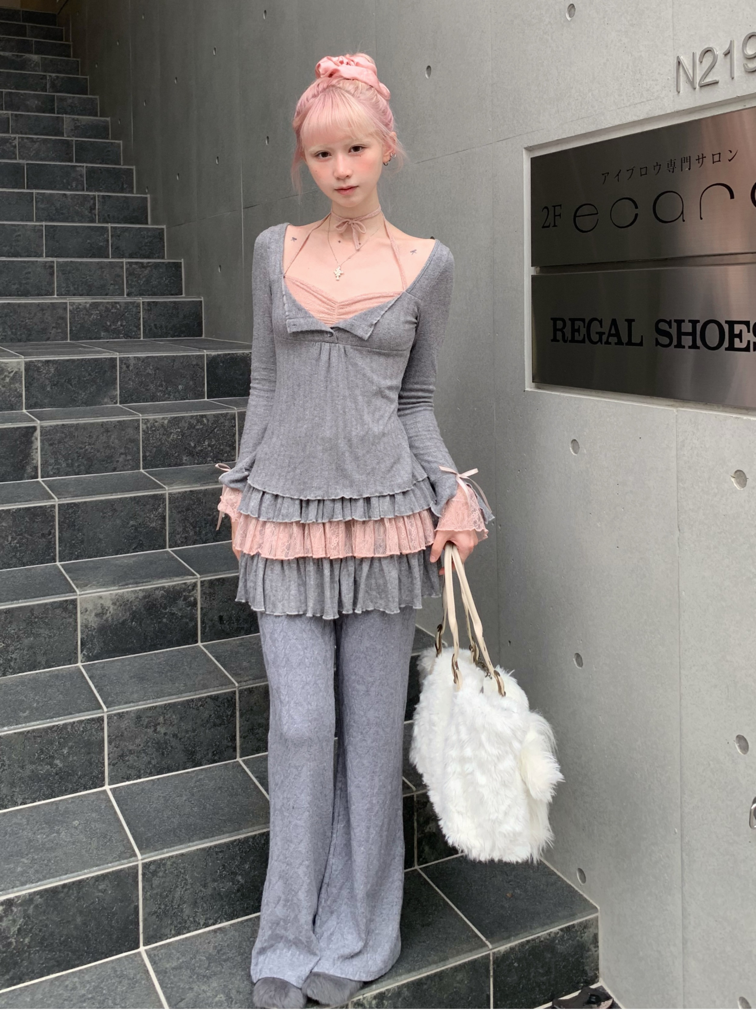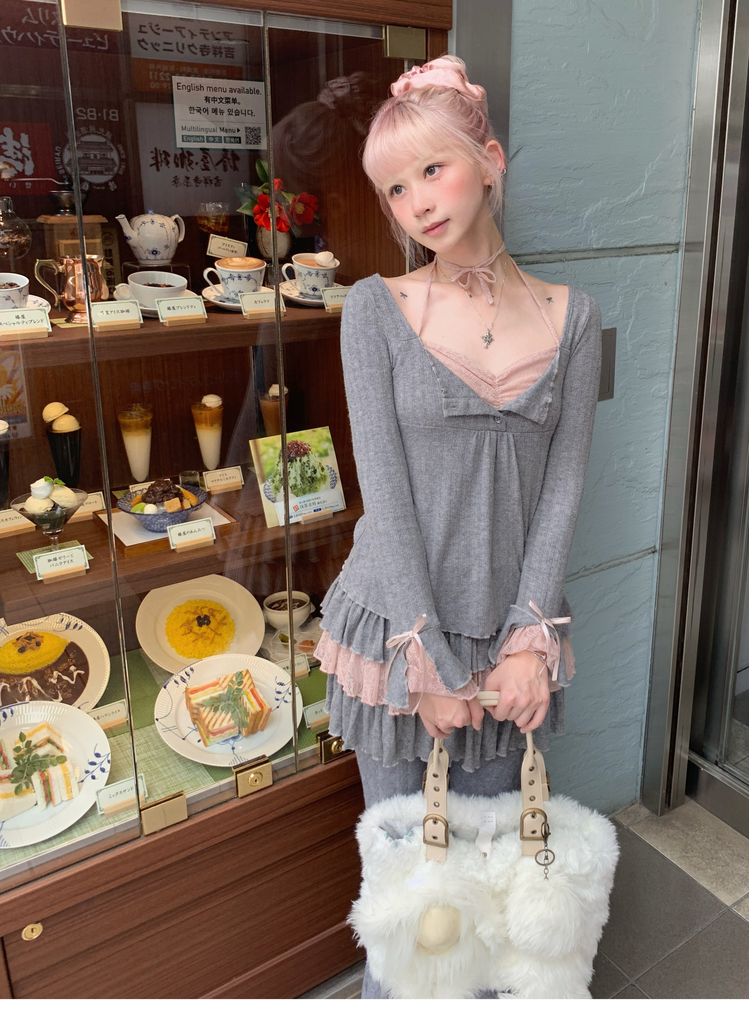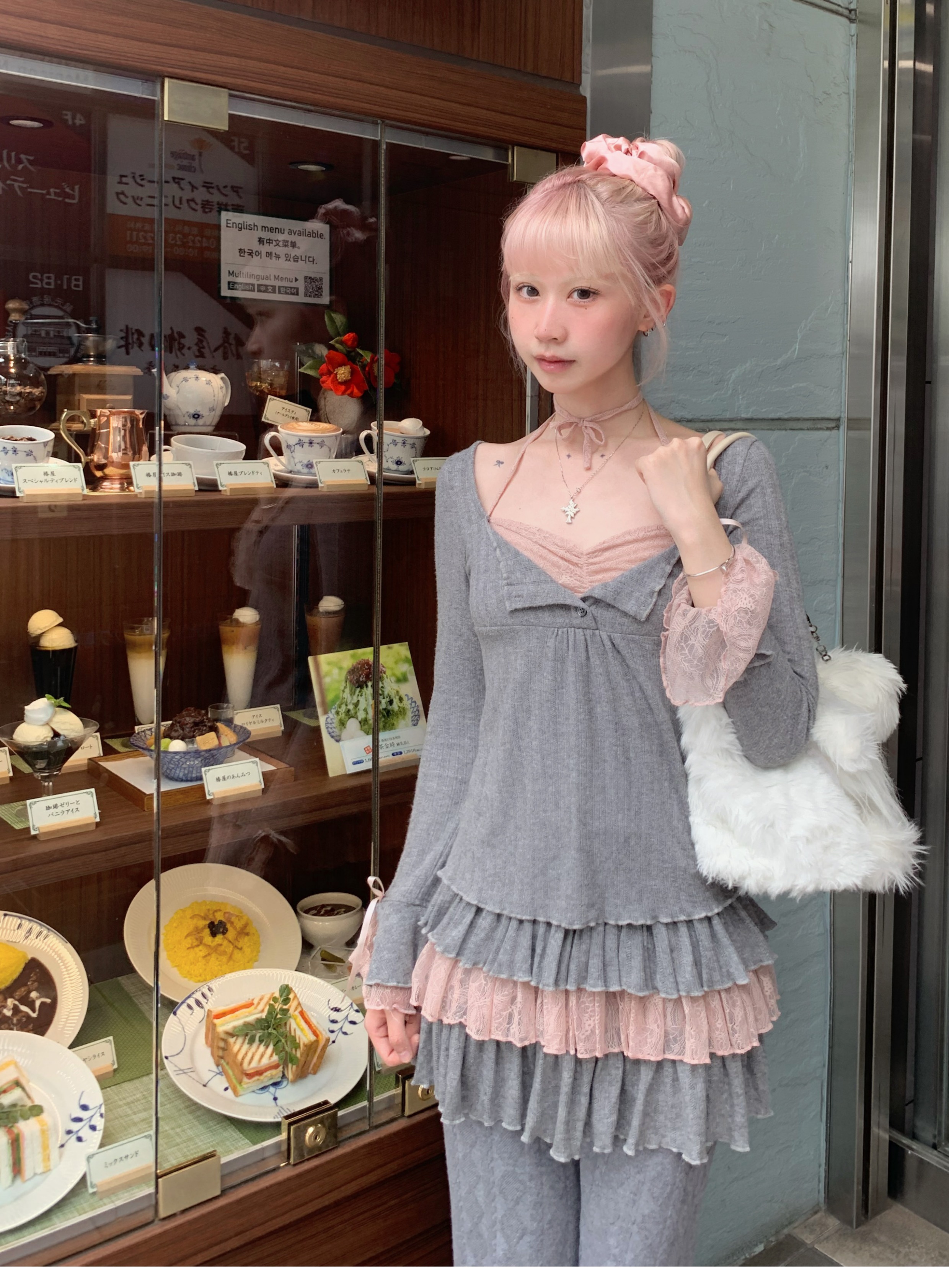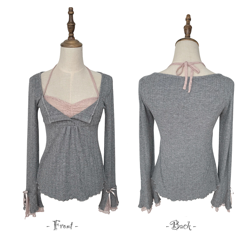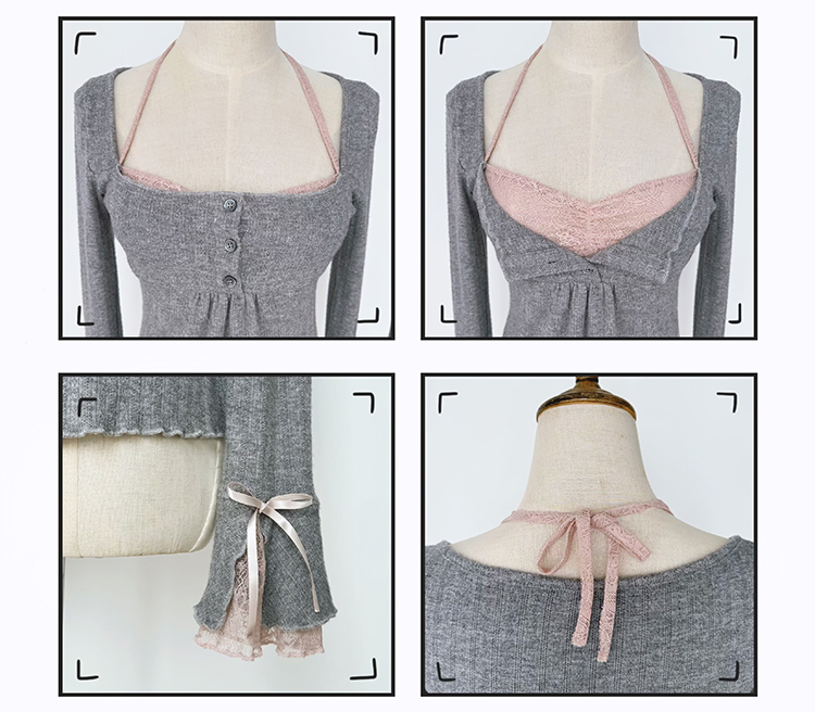 MonddoM•原创灰色针织拼接粉色蕾丝系带蝴蝶结修身针织衫打底衫 [Original Page Link]