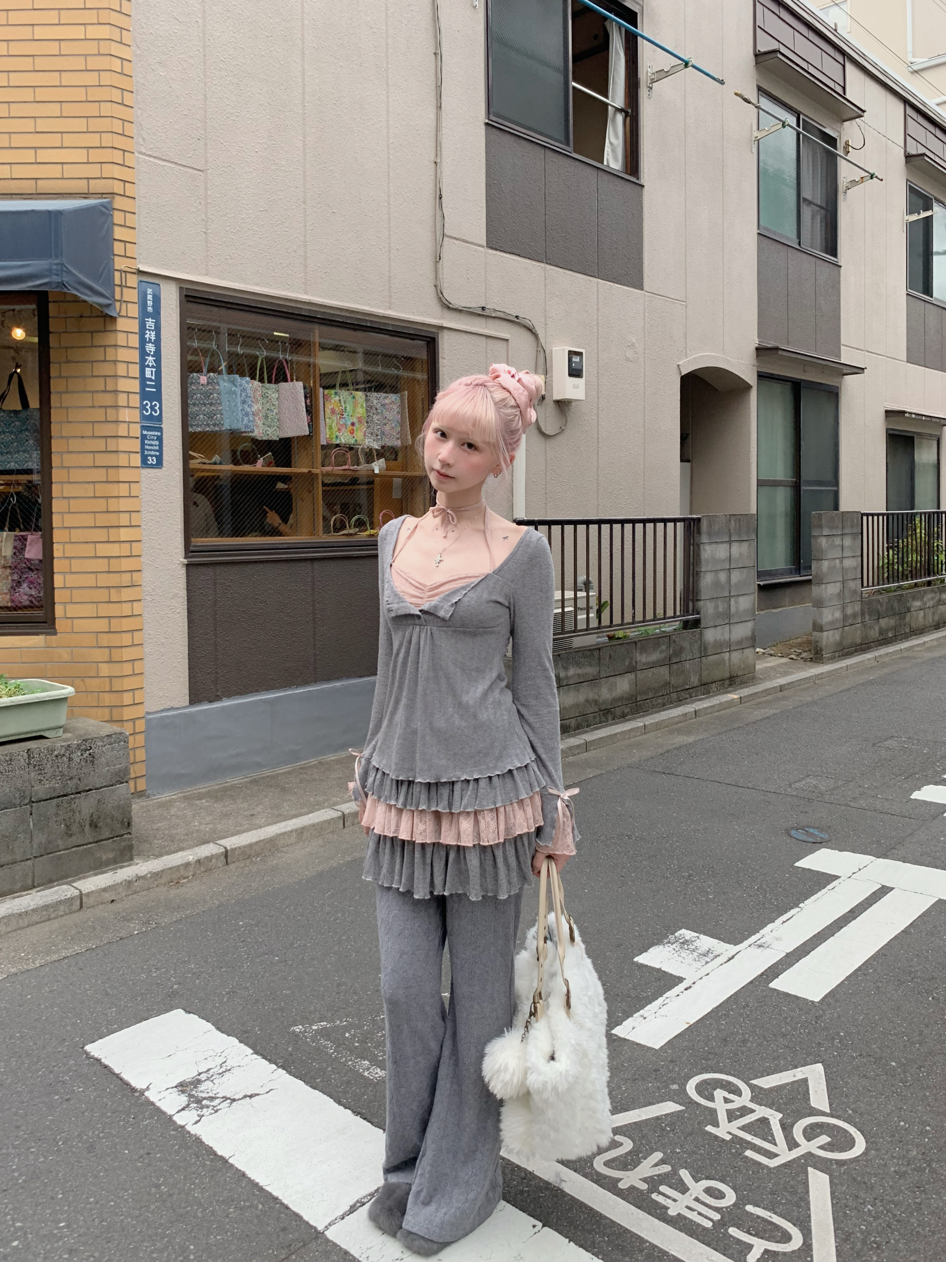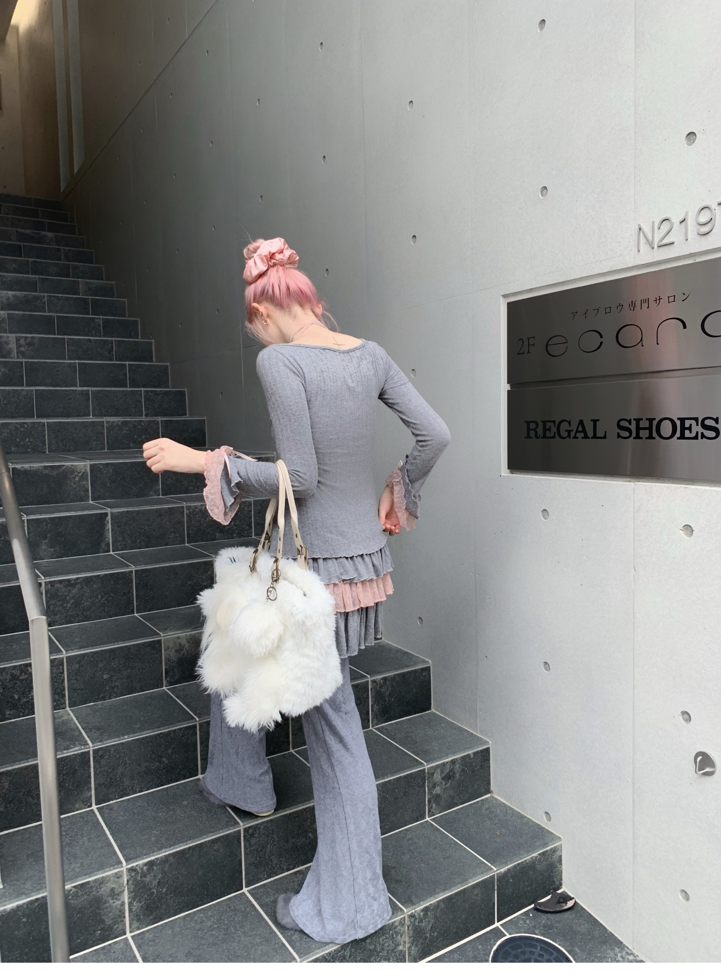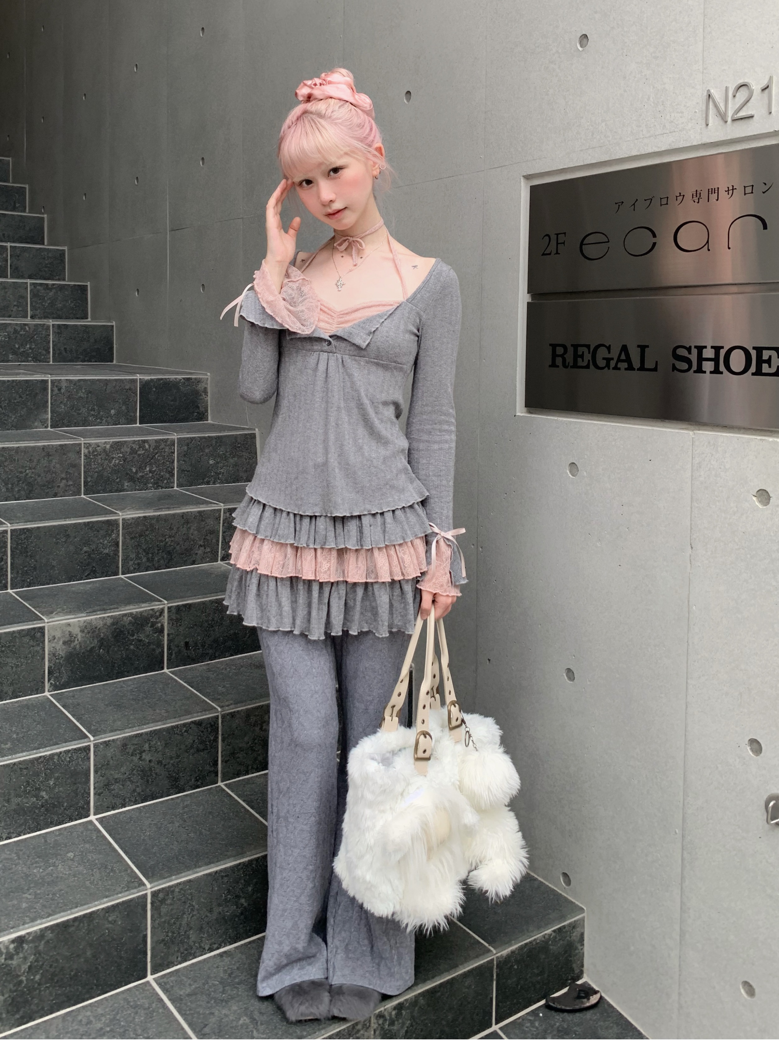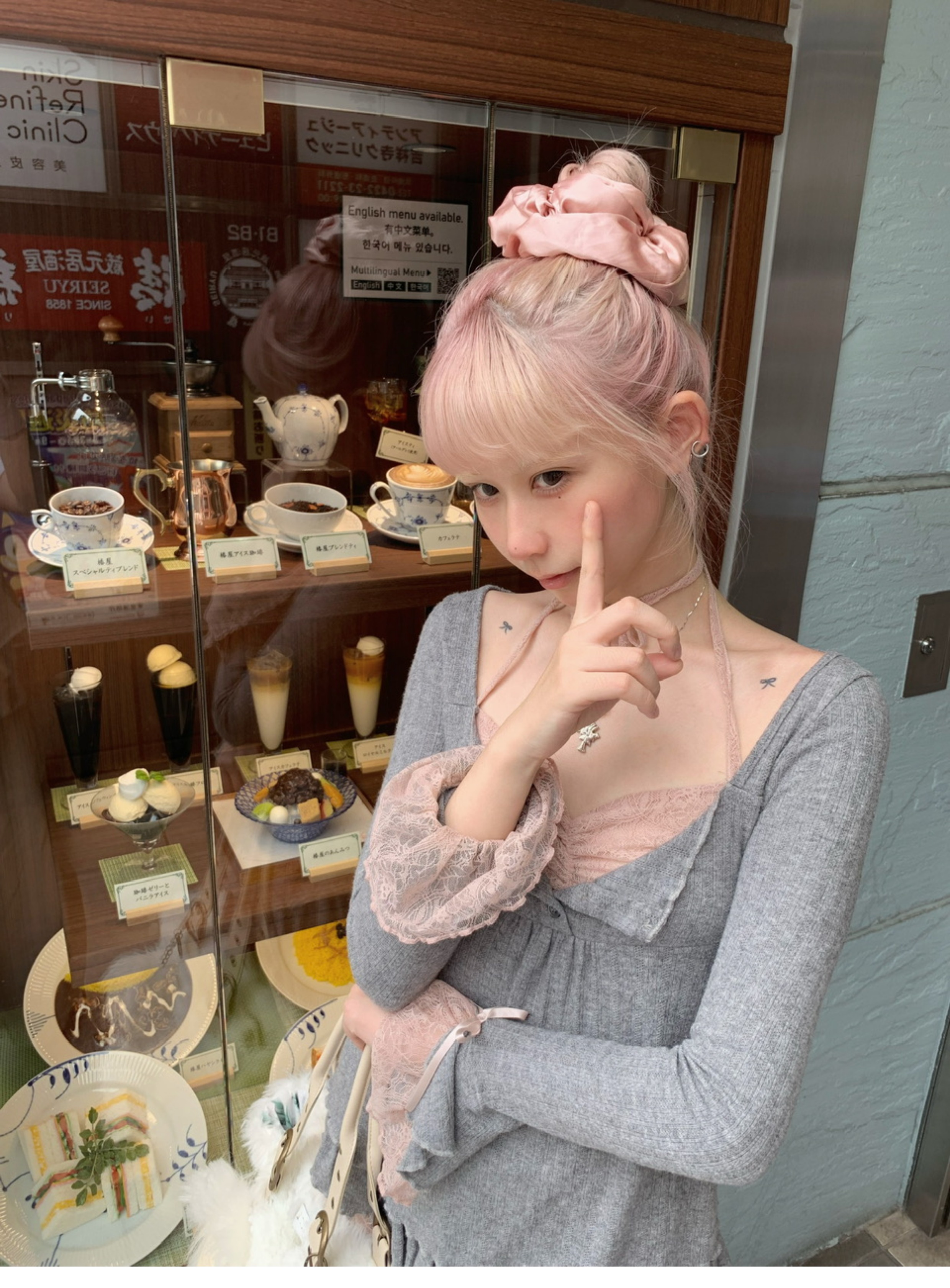 MonddoM•原创灰色针织拼接粉色蕾丝系带蝴蝶结修身针织衫打底衫 [Original Page Link]