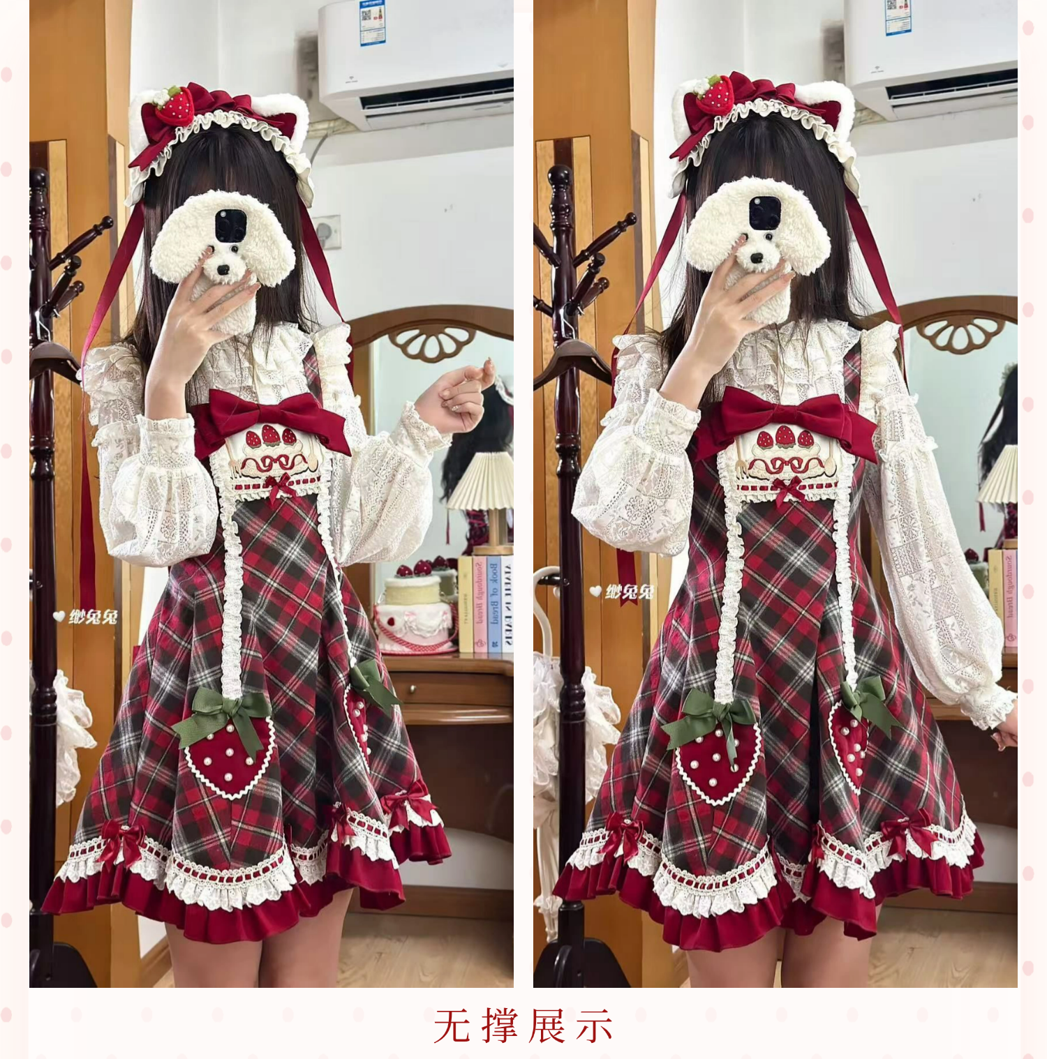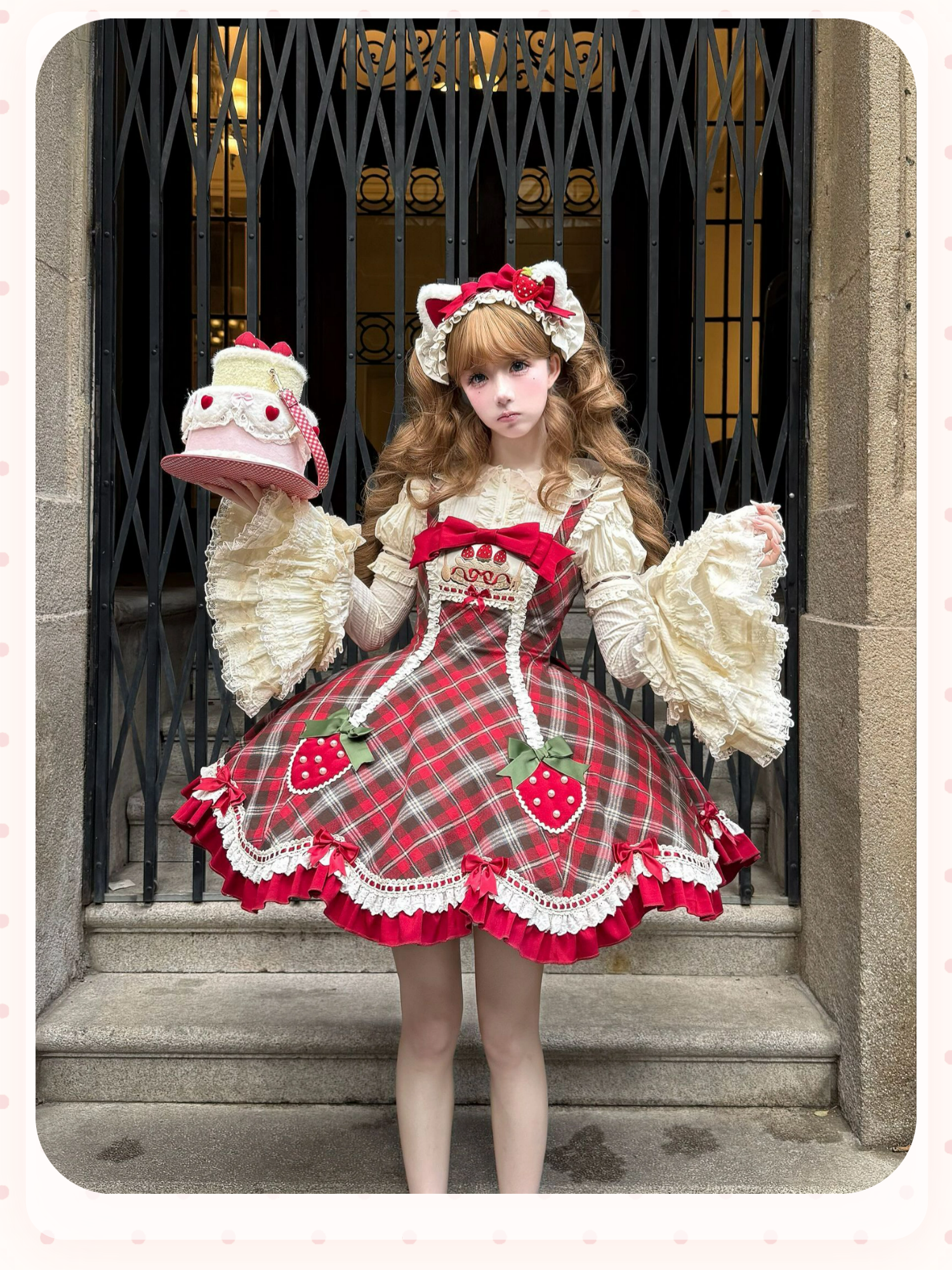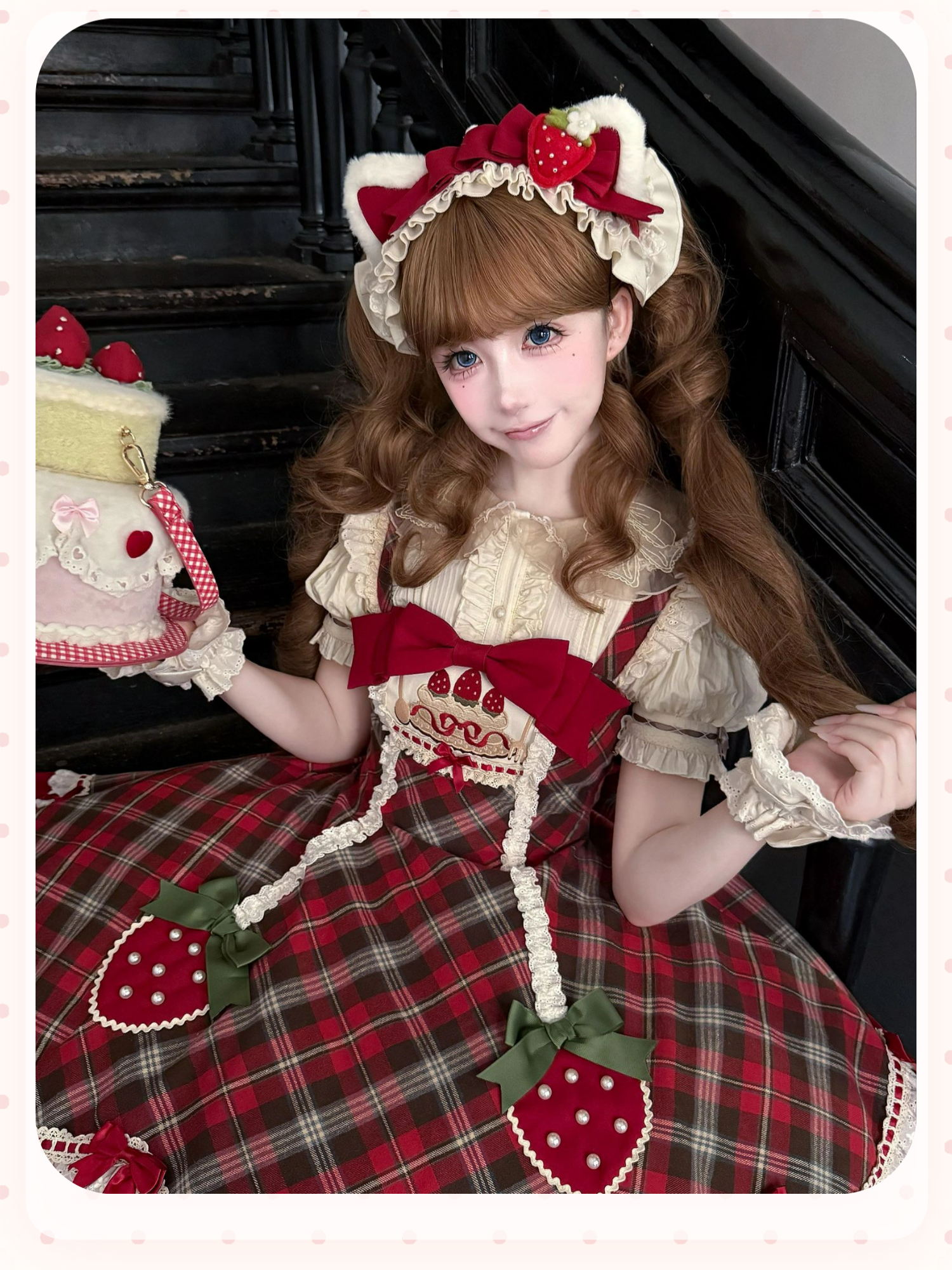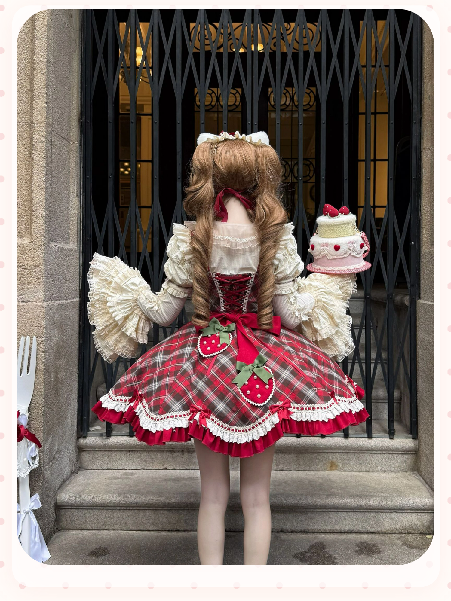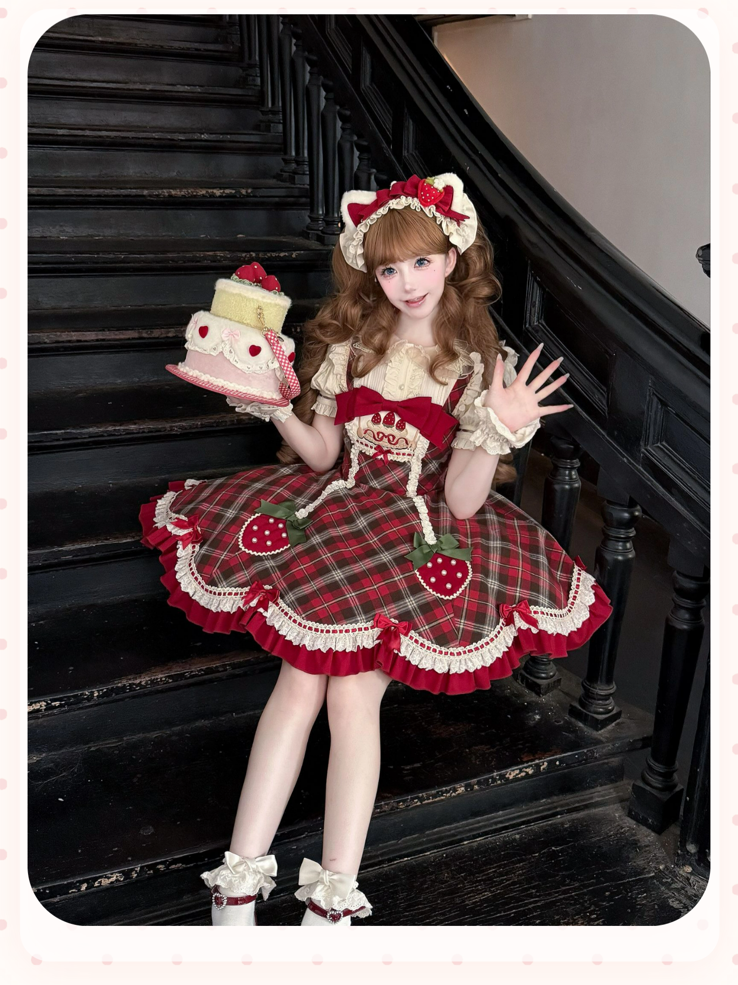 定金】珍莓匣 樱姬lolita原创设计 格纹草莓钉珠片裁设计lolita [Original Page Link]