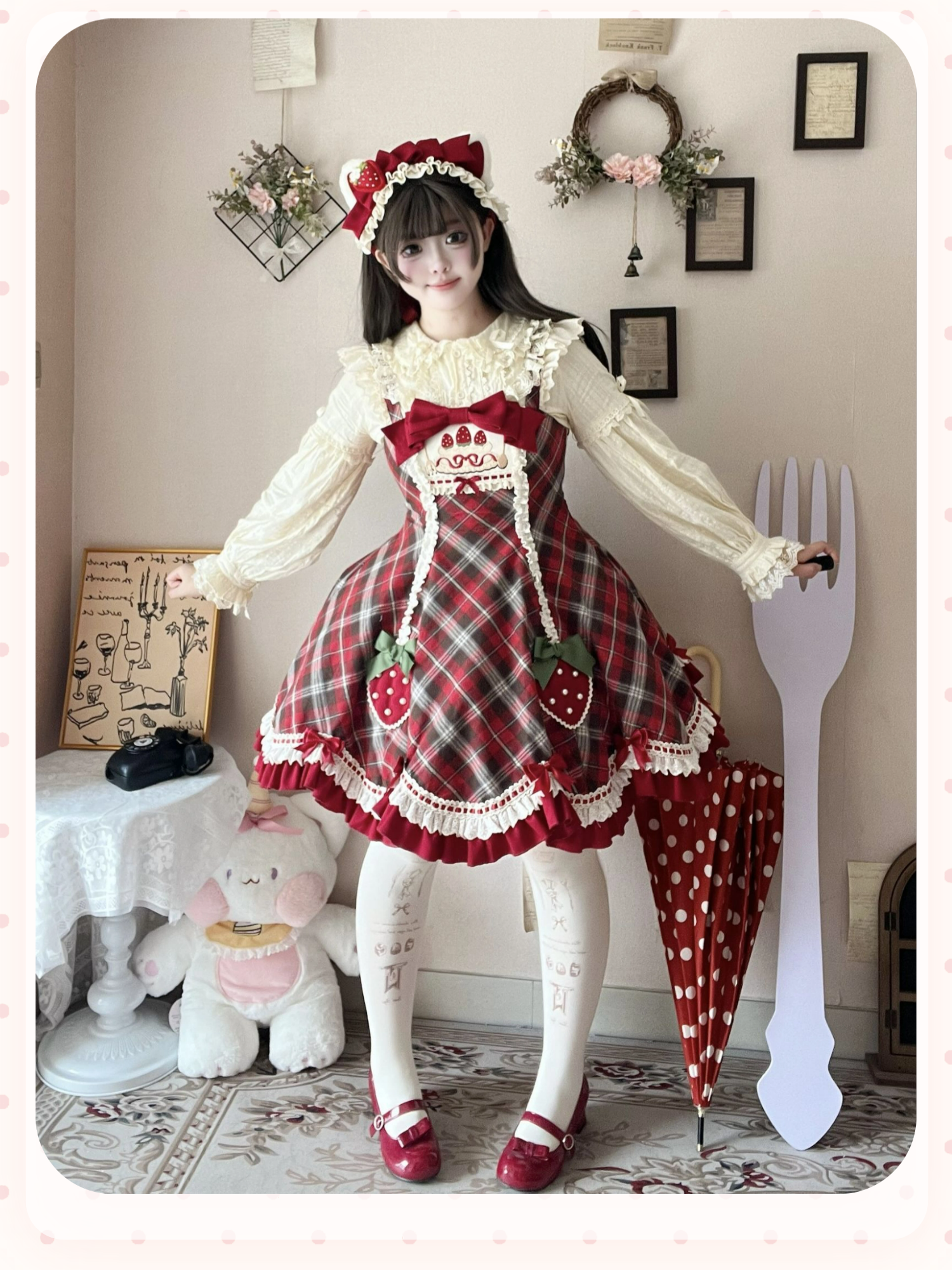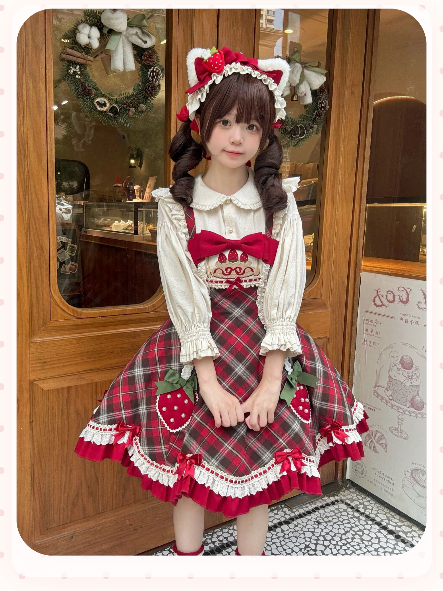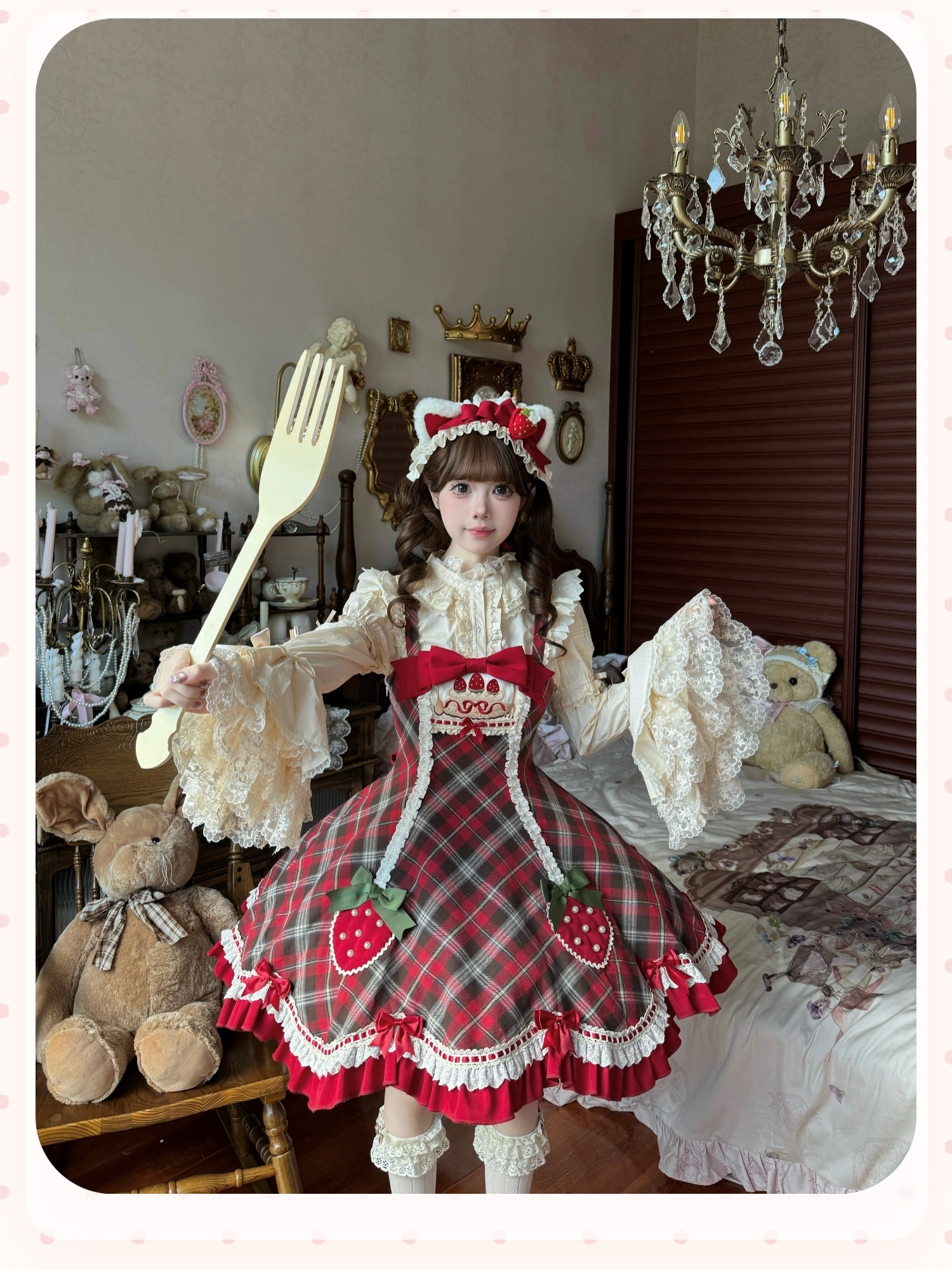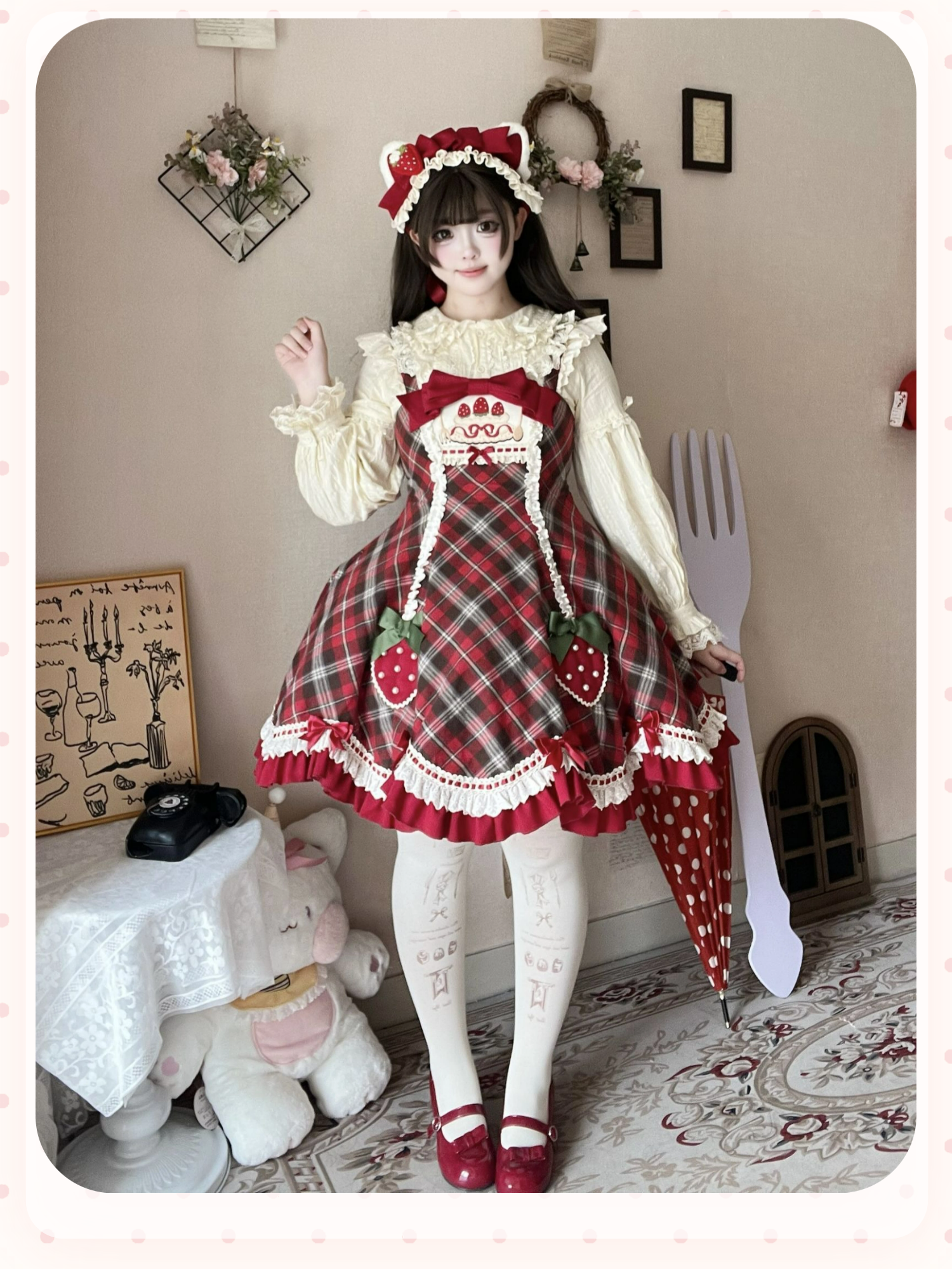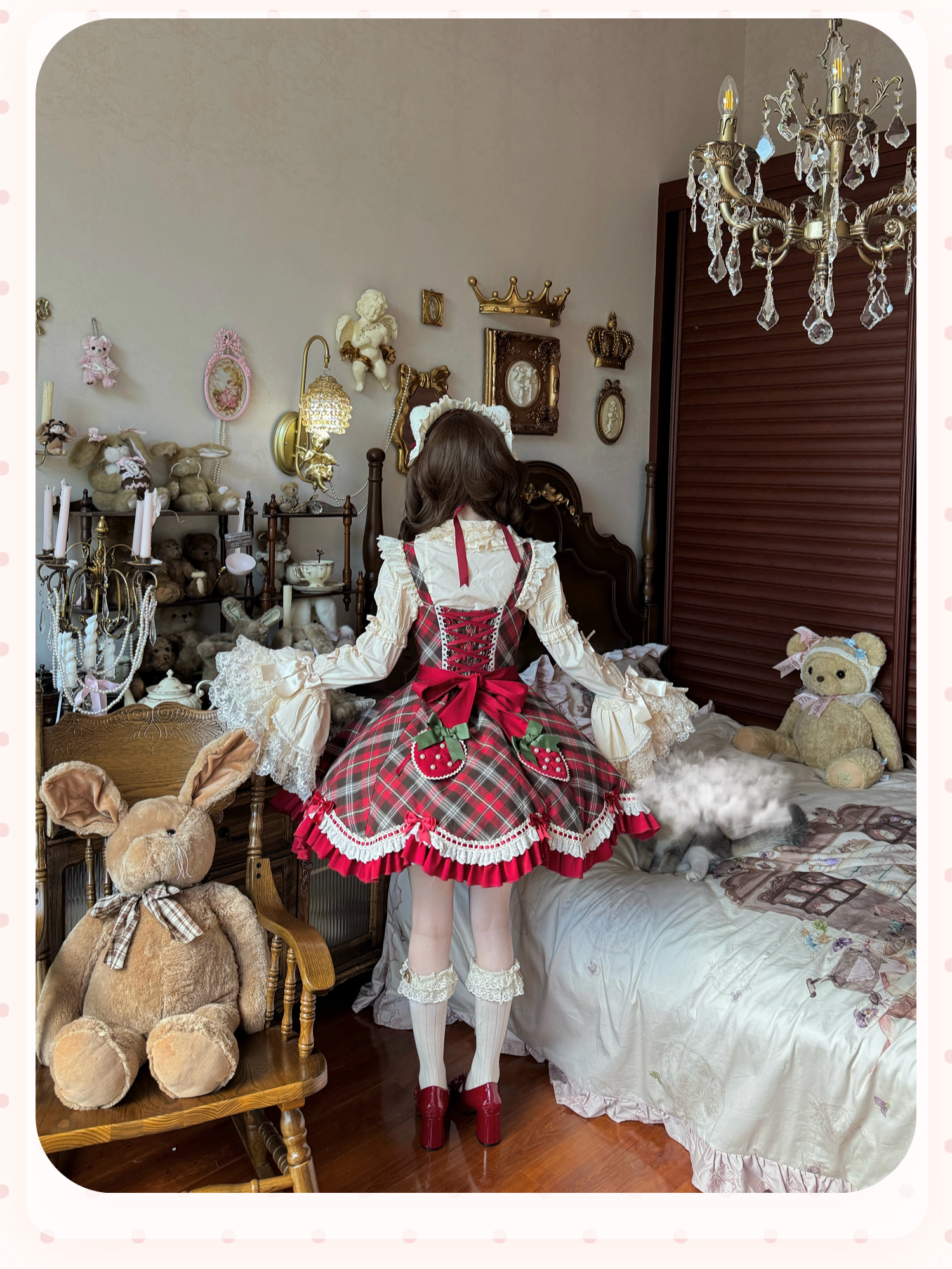 定金】珍莓匣 樱姬lolita原创设计 格纹草莓钉珠片裁设计lolita [Original Page Link]