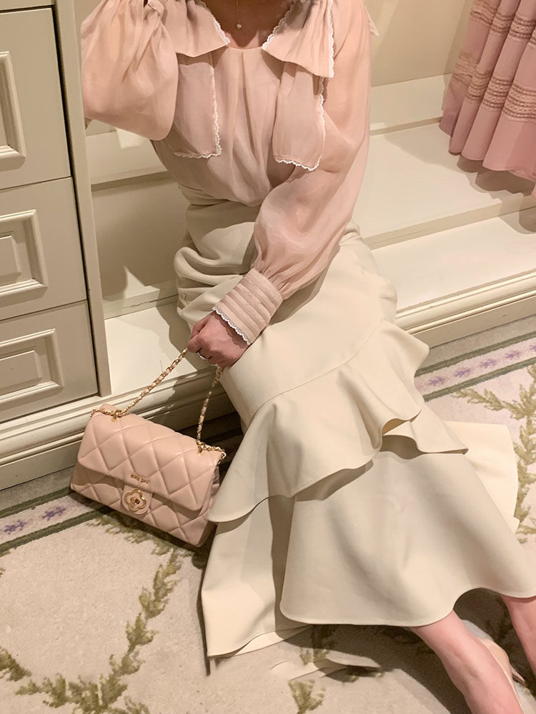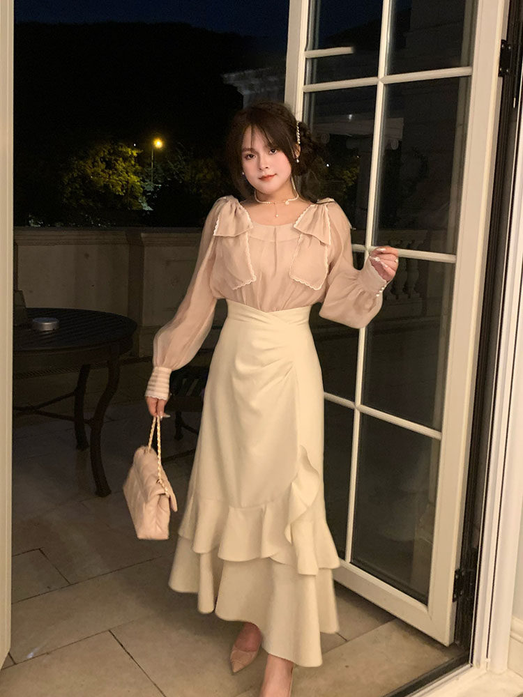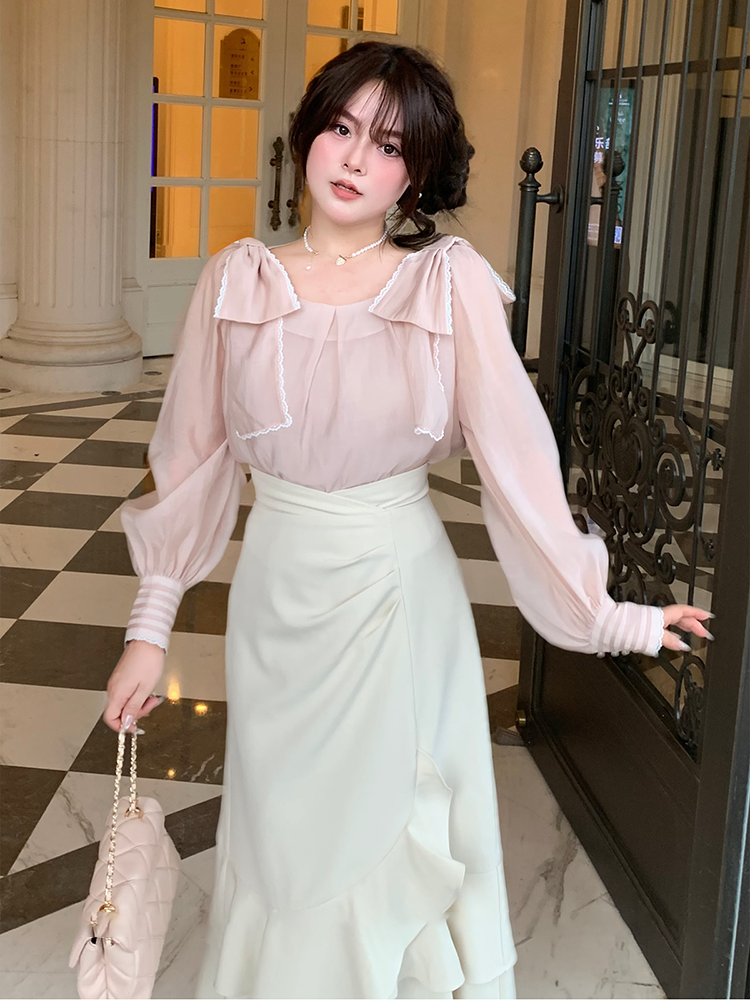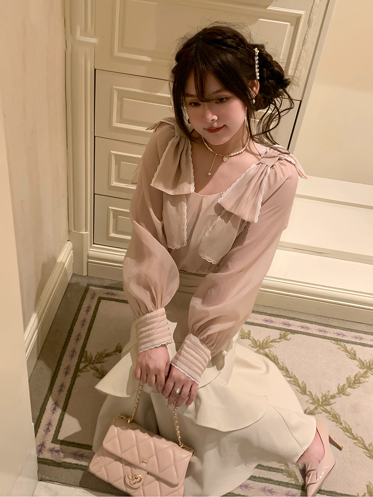 日系清楚系温柔套装女秋季蝴蝶结长袖衬衫+不规则鱼尾长裙两件套 [Original Page Link]