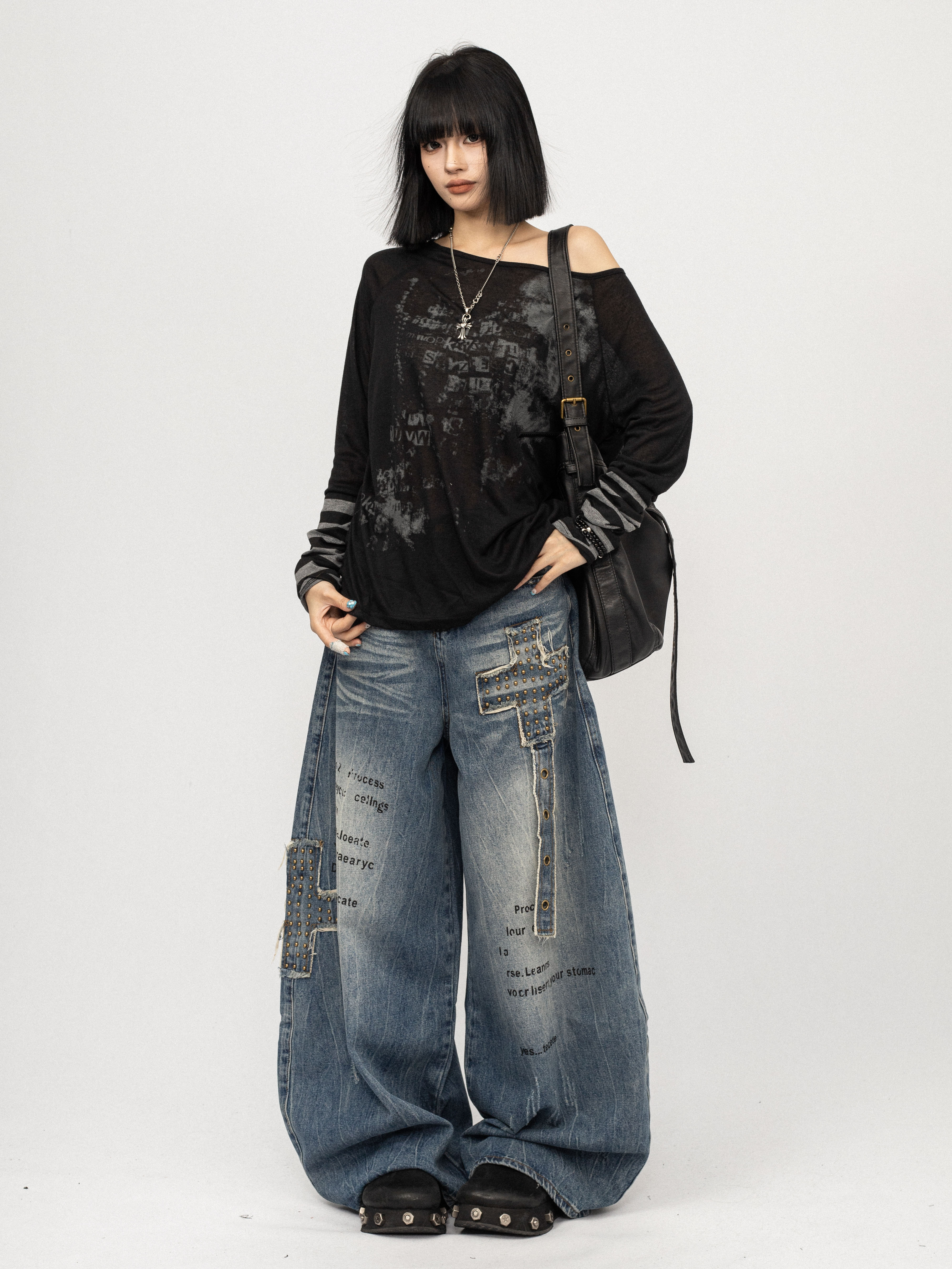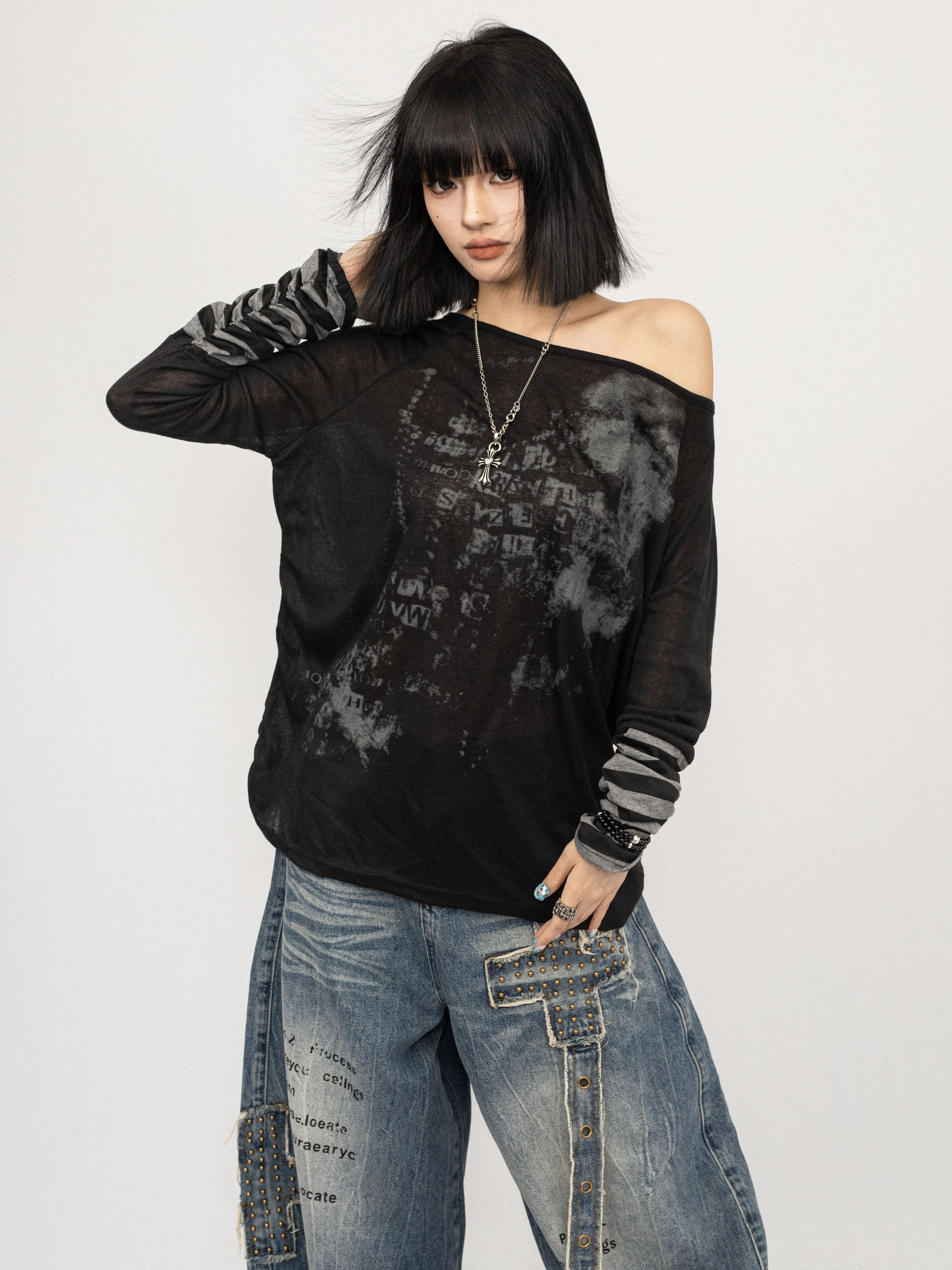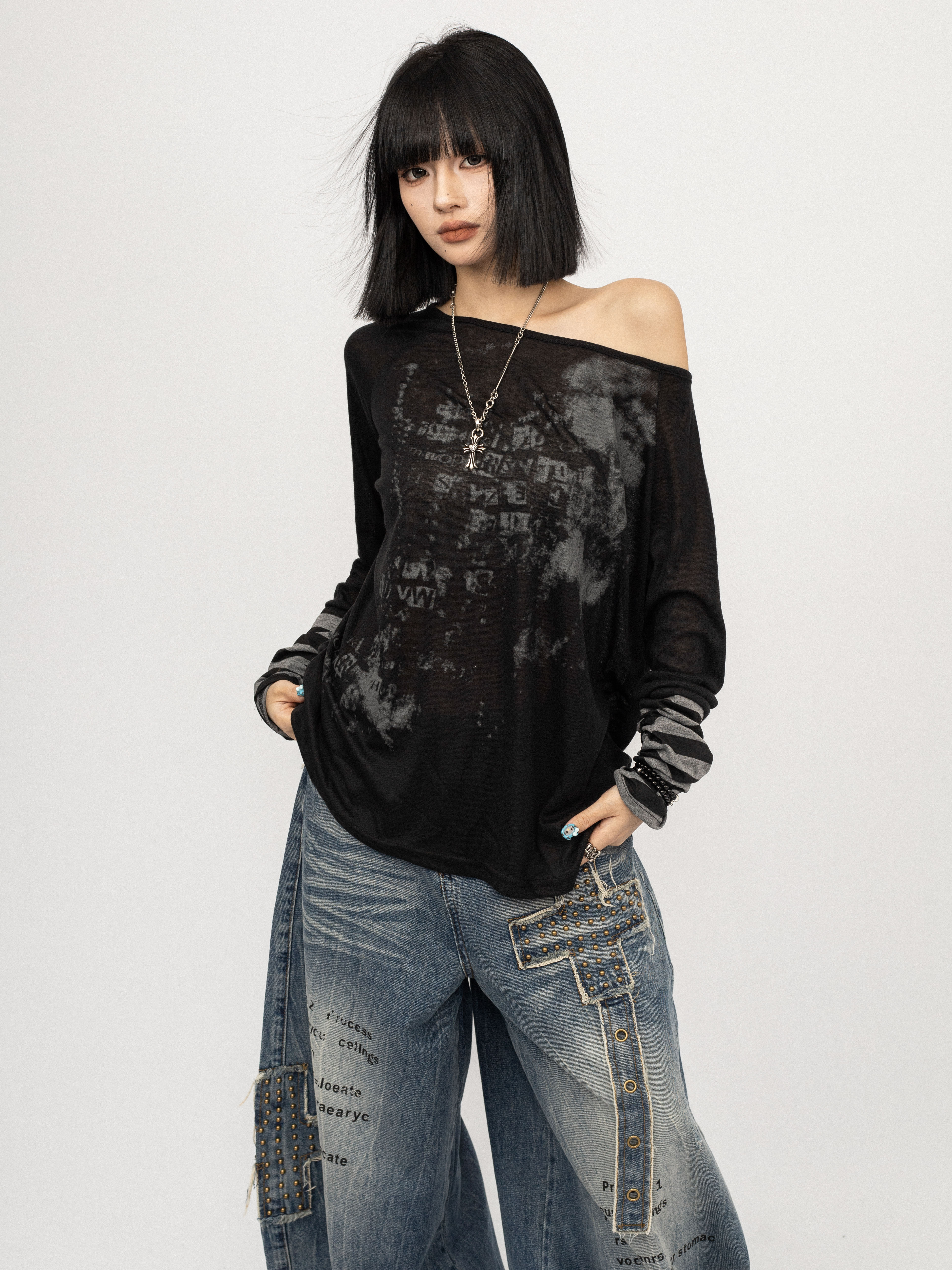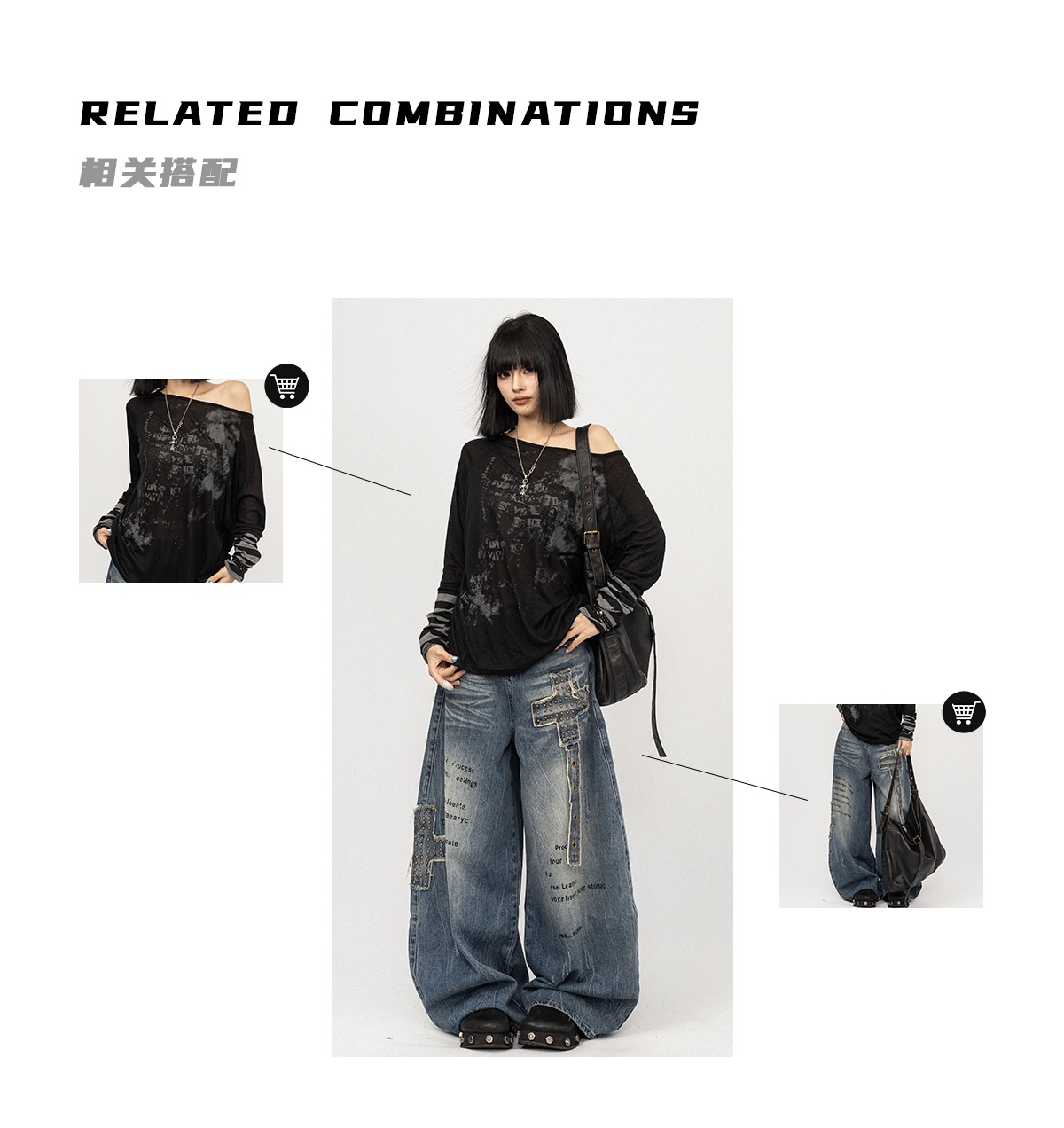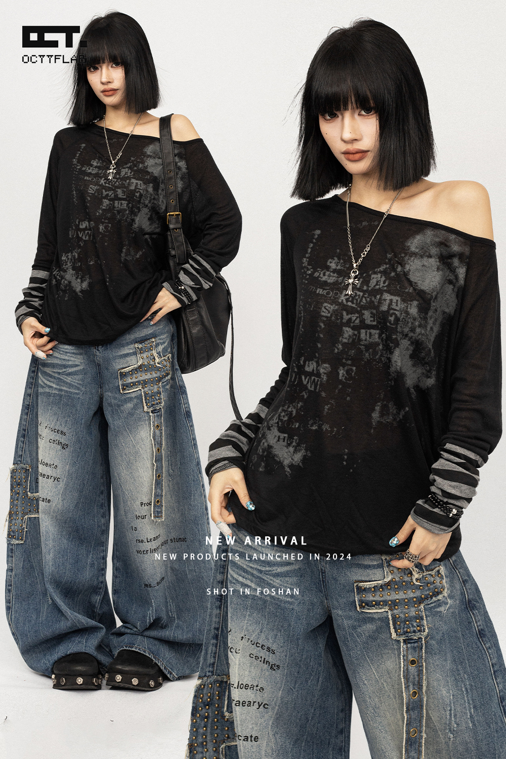 OCTTFLAB美式覆古辣妹轻亚露肩长袖黑色上衣女秋宽松甜酷打底T恤 [Original Page Link]