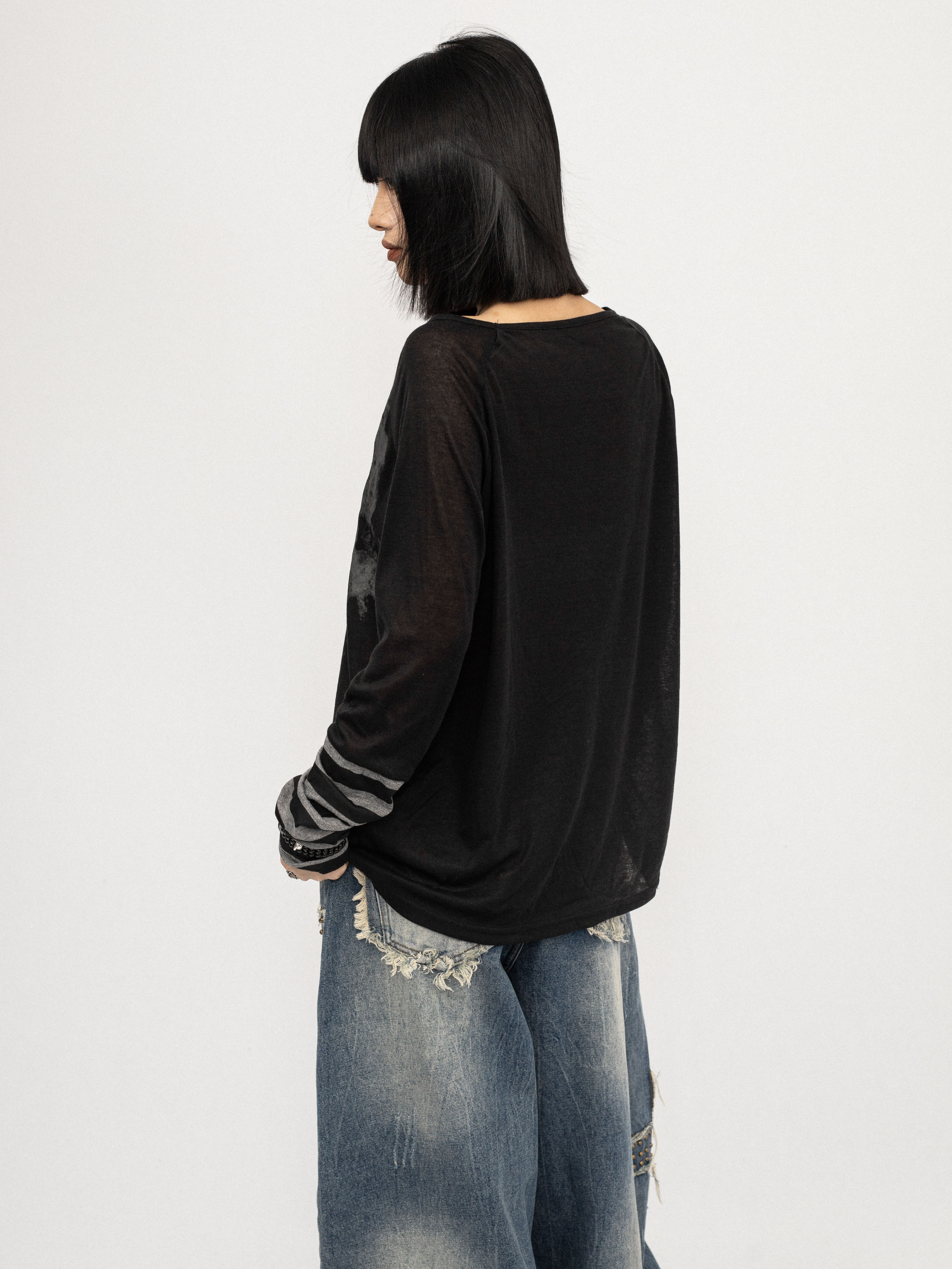 OCTTFLAB American Retro Sexy Light Asian Off-Shoulder Long Sleeve Black Top Women's Autumn Loose Sweet and Cool Base T-Shirt