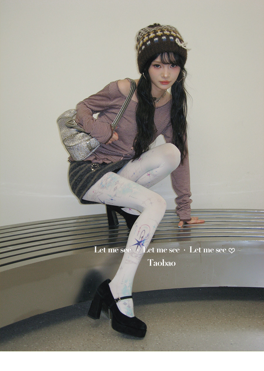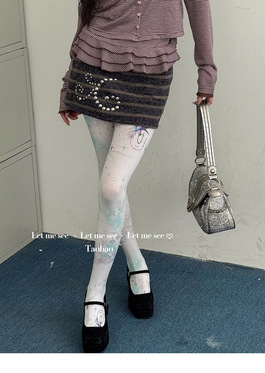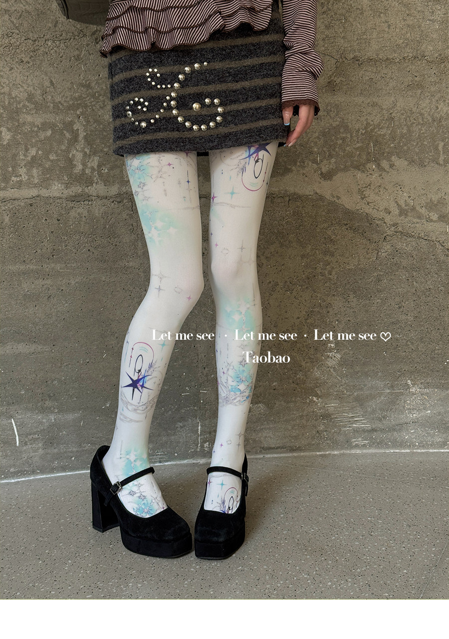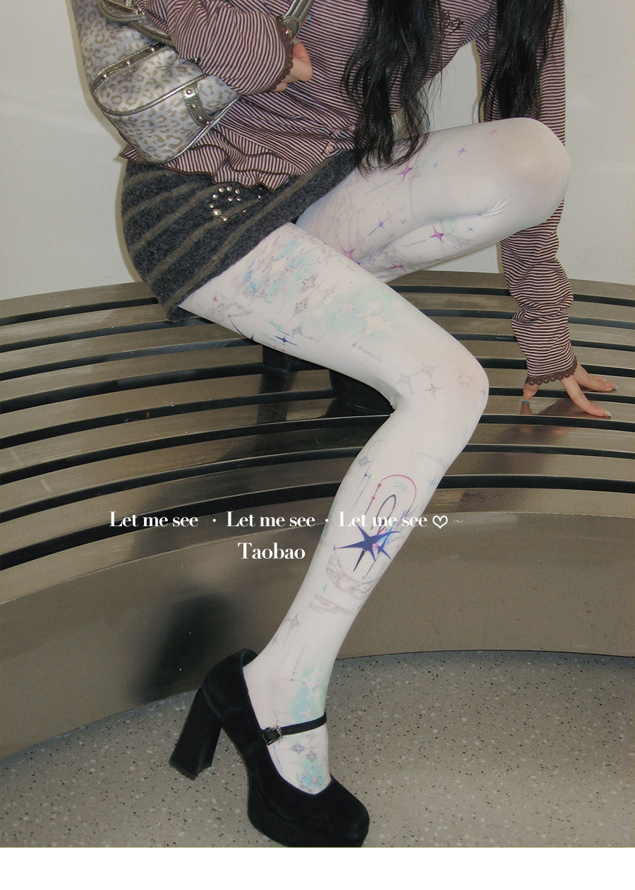 LET ME SEE 自制日系辣妹印花连裤袜 亚文化图案小众白色打底袜子 [Original Page Link]
