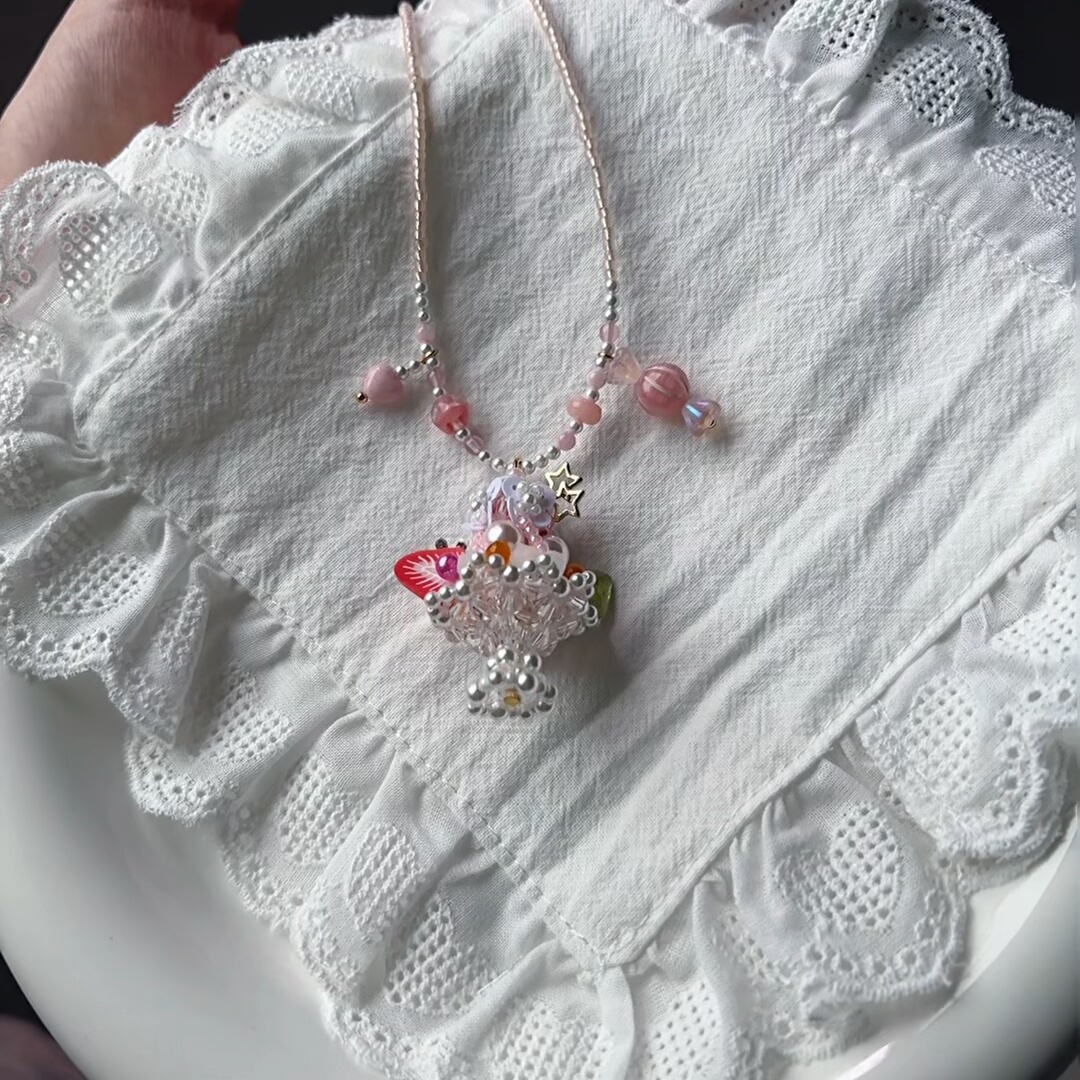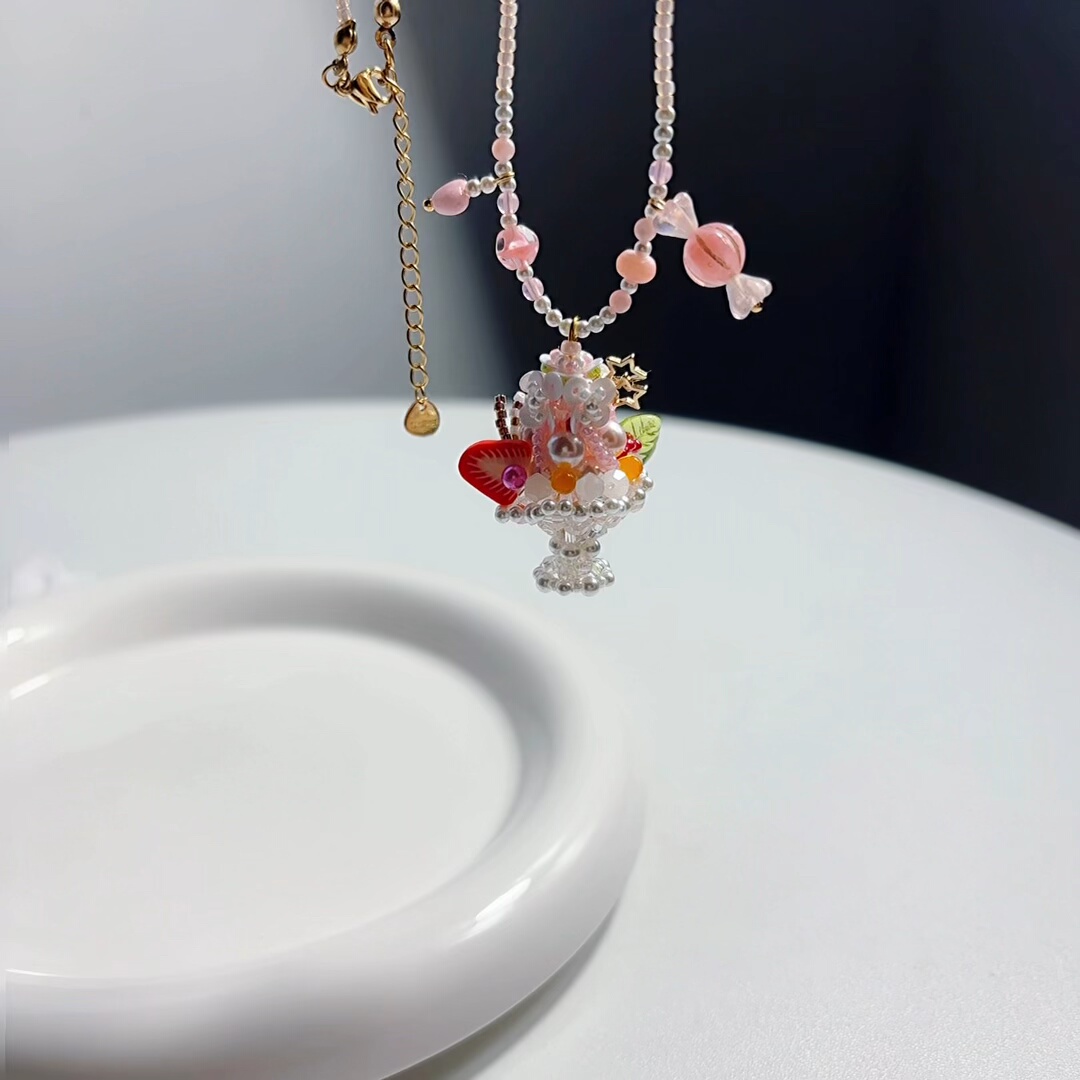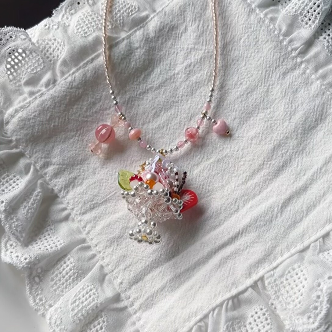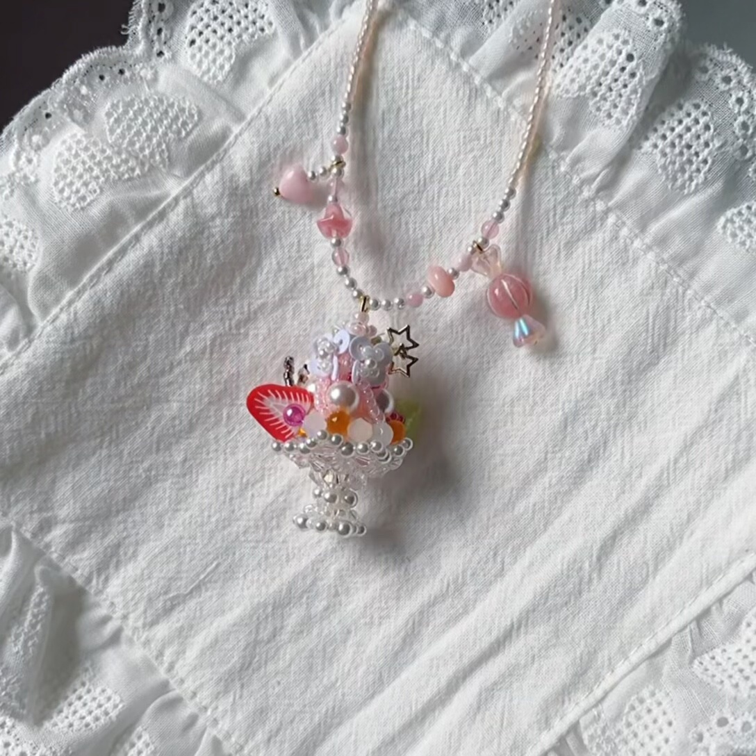 草莓大圣代 冰激凌杯手工制作 可爱奶油风串珠长款项链54加5厘米 [Original Page Link]