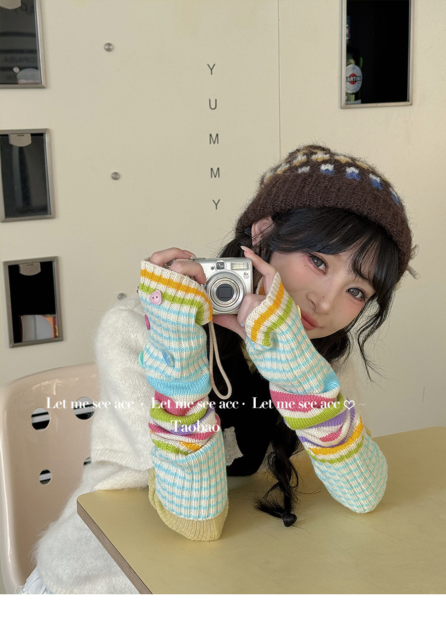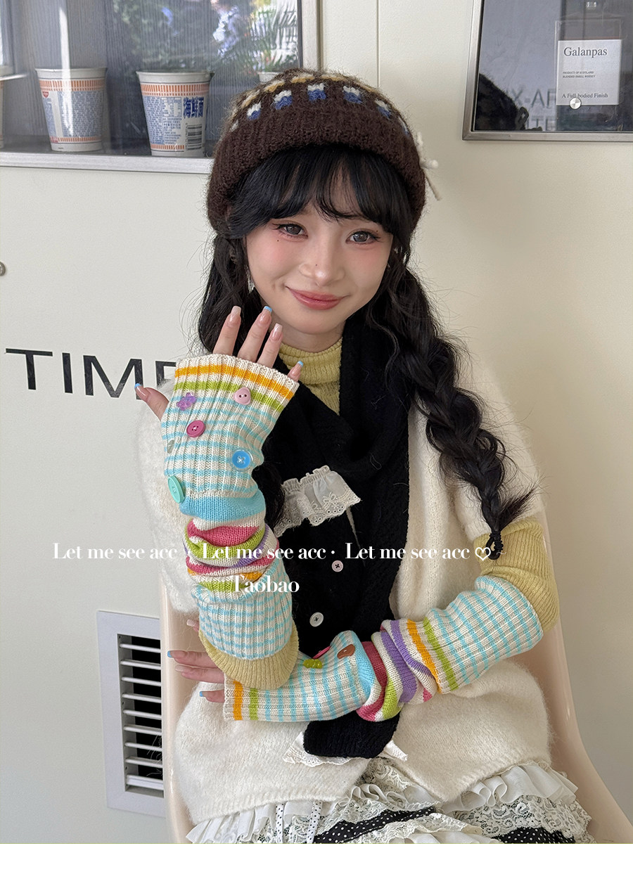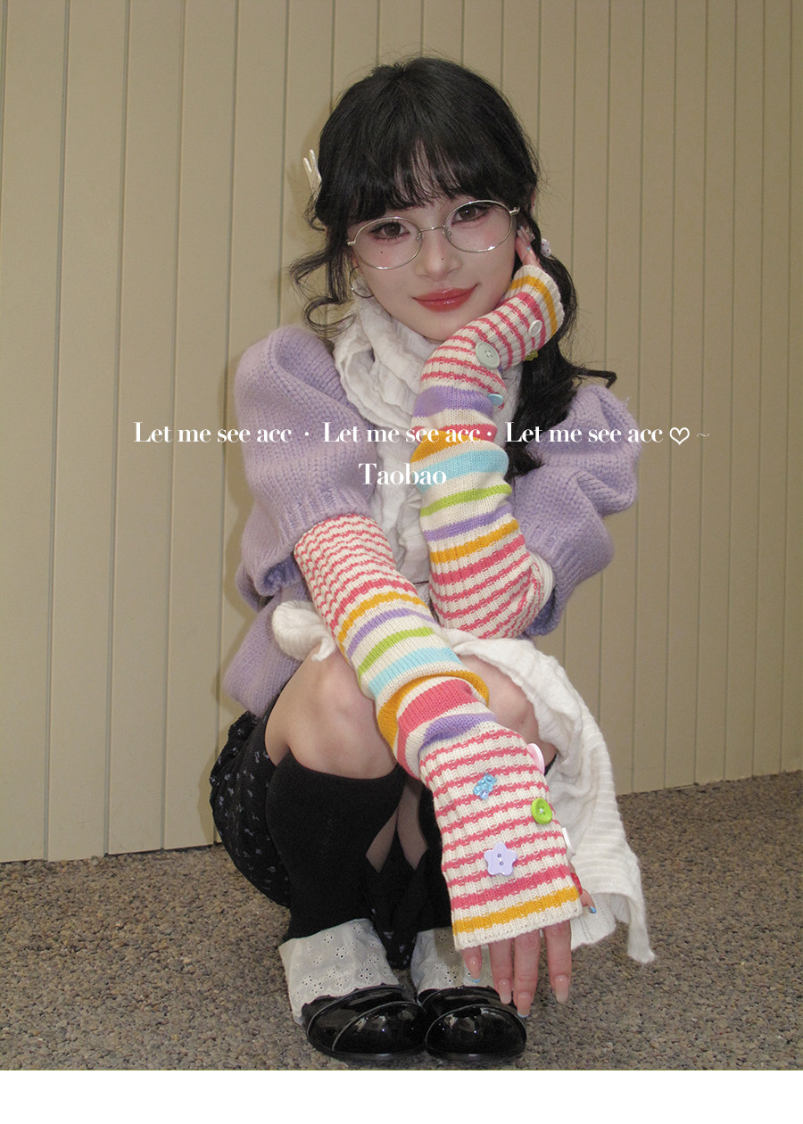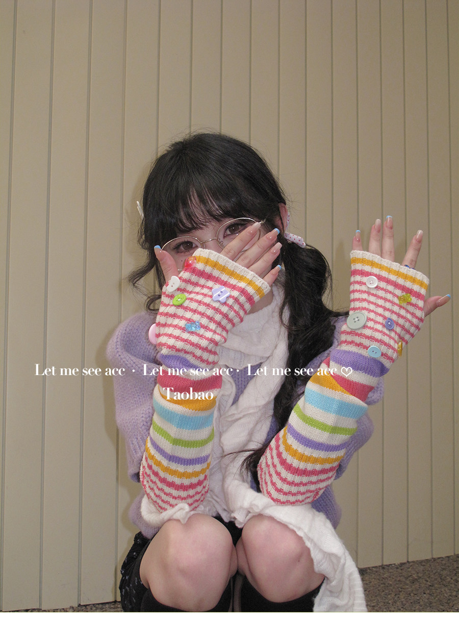 LET ME SEE Acc 彩色纽扣针织手套 亚文化辣妹条纹袖套半指女手套 [Original Page Link]
