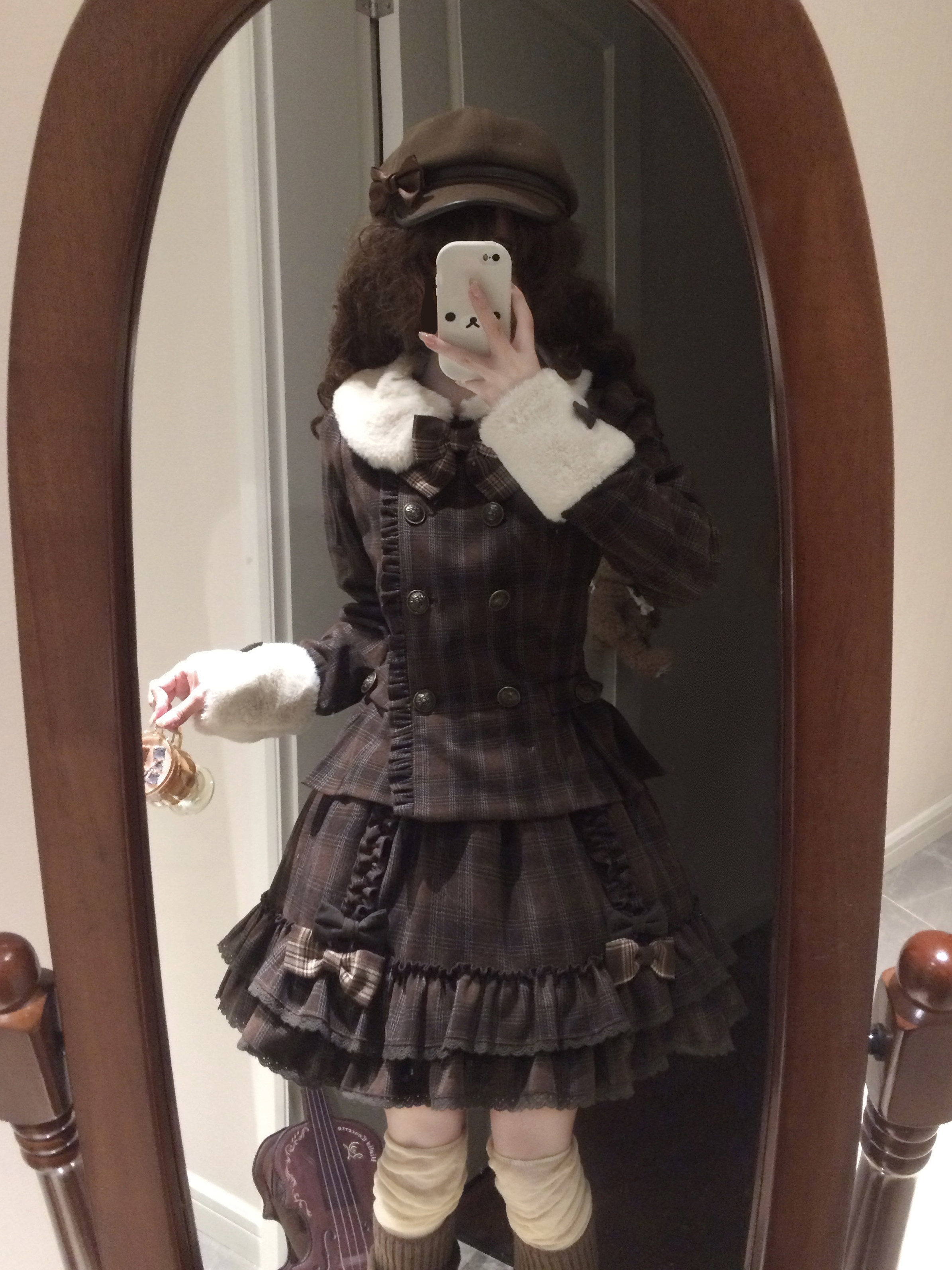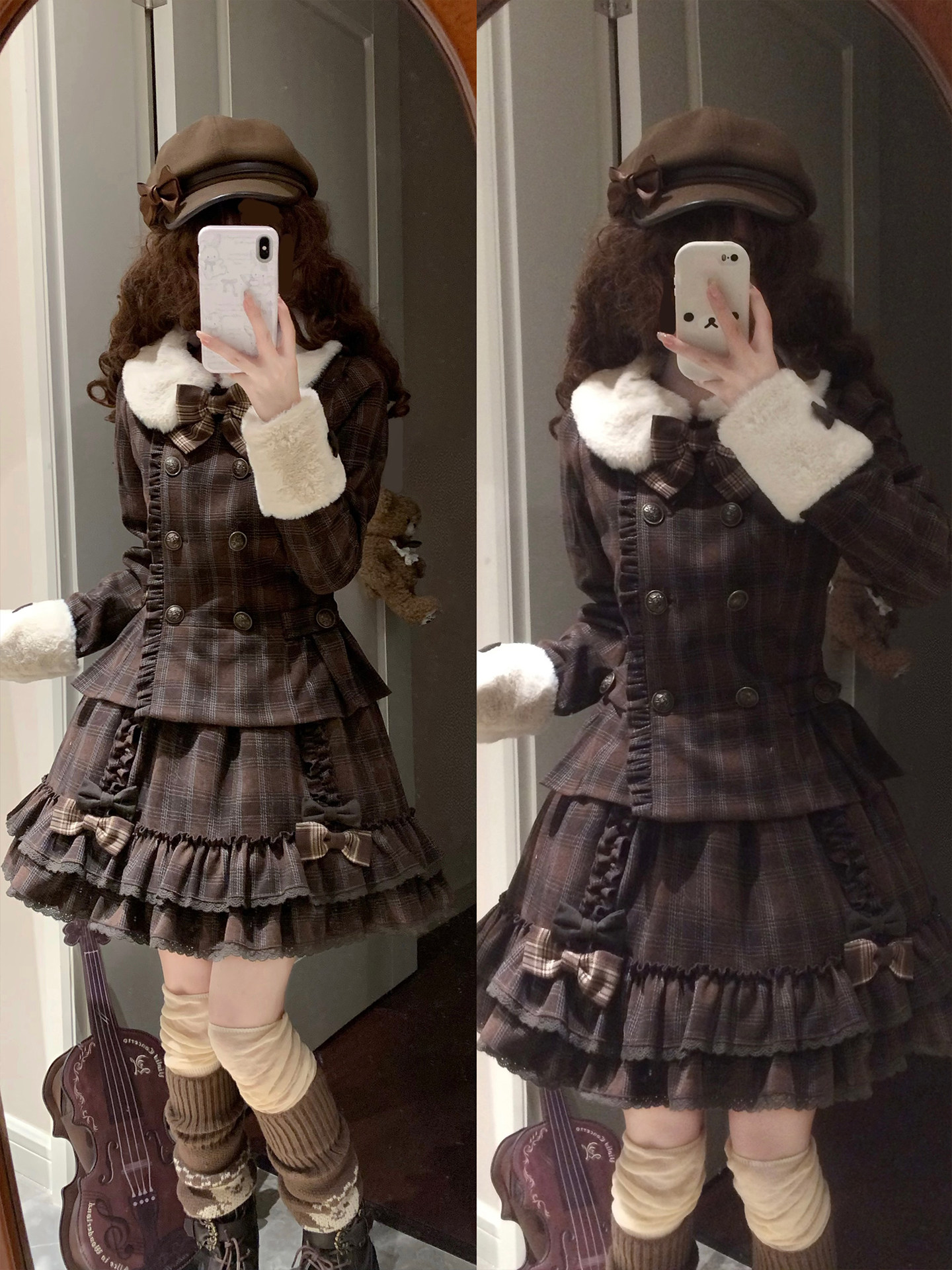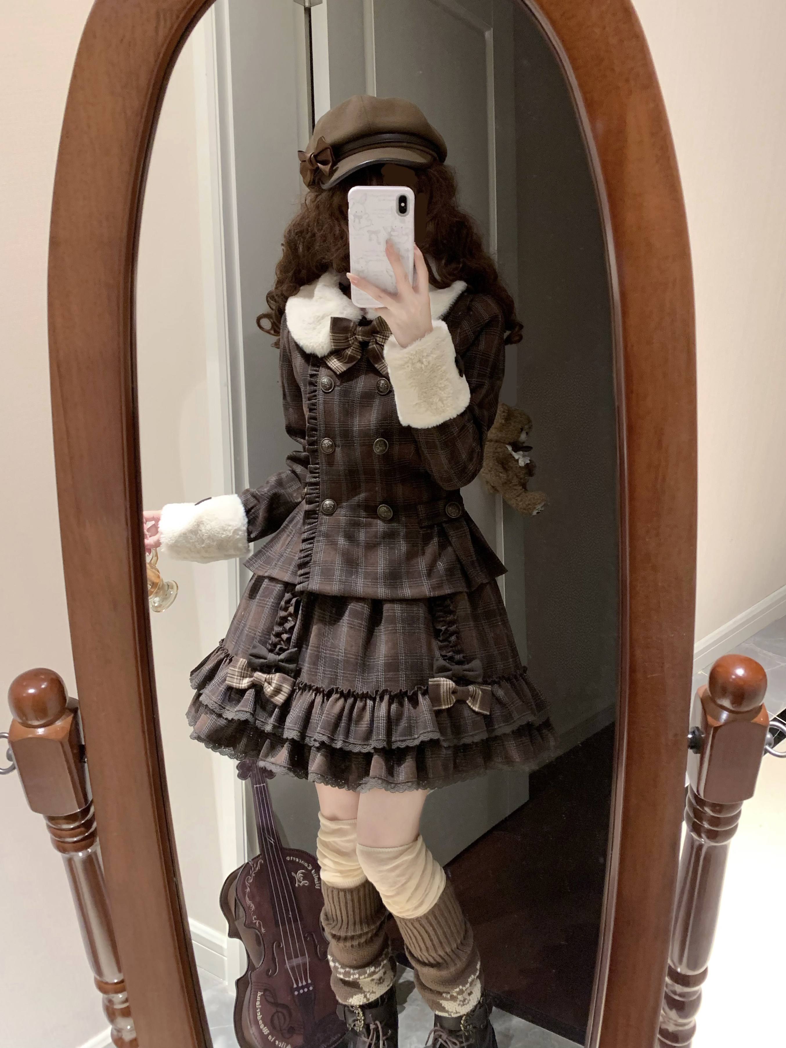 Chocolate sandwich two-piece suit for winter slim fit and warmth covered with ancient plaid fabric, sweet dream Lolita plaid