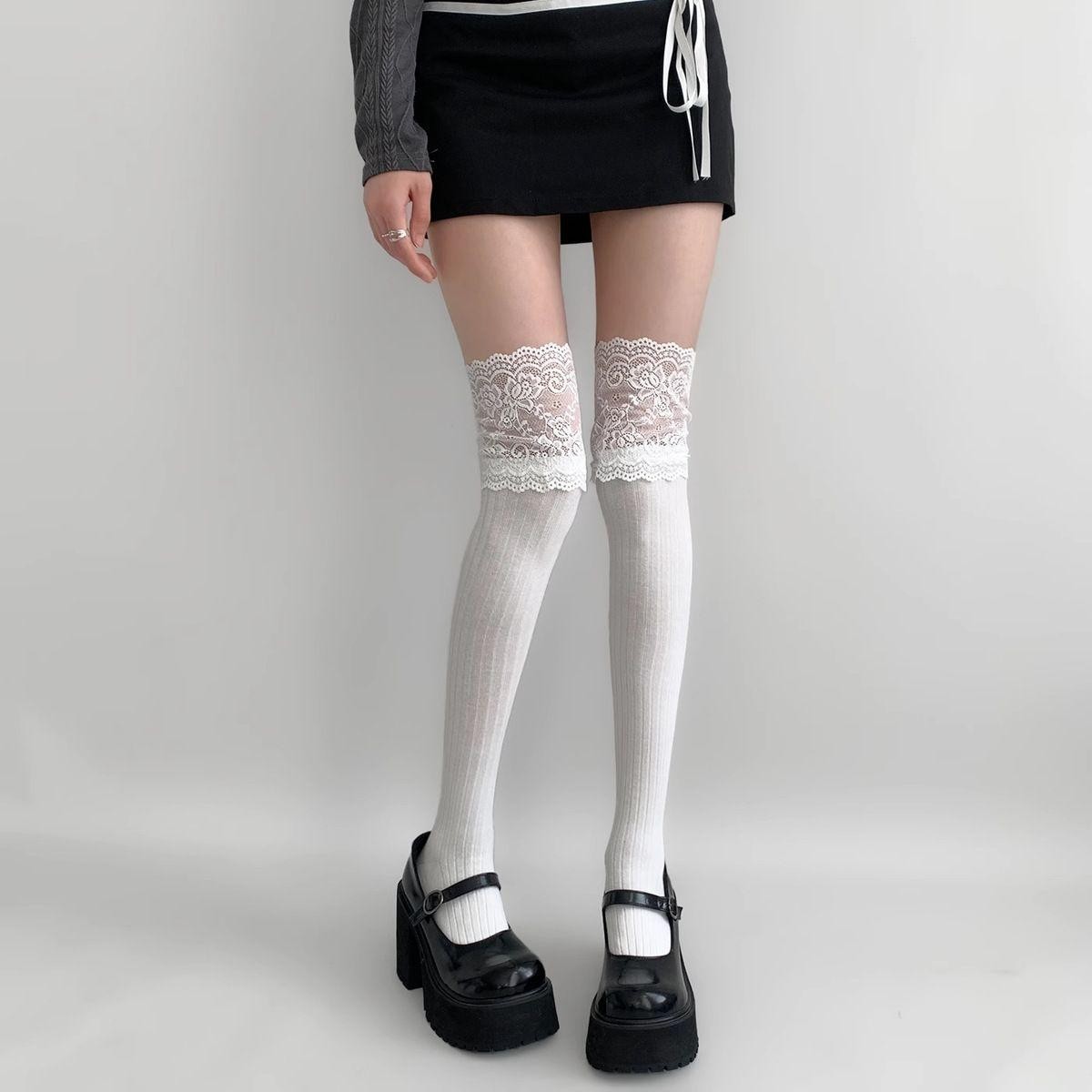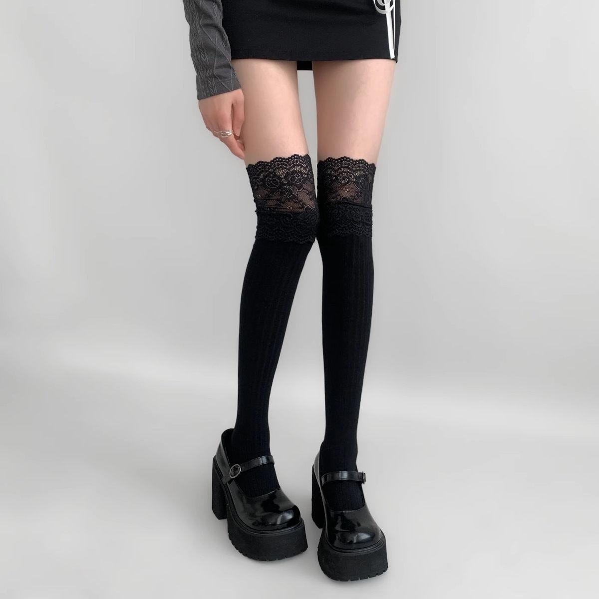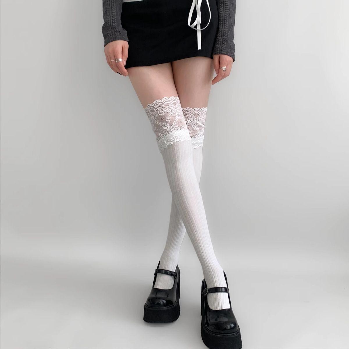 Lace-trimmed calf socks for women, spring and autumn long socks with boots, white over-the-knee socks, JK style black stockings for women.