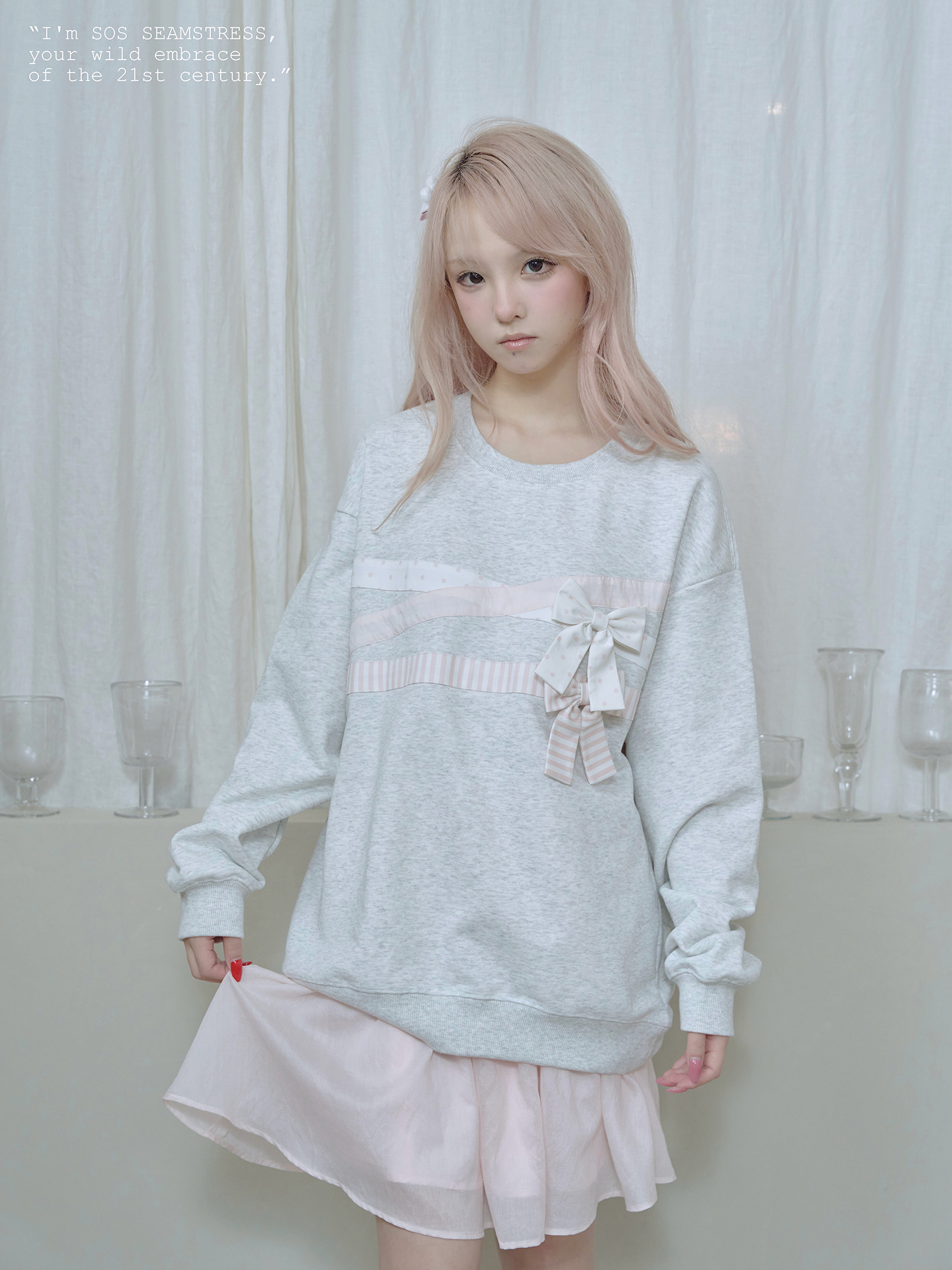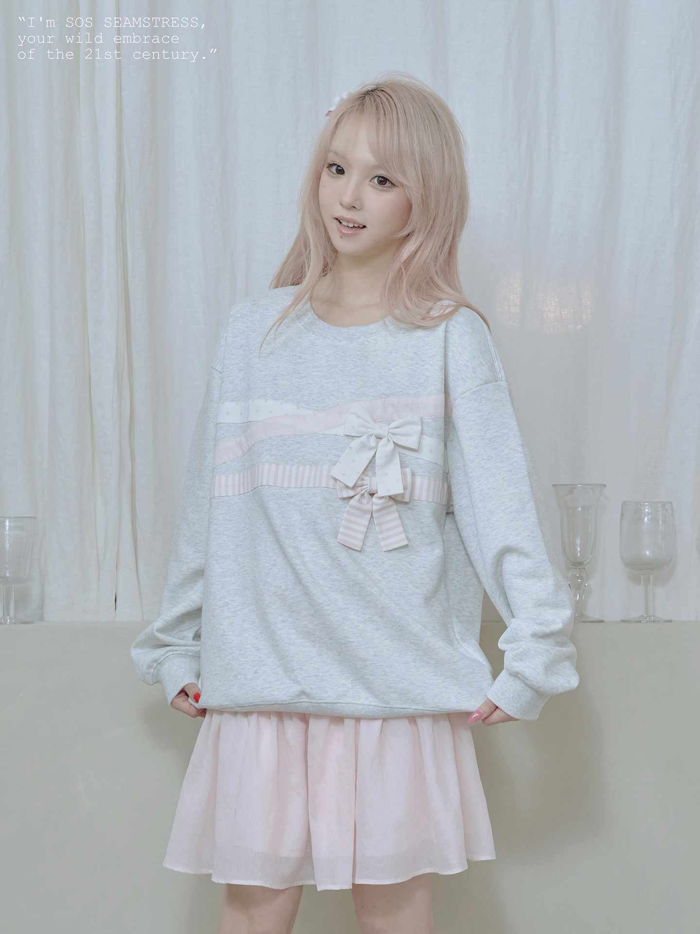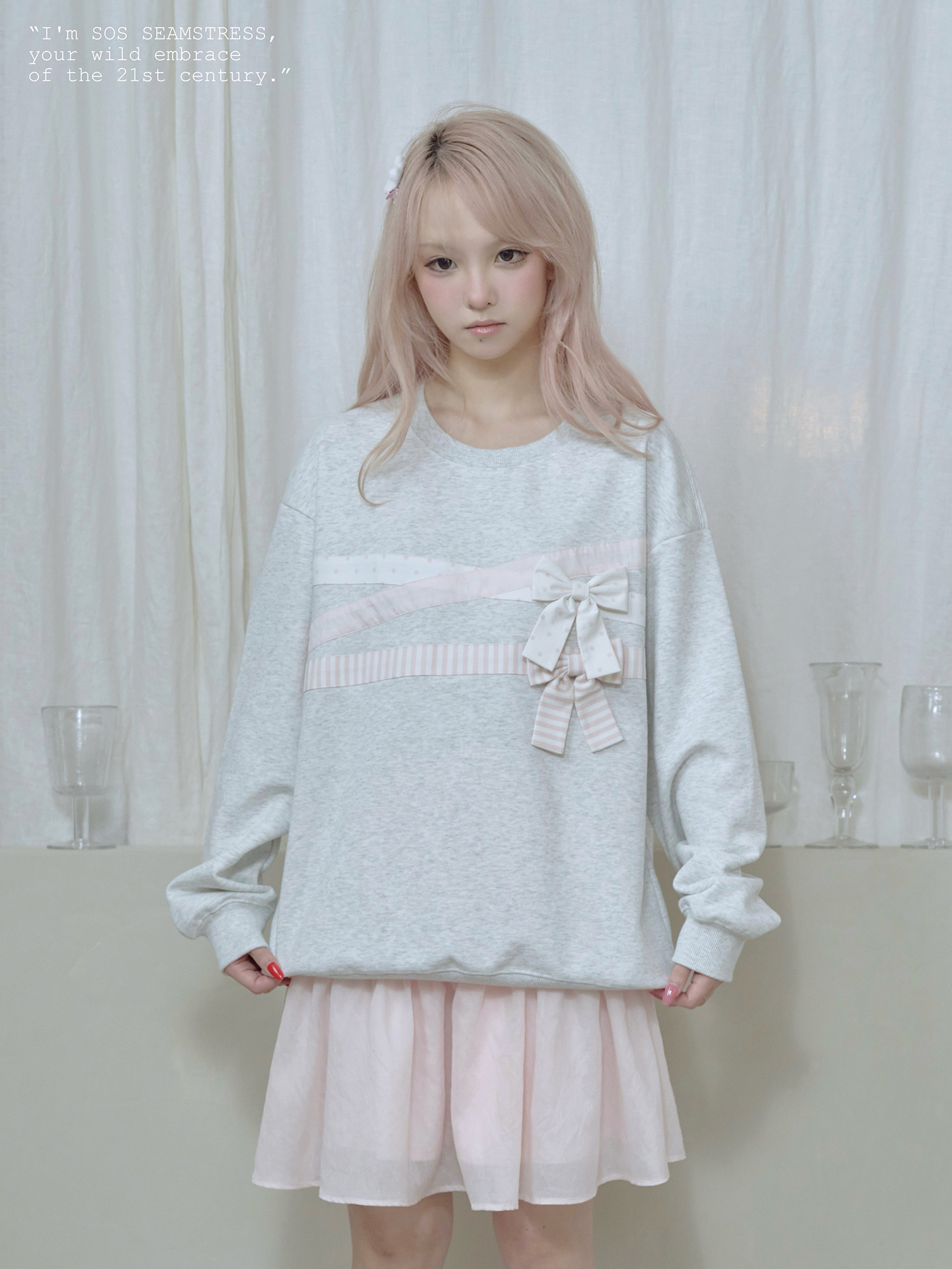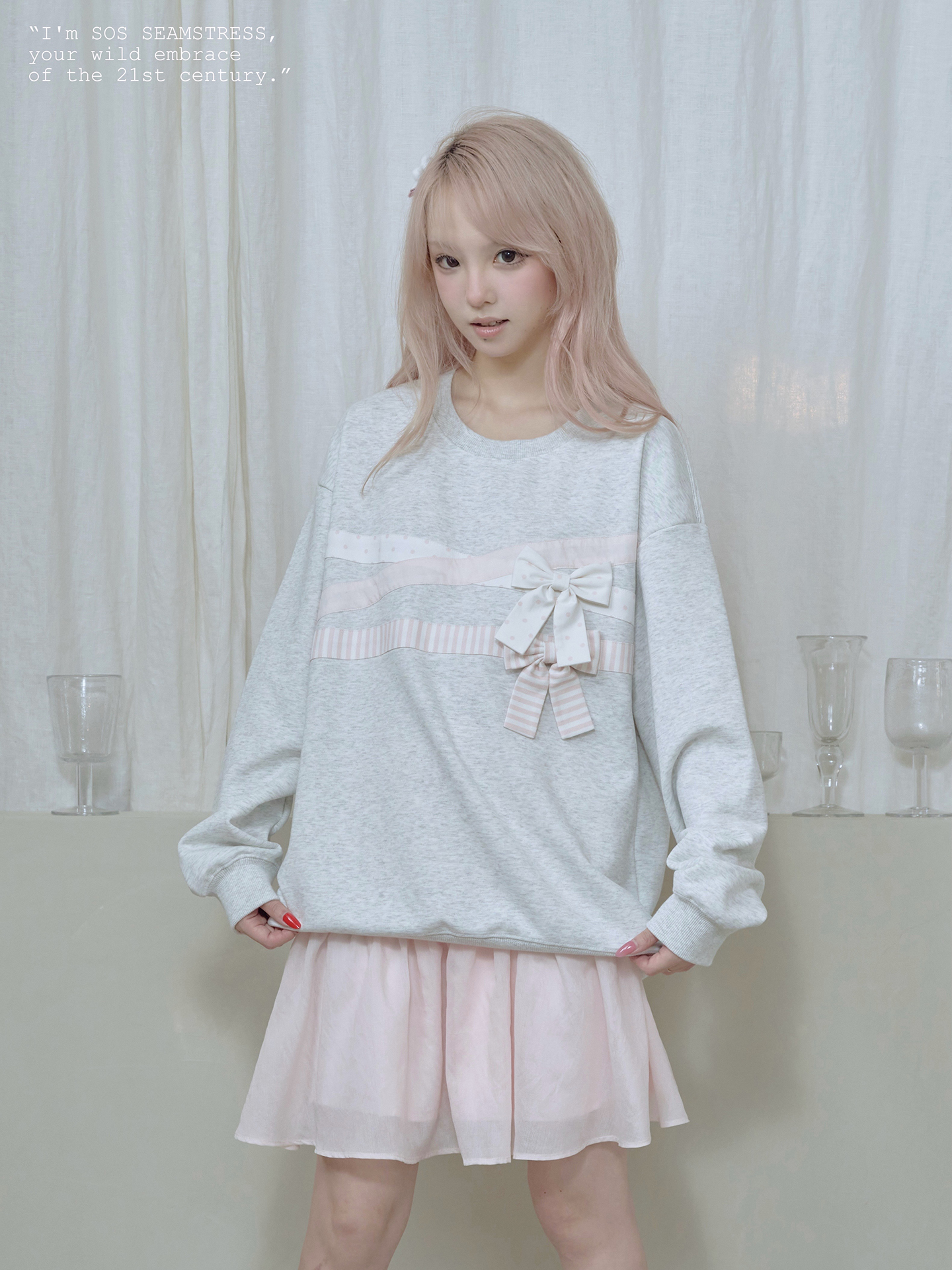 SOS SEAMSTRESS纯棉蝴蝶结波点拼接条纹卫衣宽松圆领套头长袖上衣 [Original Page Link]
