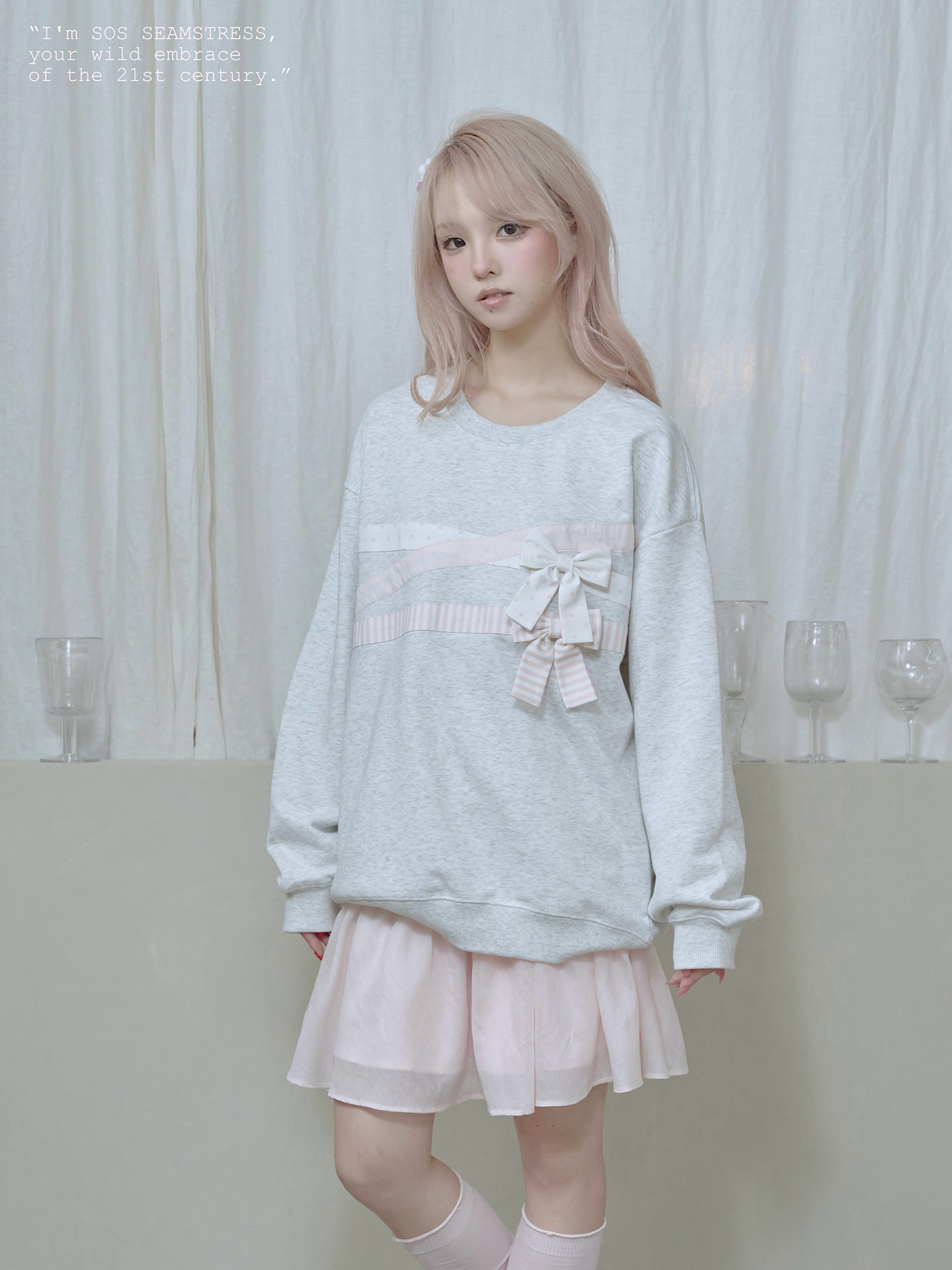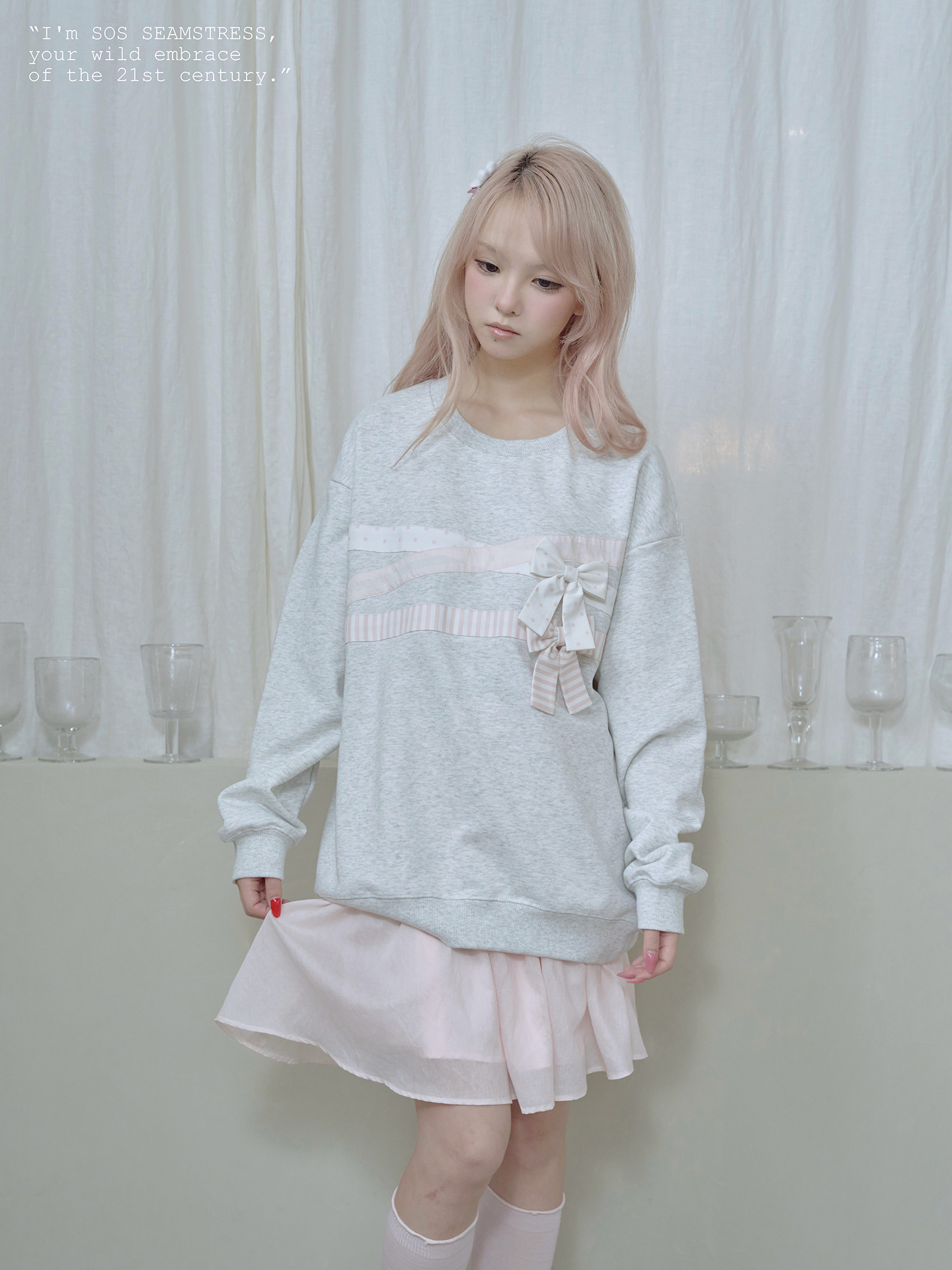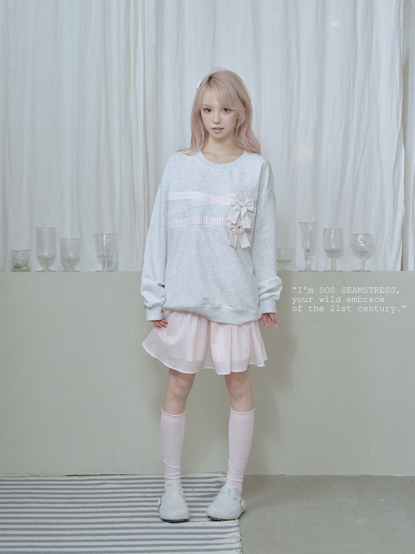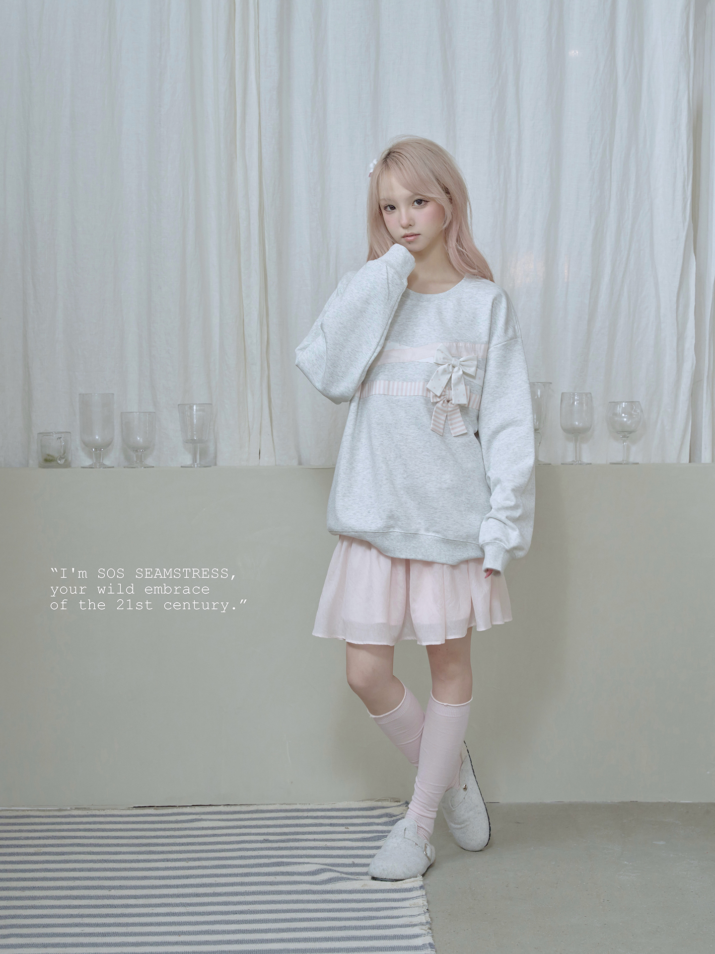 SOS SEAMSTRESS纯棉蝴蝶结波点拼接条纹卫衣宽松圆领套头长袖上衣 [Original Page Link]