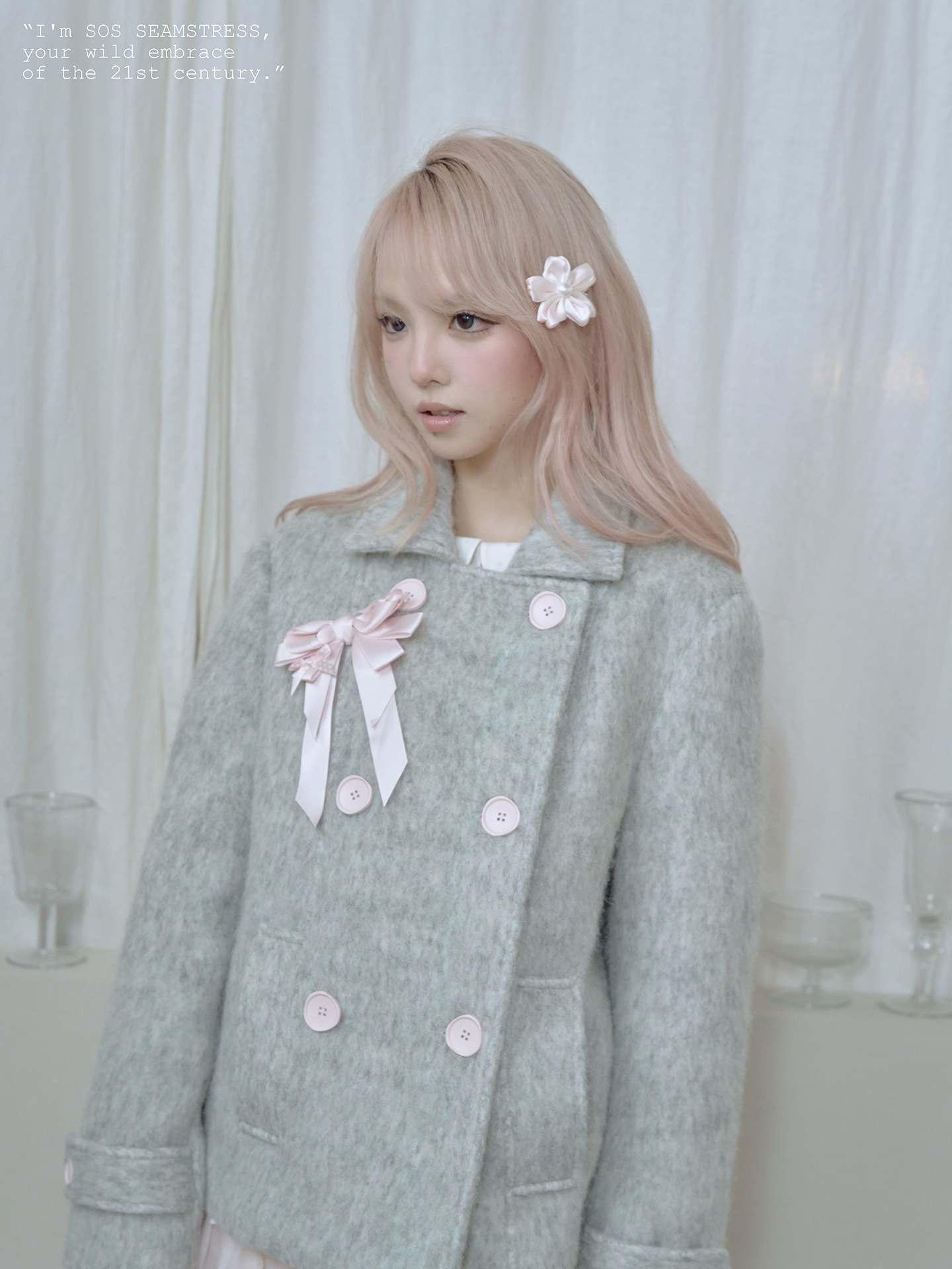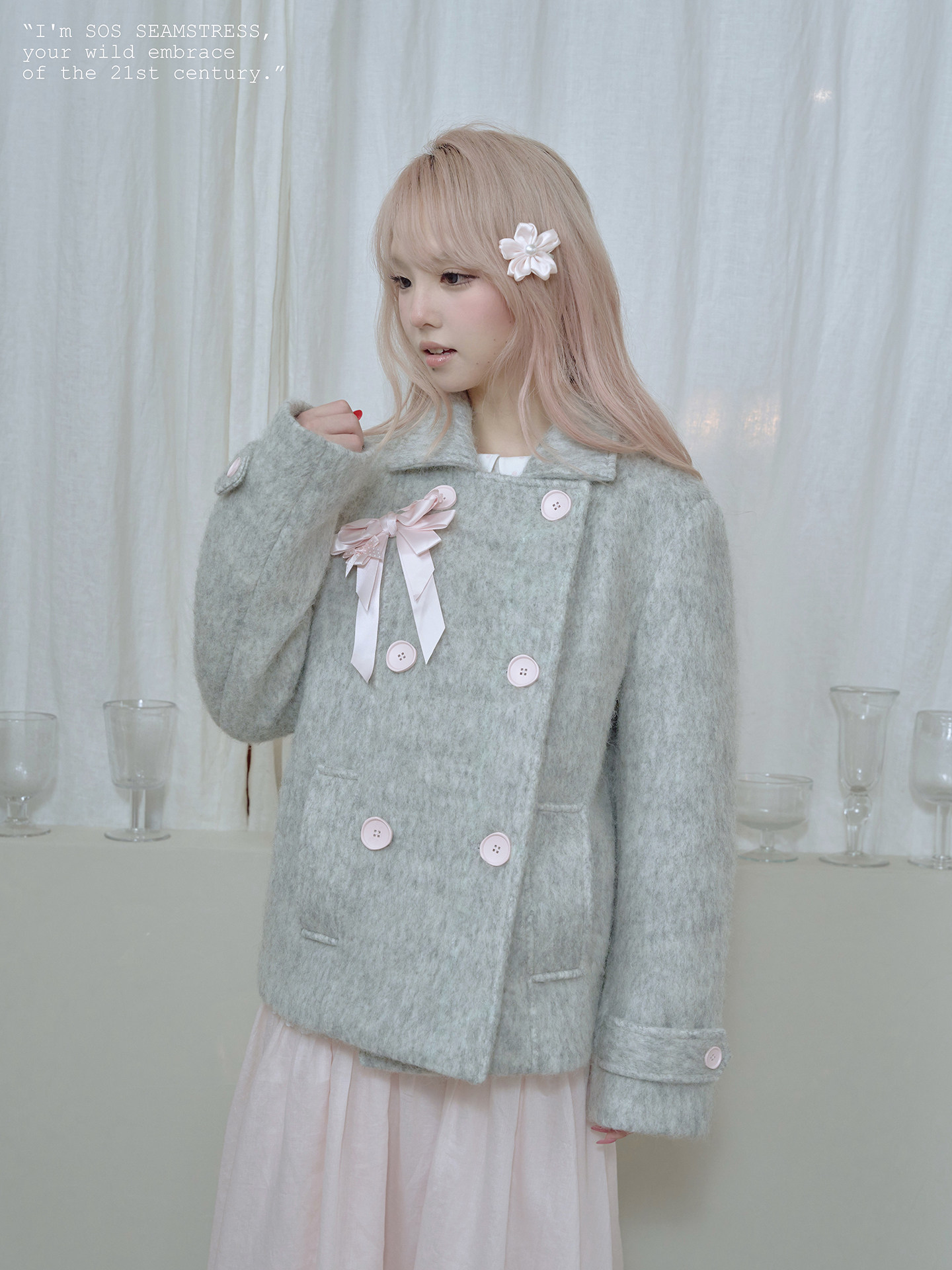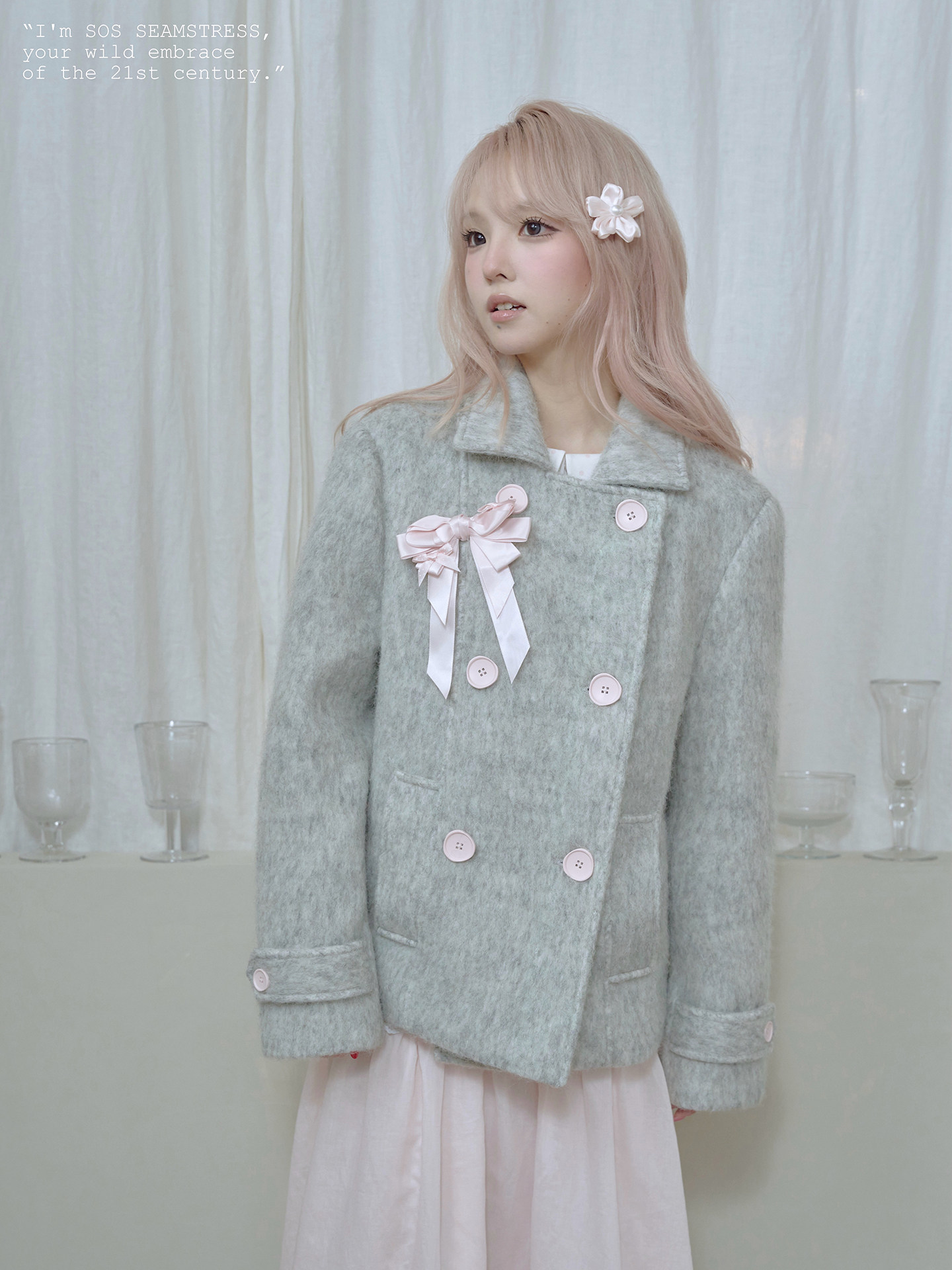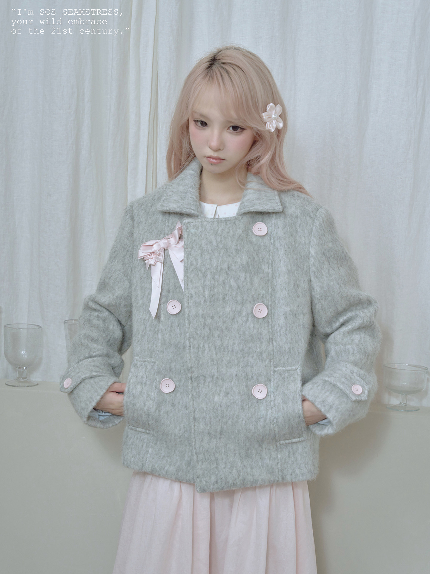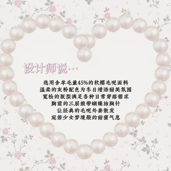 SOS SEAMSTRESS波点蝴蝶结装饰浅灰色水波纹毛呢大衣短外套双排扣 [Original Page Link]