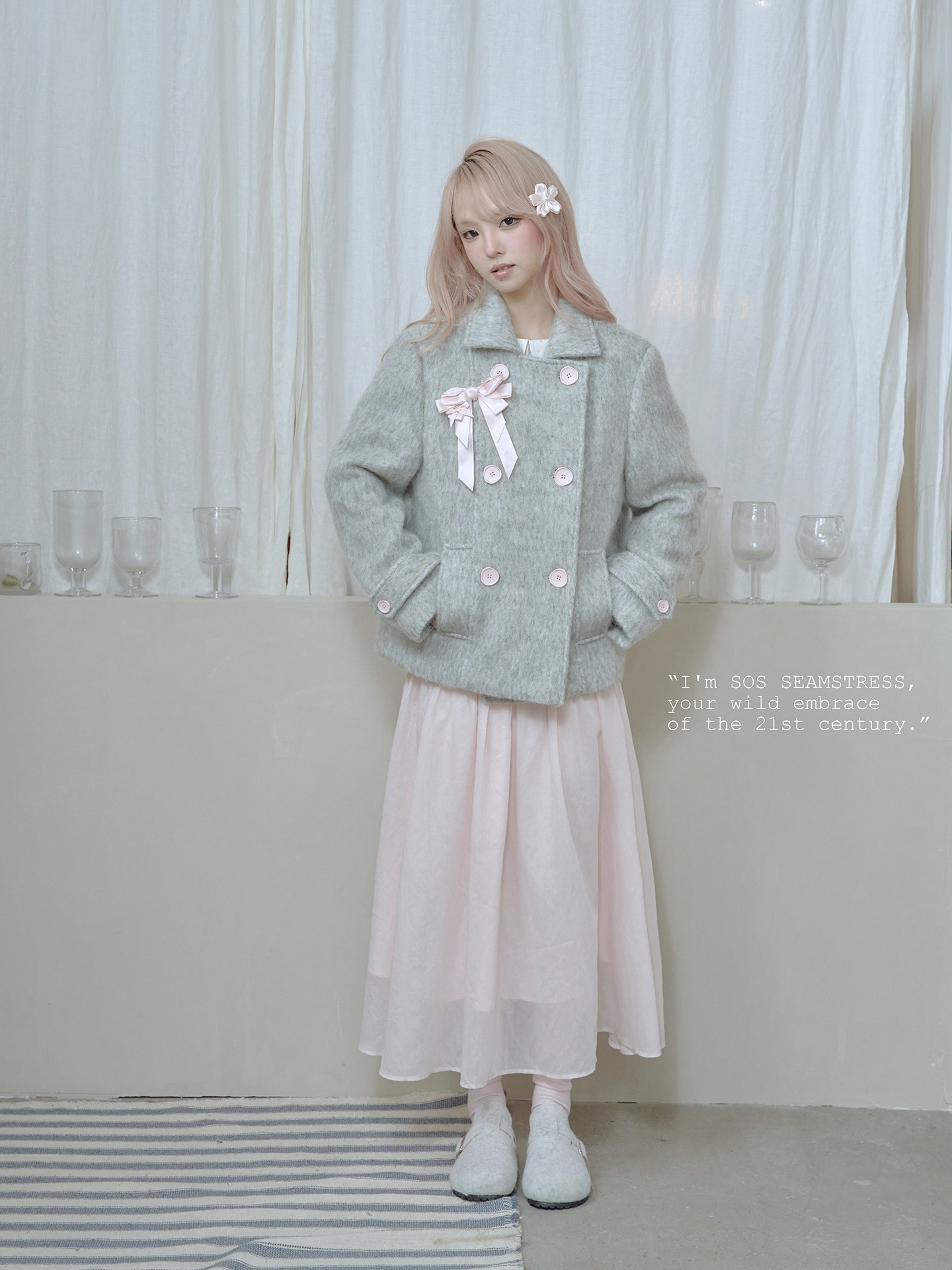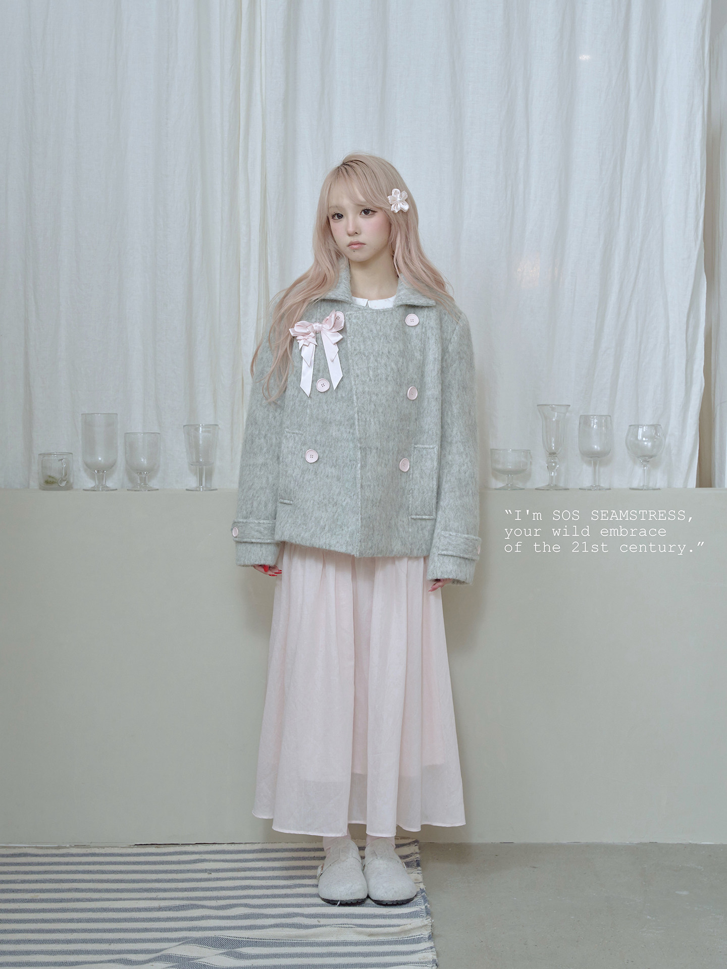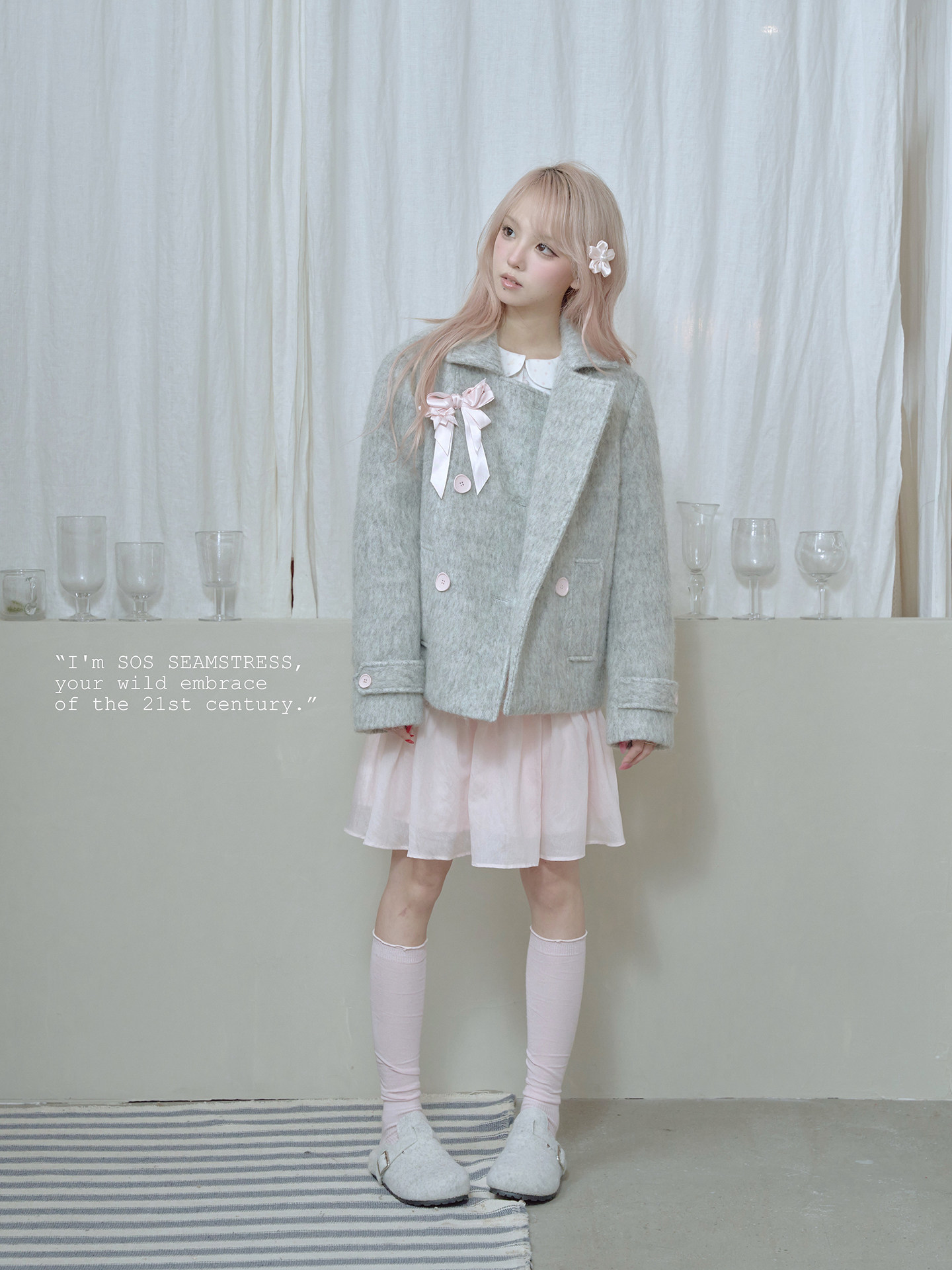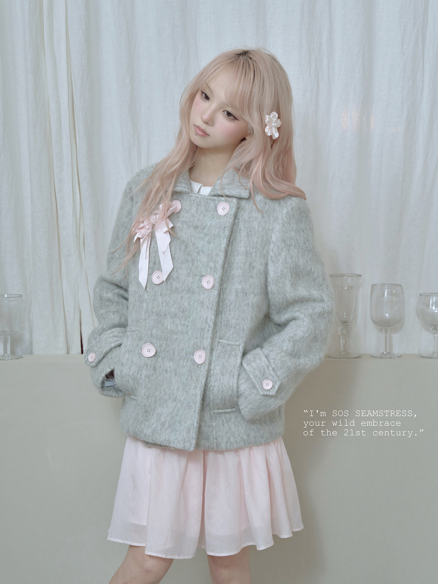 SOS SEAMSTRESS波点蝴蝶结装饰浅灰色水波纹毛呢大衣短外套双排扣 [Original Page Link]