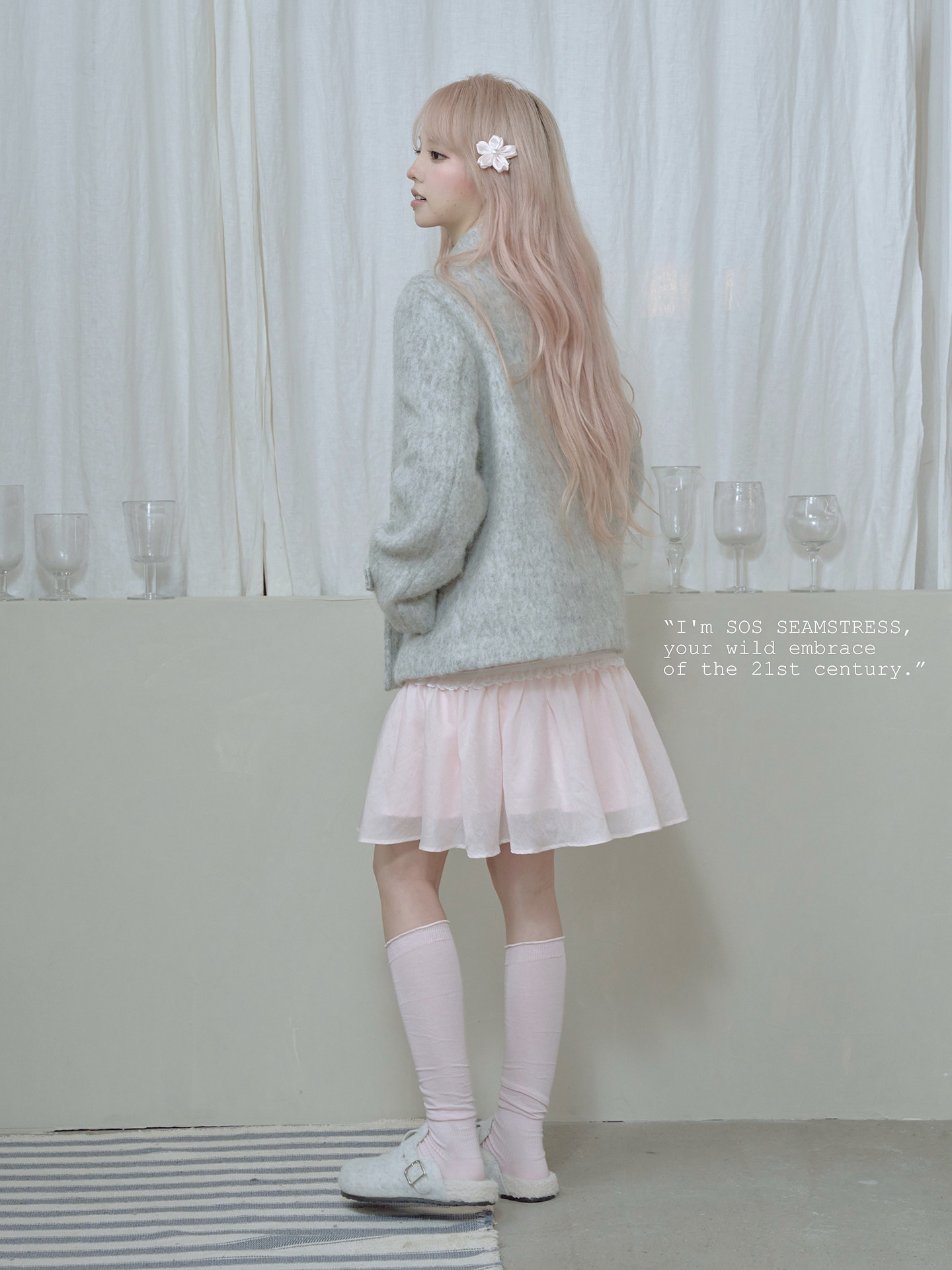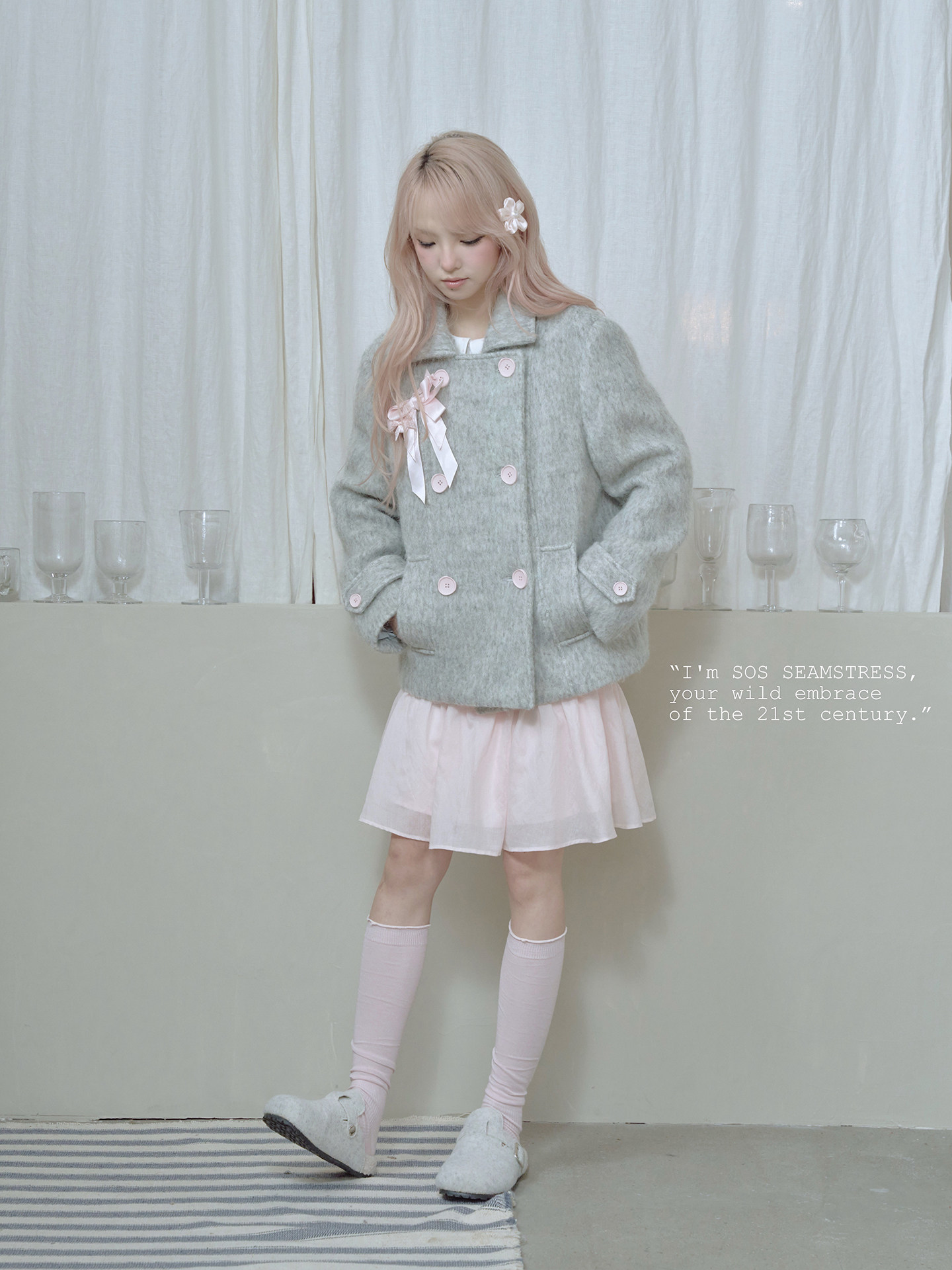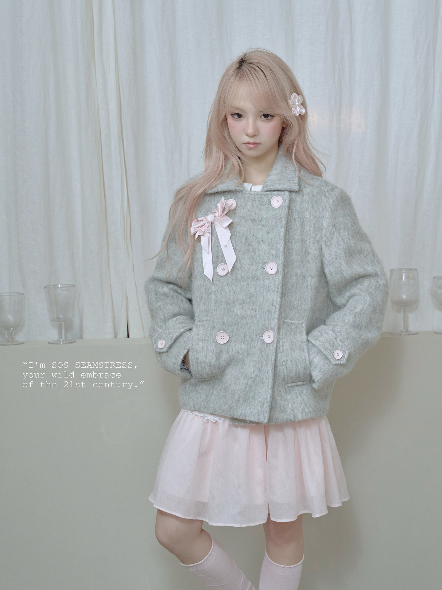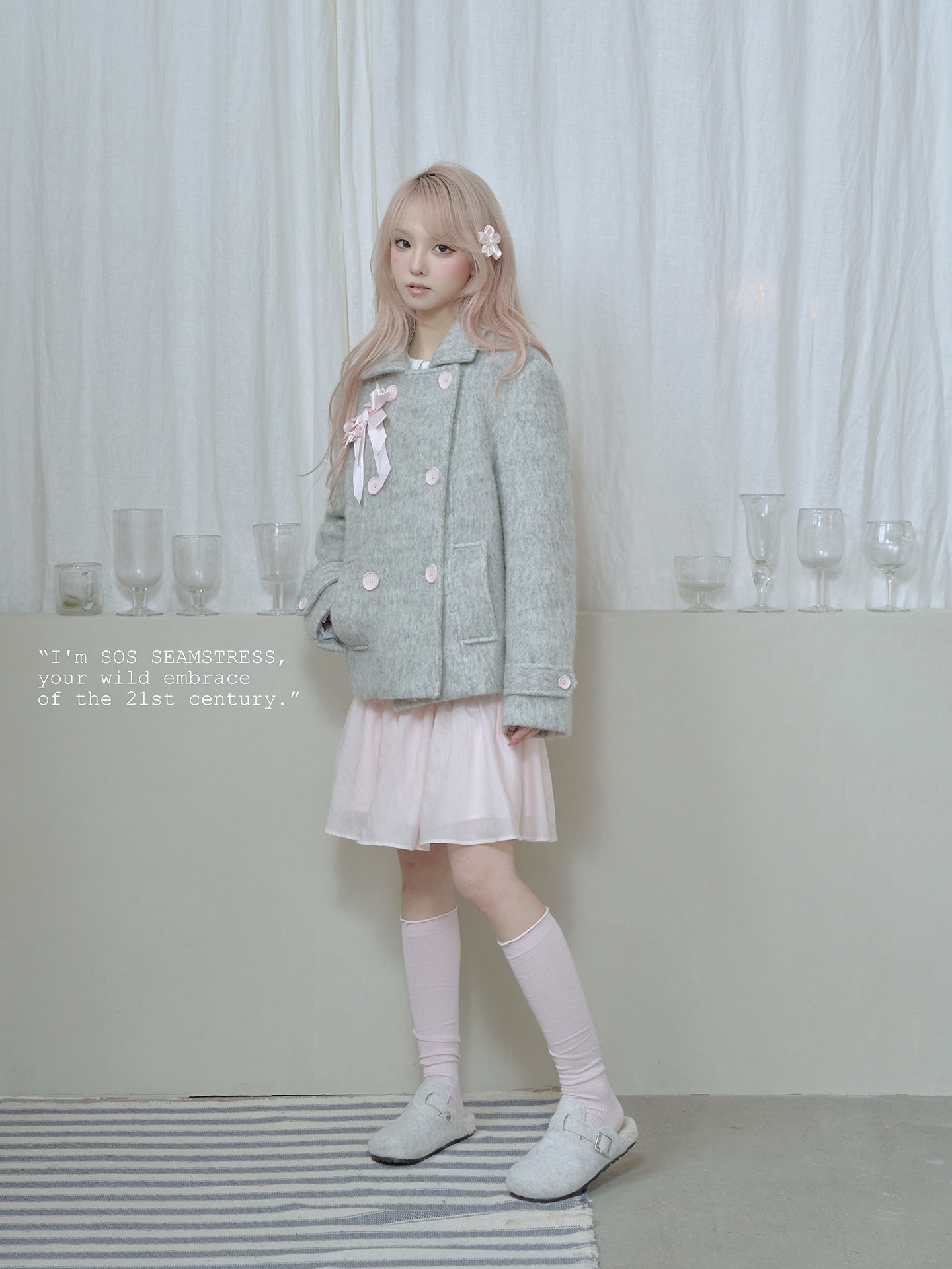 SOS SEAMSTRESS波点蝴蝶结装饰浅灰色水波纹毛呢大衣短外套双排扣 [Original Page Link]