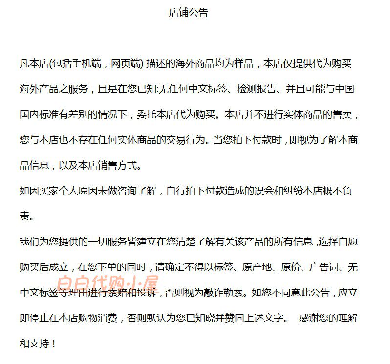 直发客户如果怕被海关扣需要剪吊牌(价格部分)的请告之客服,客服会在发货单上备注,我们发货时便会为您拆除吊牌。(没有和客服讲明需要剪吊牌的我们一律保留吊牌发货)。注意有些牌子本身不带吊牌(价格部分如onespo)的,请千万不要因为这个来找麻烦啊。