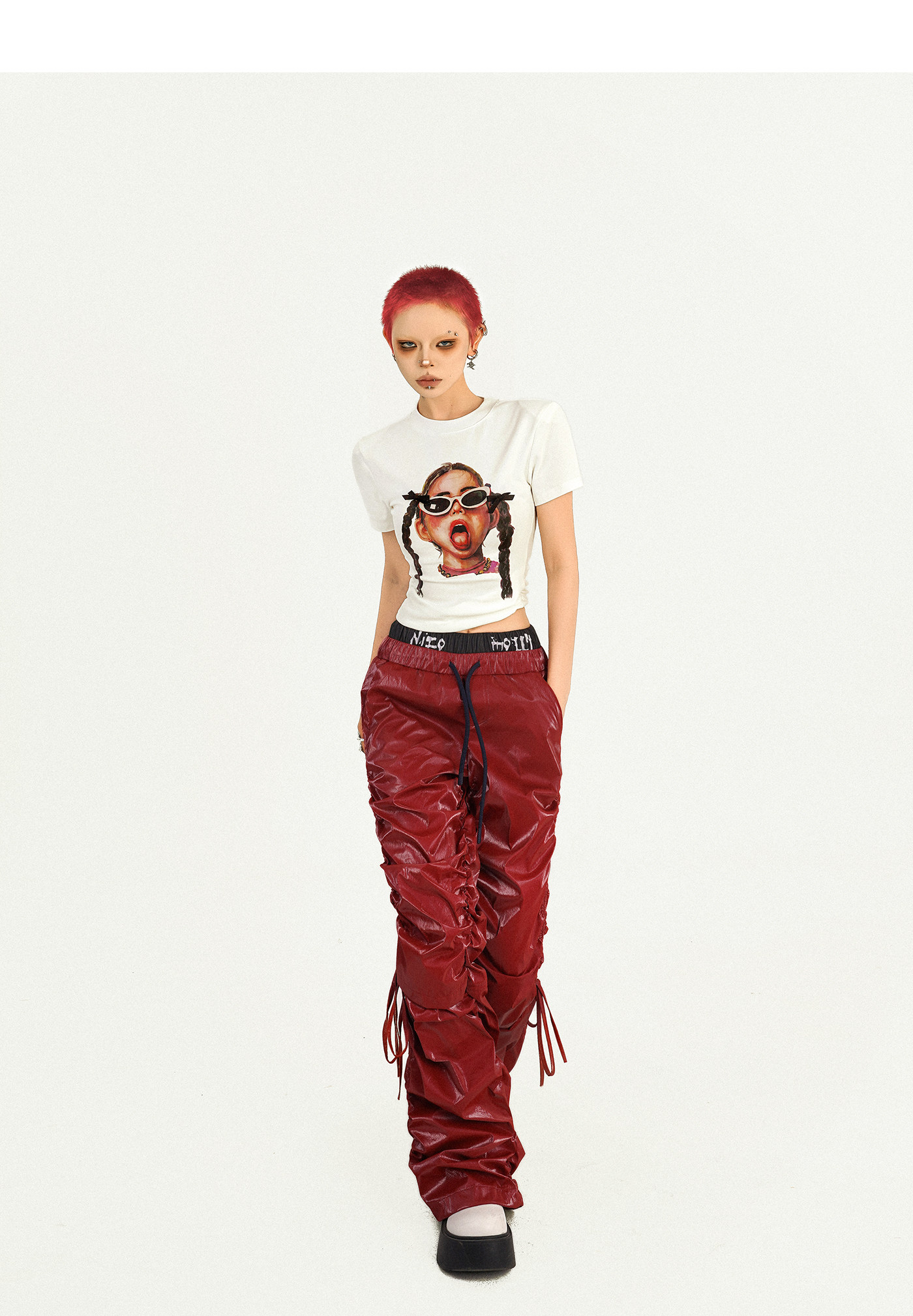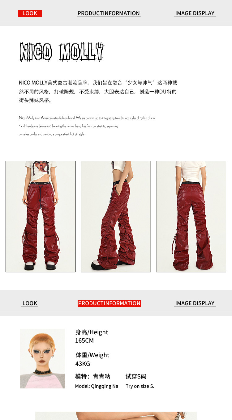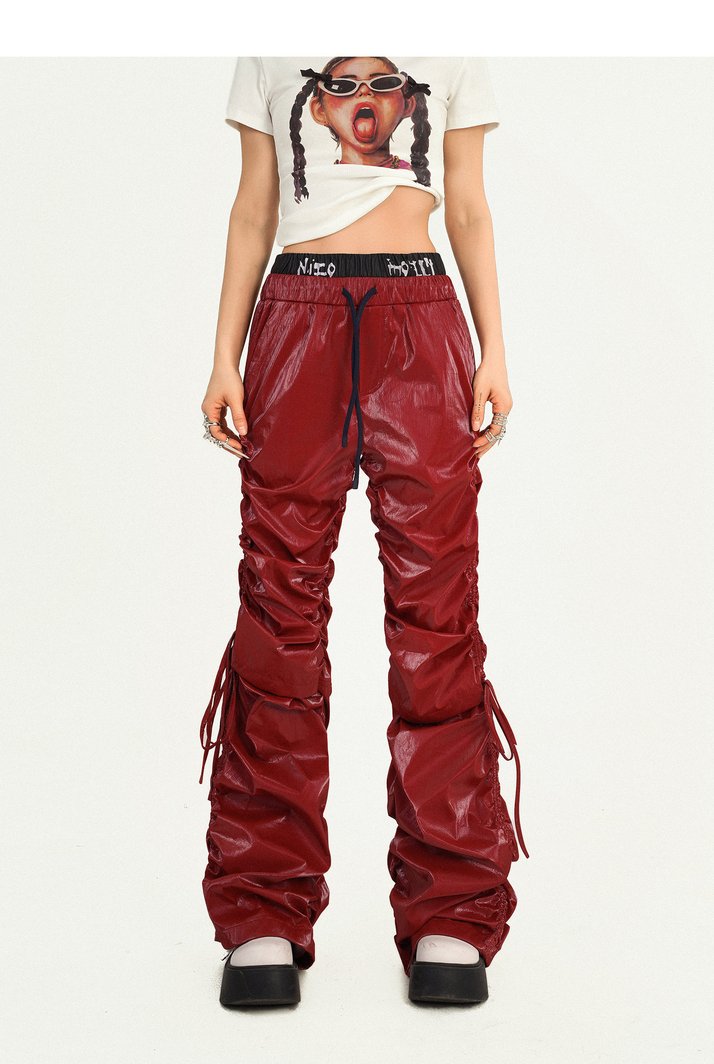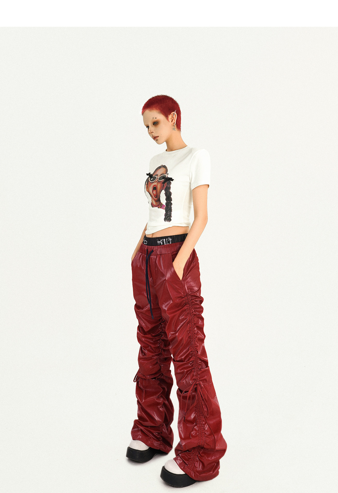 奶酷墨莉原创小众街头时尚绑绳褶皱红色皮裤女双腰头设计感长裤潮 [Original Page Link]