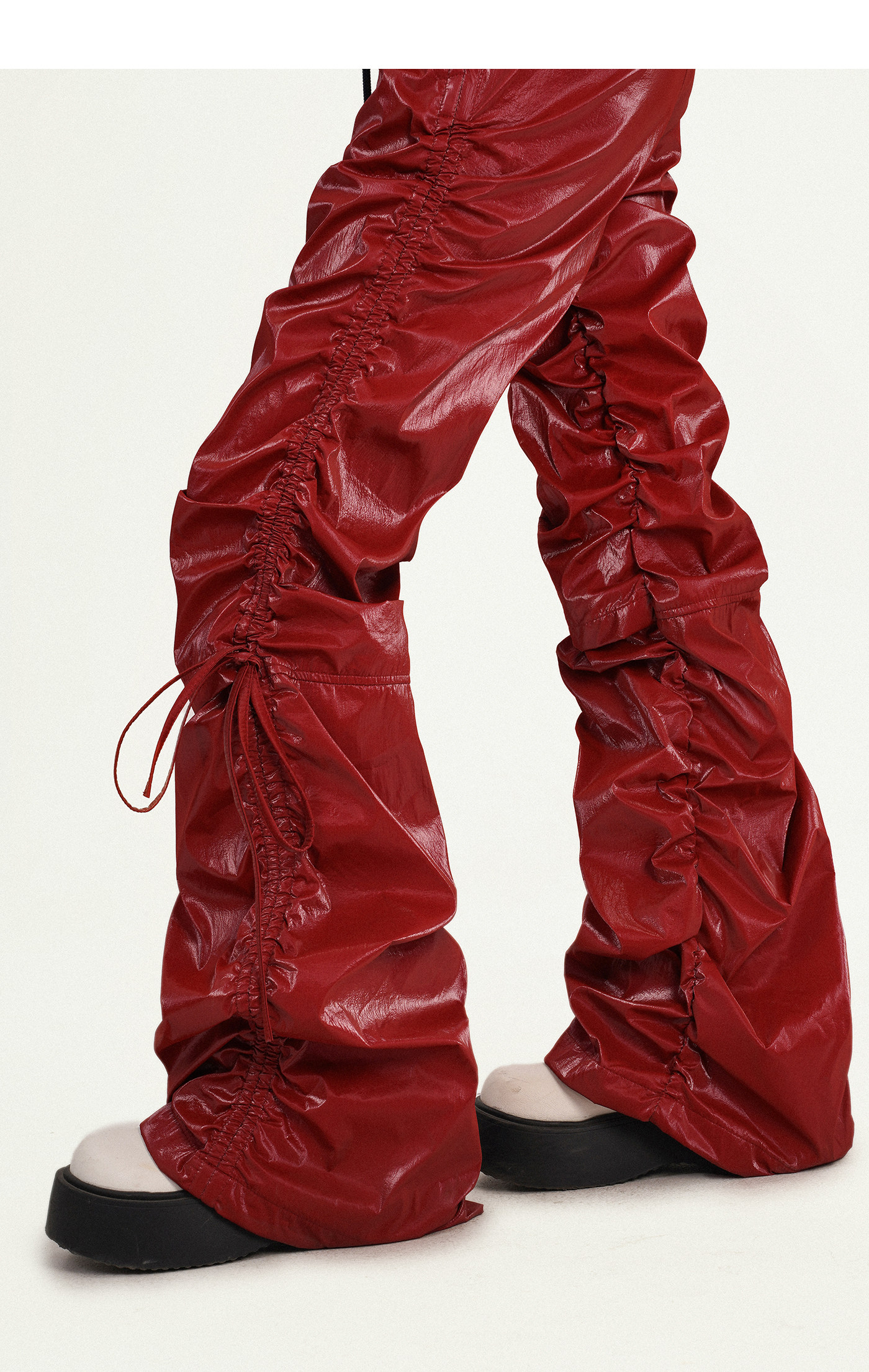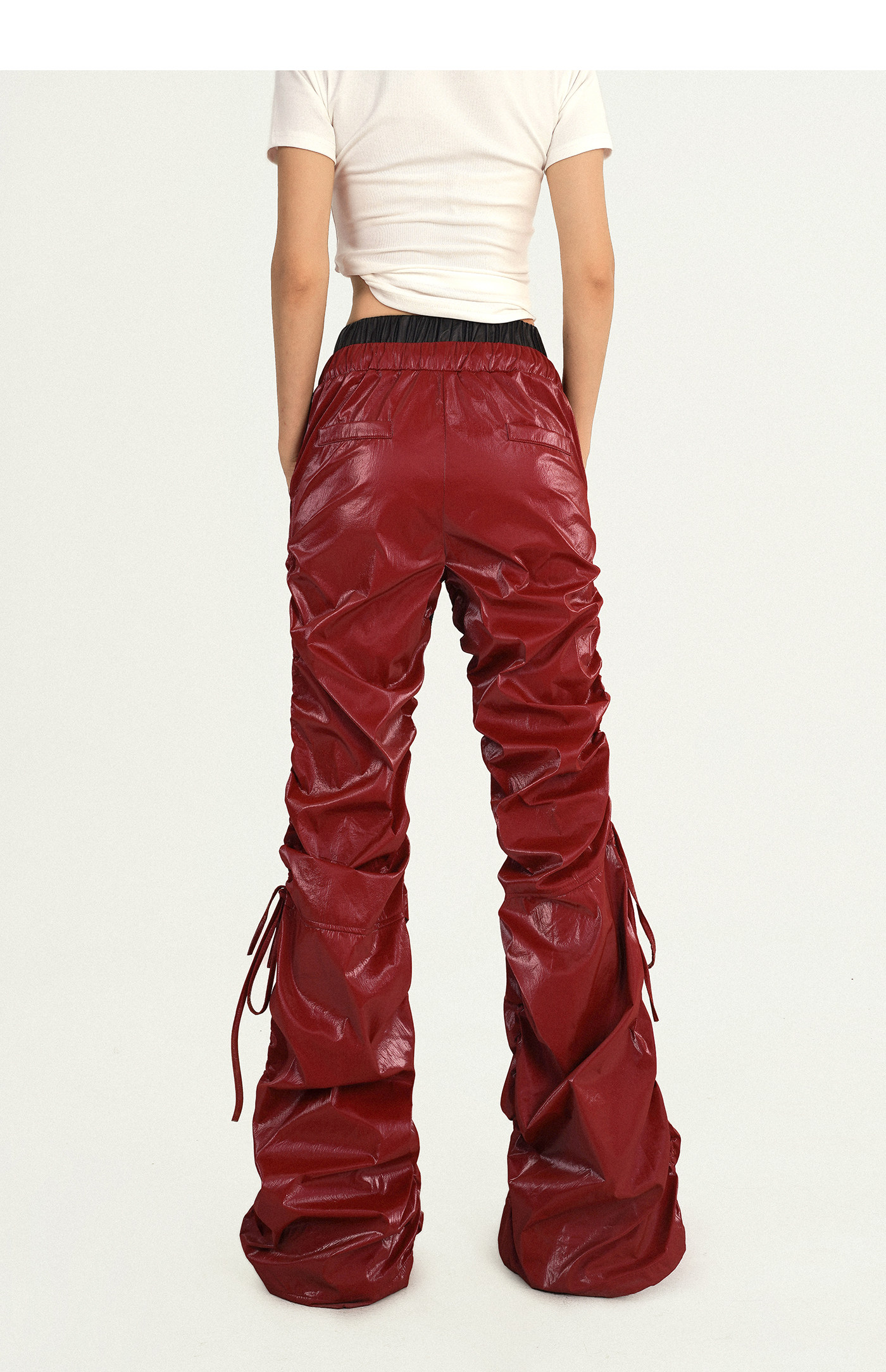 Milk Cool Molly Original Niche Street Fashion Red Leather Pants with Drawstring and Pleats, Double Waistband Design, Trendy Long Pants