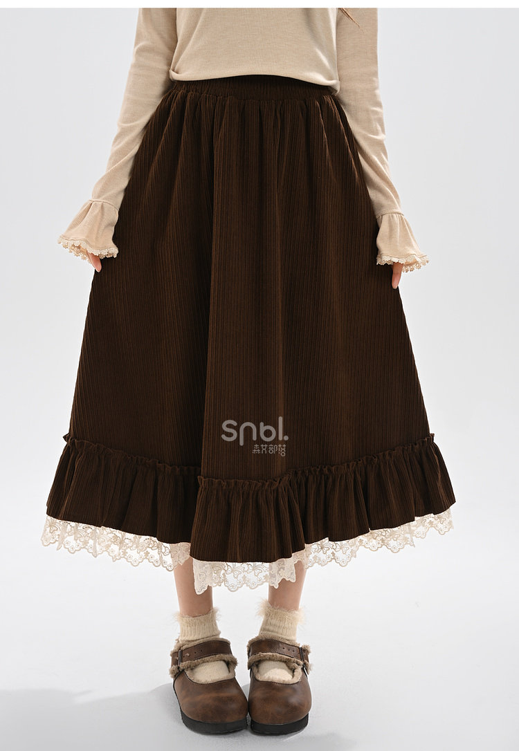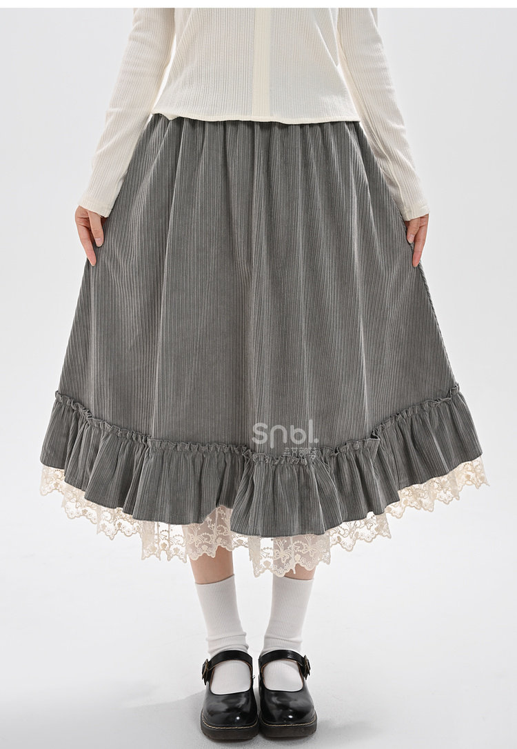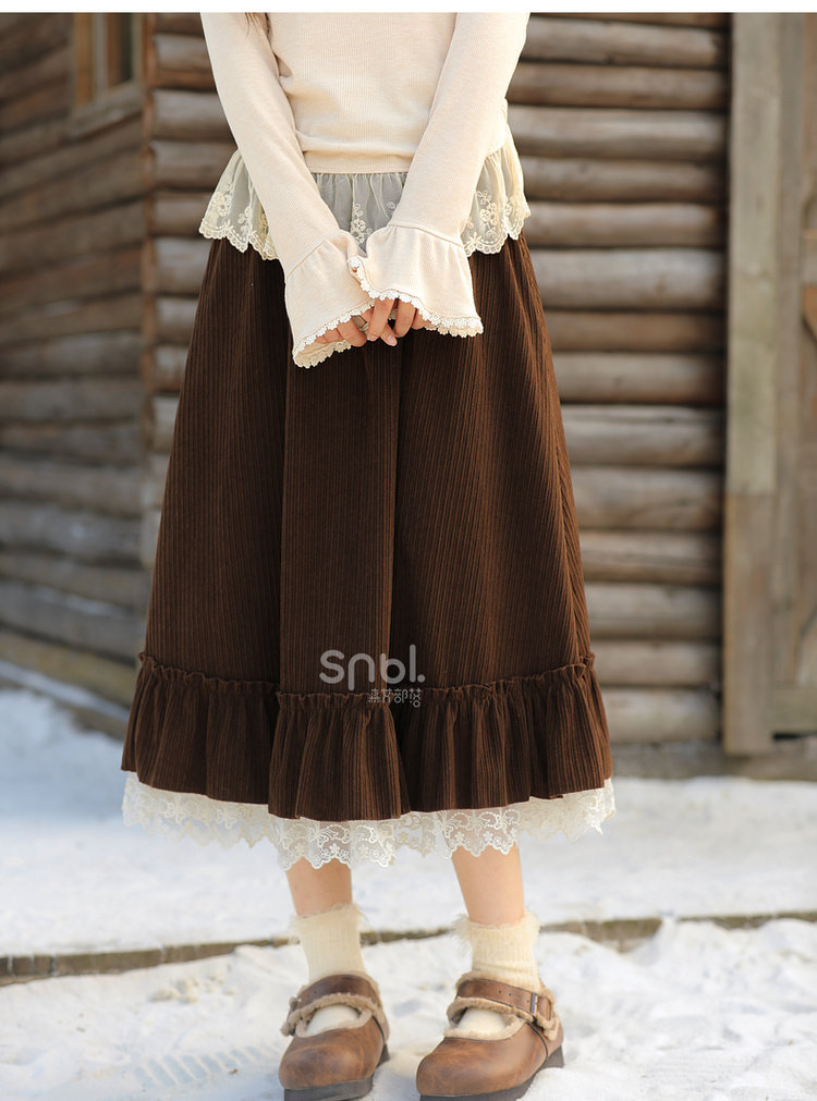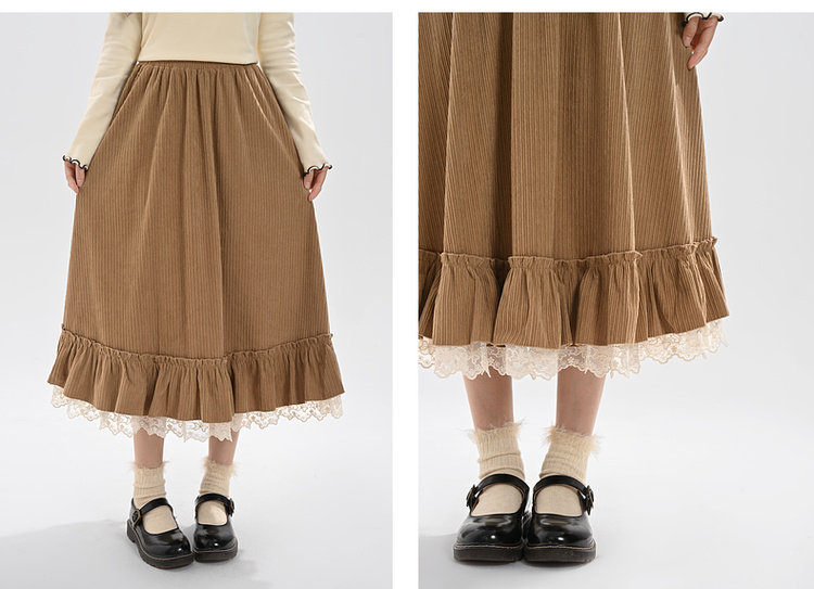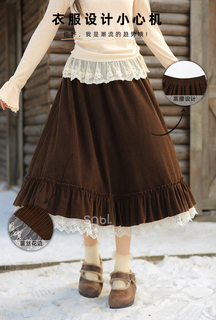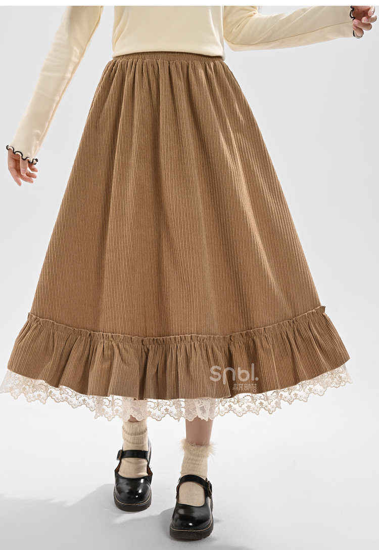 Mori Girl Tribe Style High-Waisted A-Line Skirt for Women, 2025 New Autumn Style, Lace Patchwork Design Long Skirt