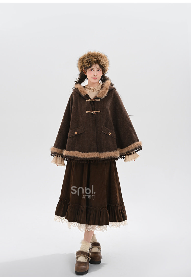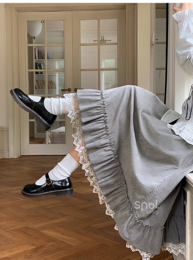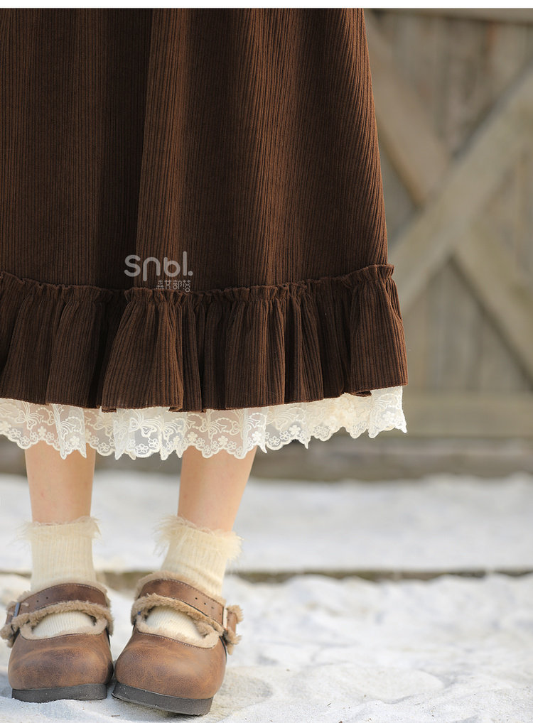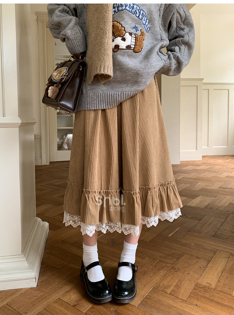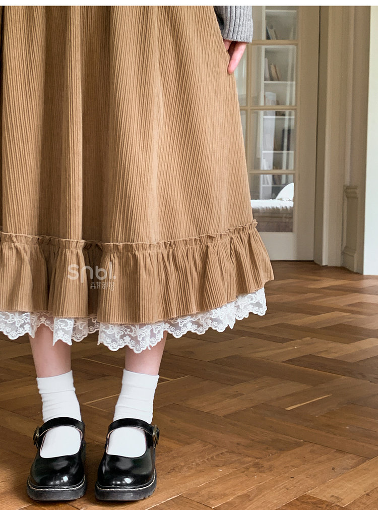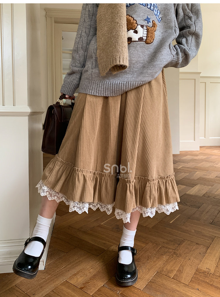 Mori Girl Tribe Style High-Waisted A-Line Skirt for Women, 2025 New Autumn Style, Lace Patchwork Design Long Skirt